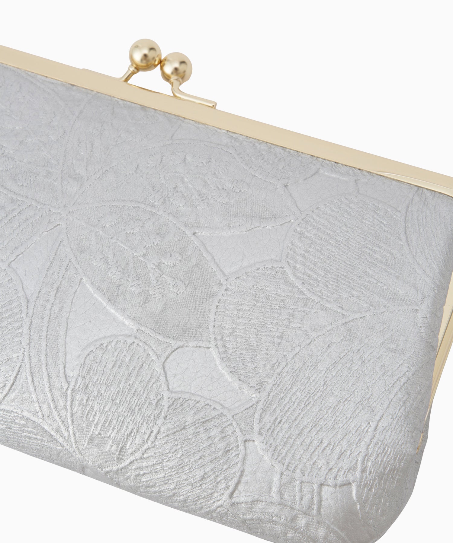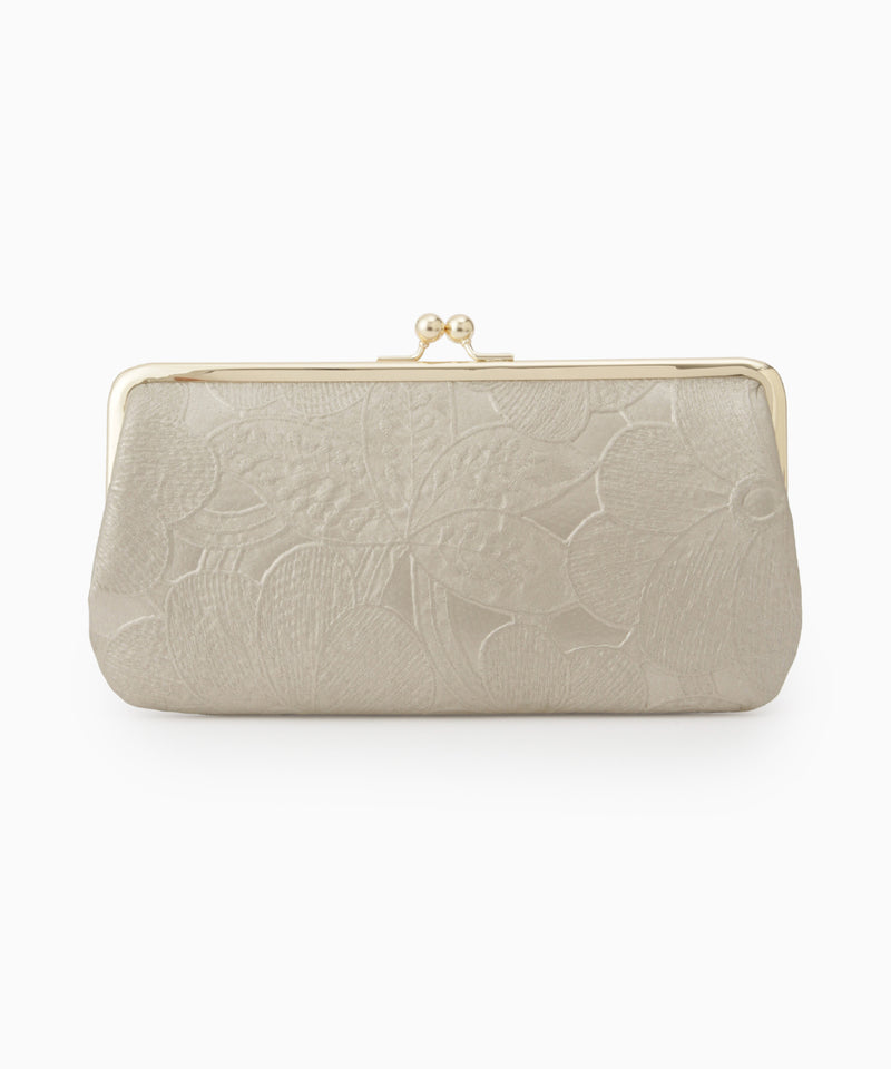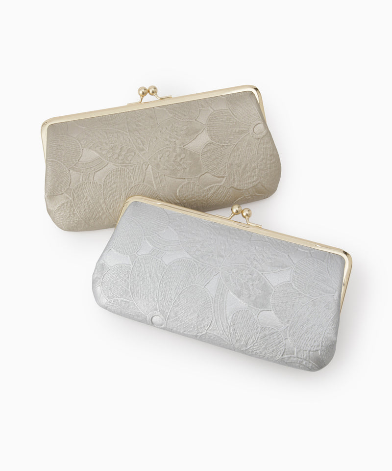 お財布は収納力を重視して選びたい方におすすめの、がま口ウォレット。ボタニカル柄を型押ししたマットな輝きのゴールドとシルバーをご用意しました。