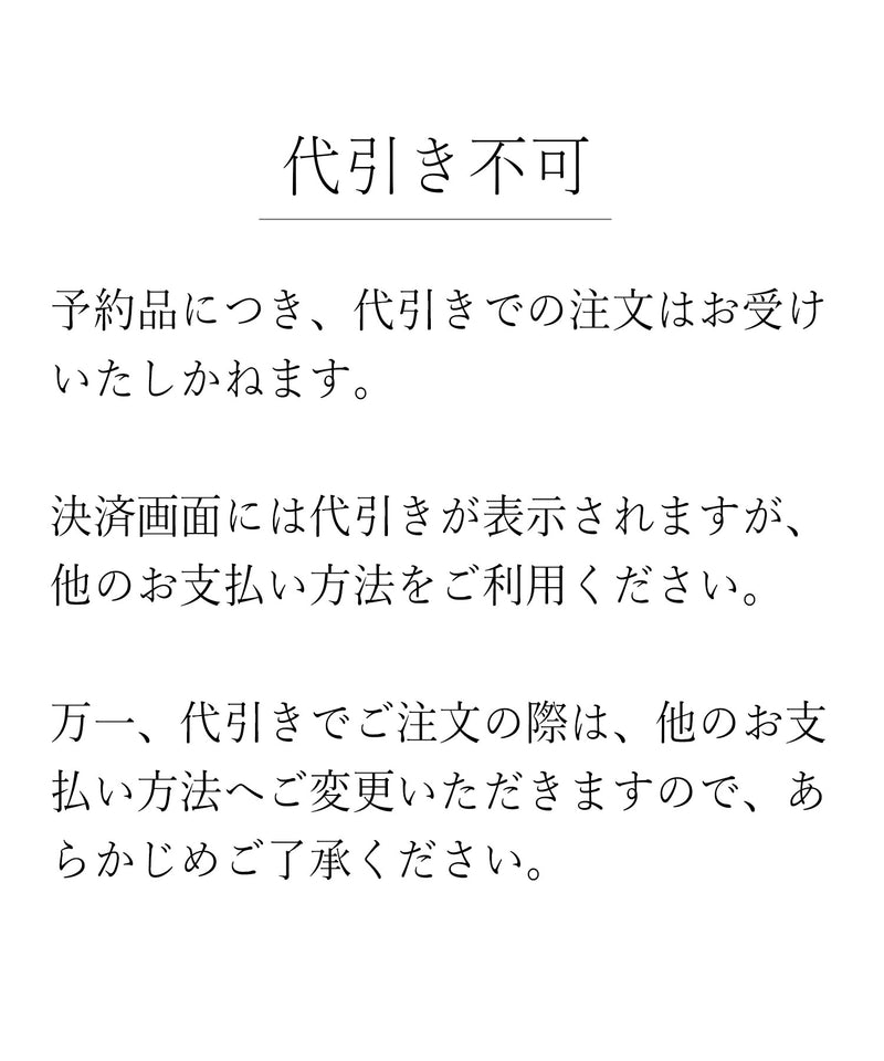 代引き不可/決済画面には代引きが表示されますが、他のお支払い方法をご利用ください。代引きでご注文の際は、メールでご案内いたしますので他のお支払い方法へご変更をお願いいたします。