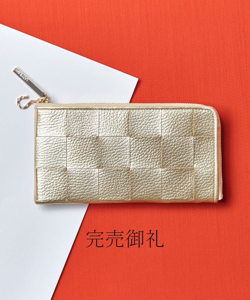 来年の最強カラーである「ゴールド&レッド」を取り入れた、ロングウォレット。金運がアップするイントレチャート(網目)や朱赤の裏地など、福を呼び込むラッキーポイントをちりばめました。