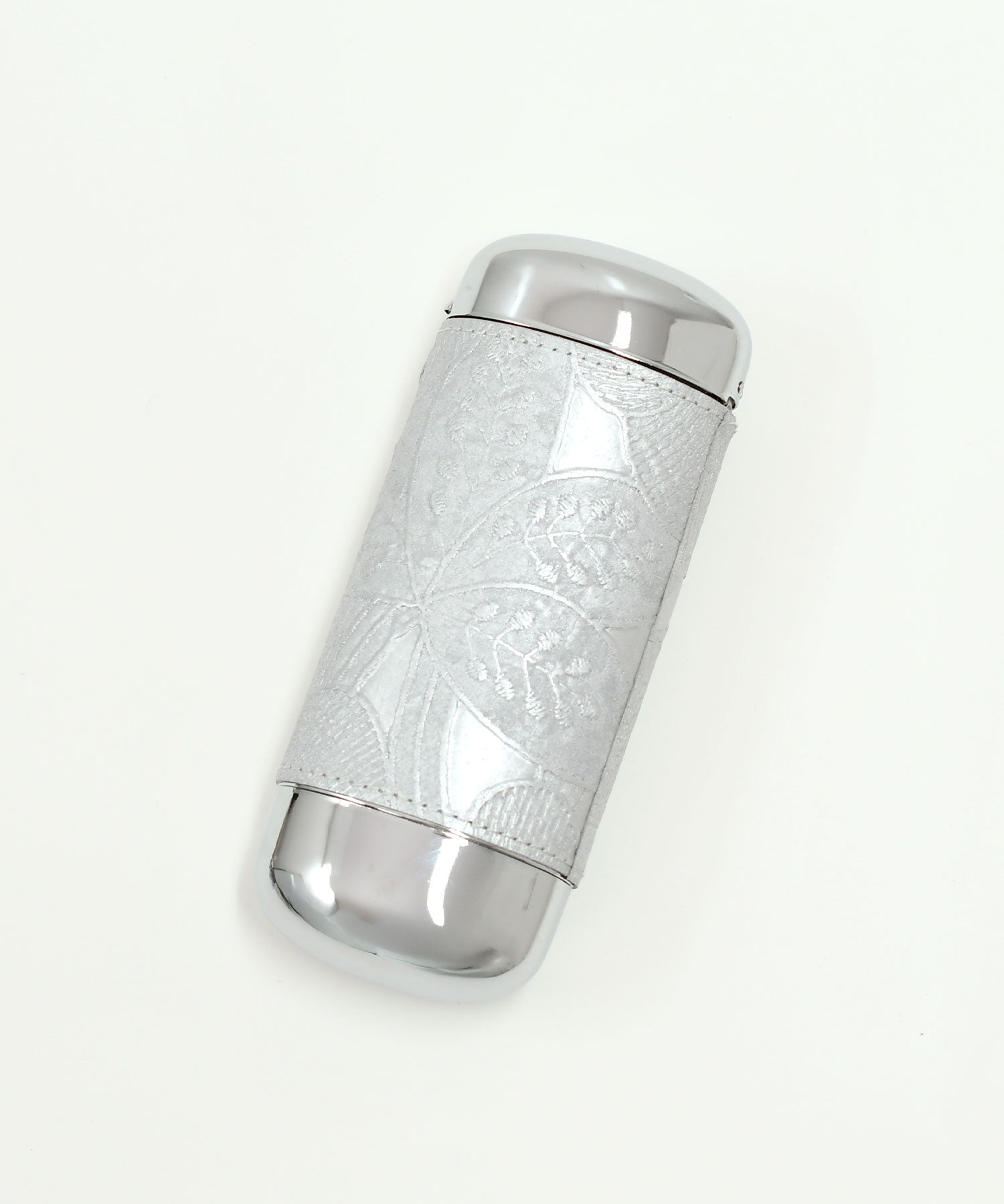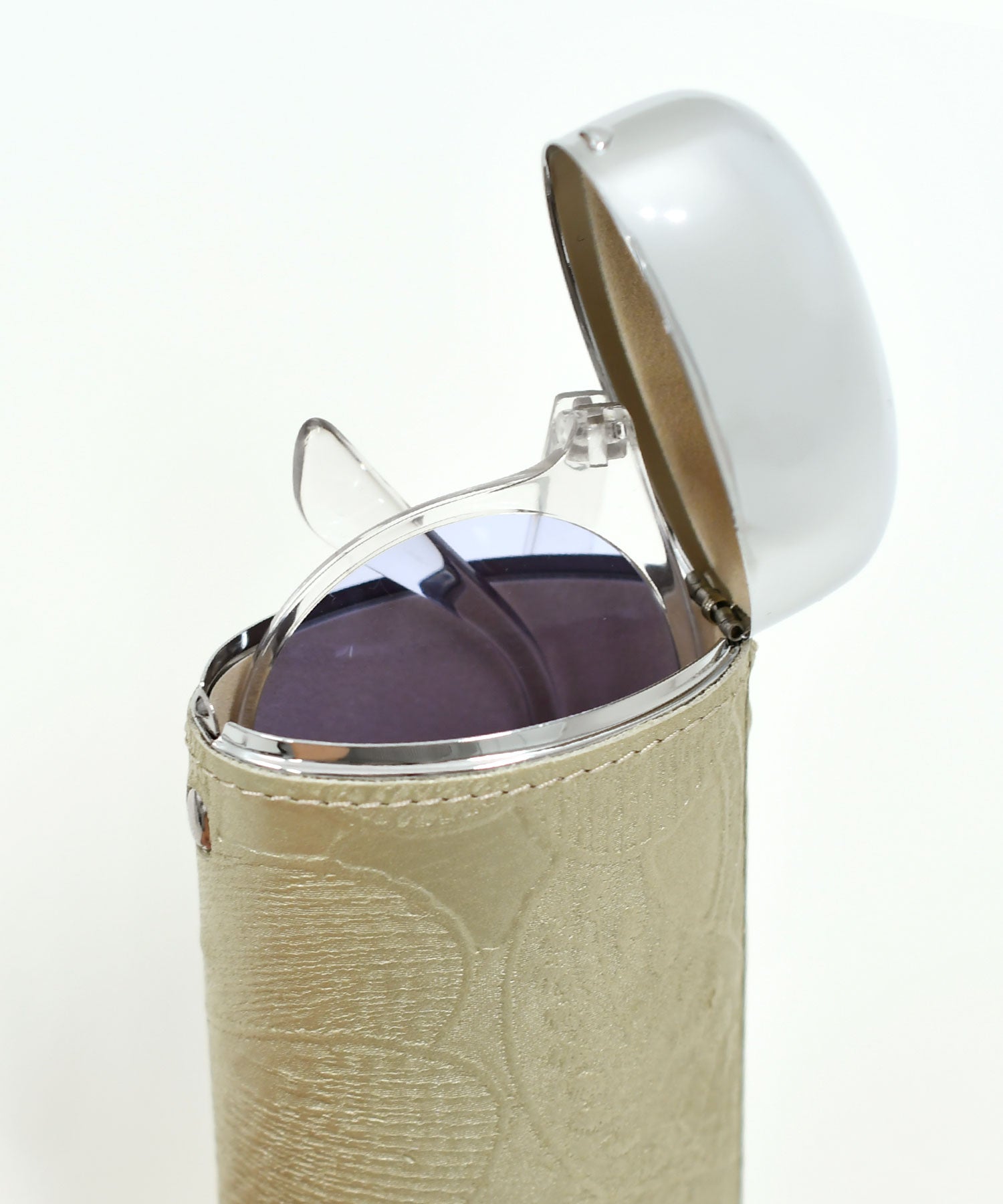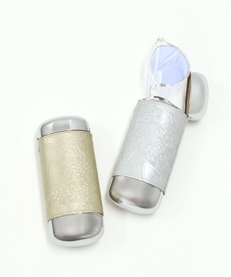ハードタイプのメガネケース。反射するメタル素材にボタニカル柄のレザーを巻いた異素材感。可愛いよりかっこいいが似合う方へのギフトにも。