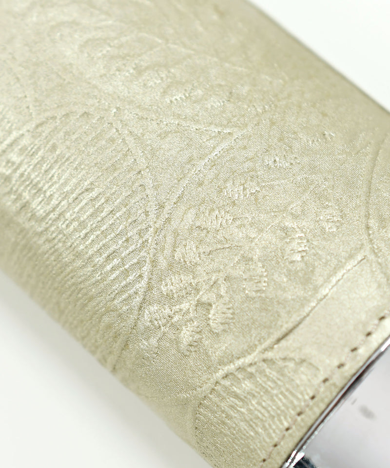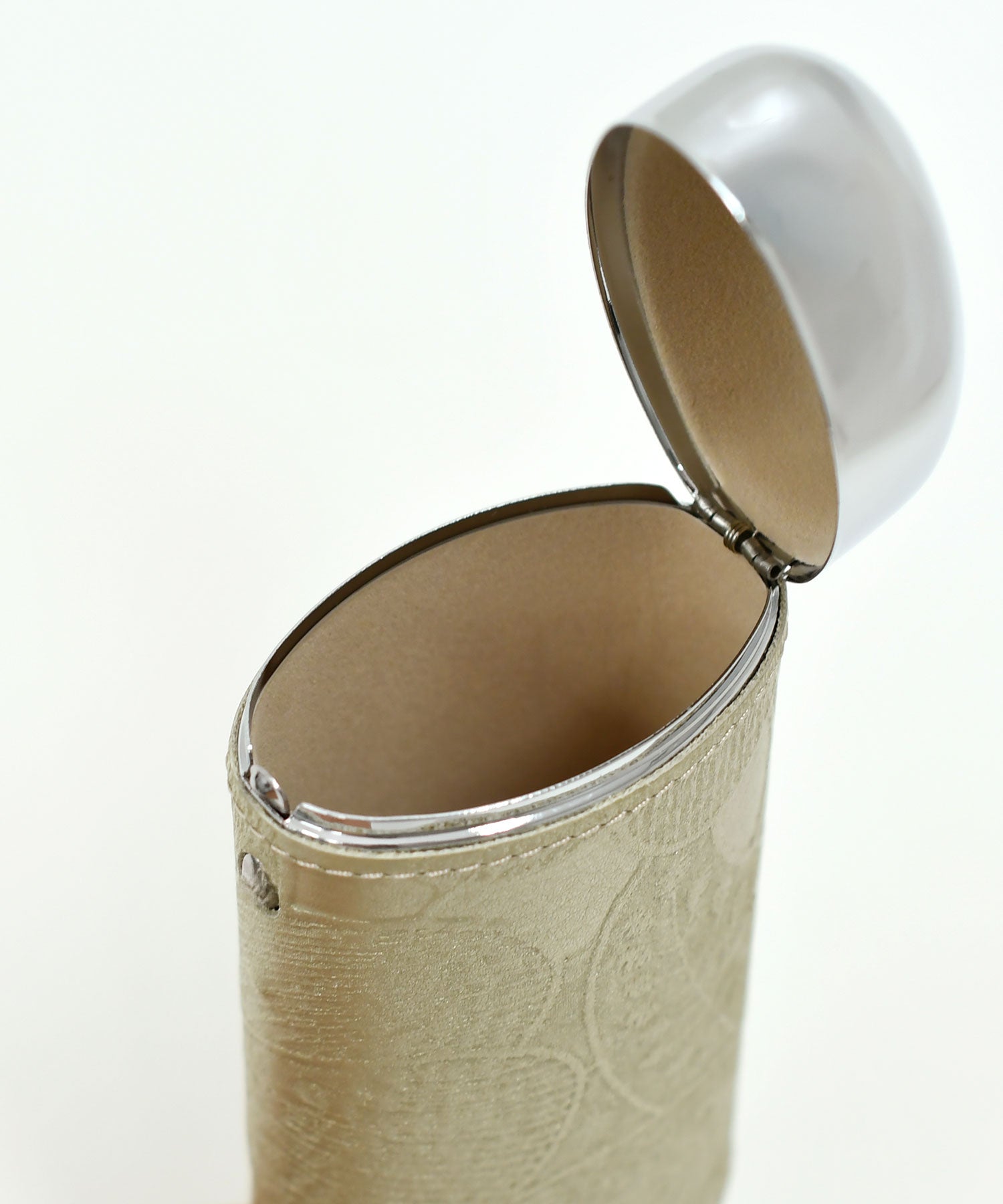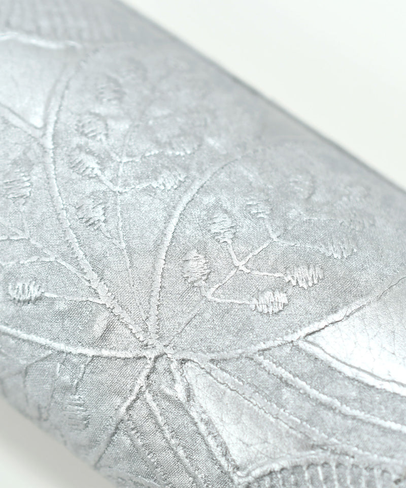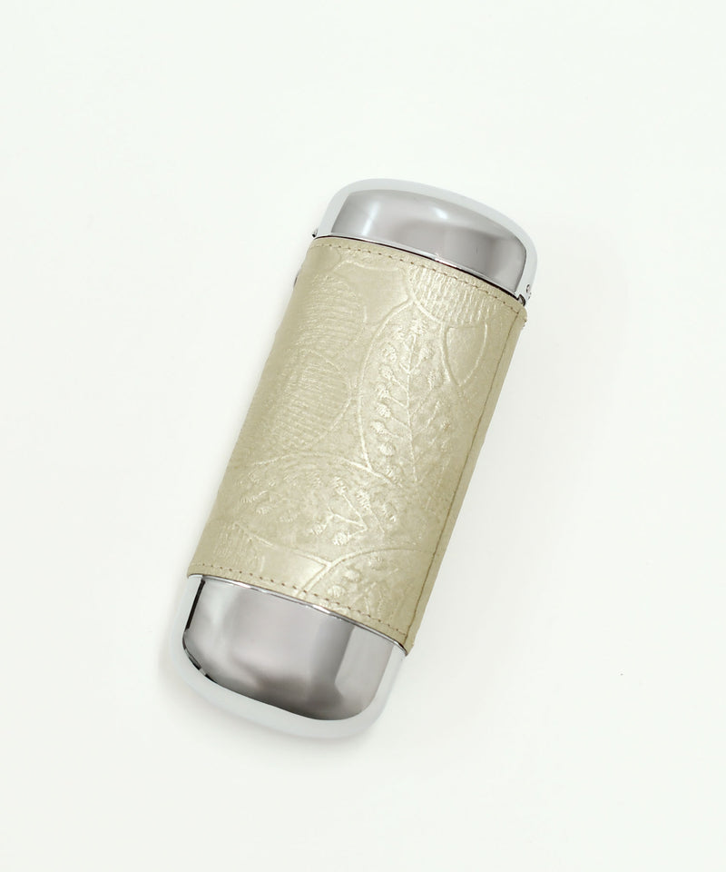 ハードタイプのメガネケース。反射するメタル素材にボタニカル柄のレザーを巻いた異素材感。可愛いよりかっこいいが似合う方へのギフトにも。