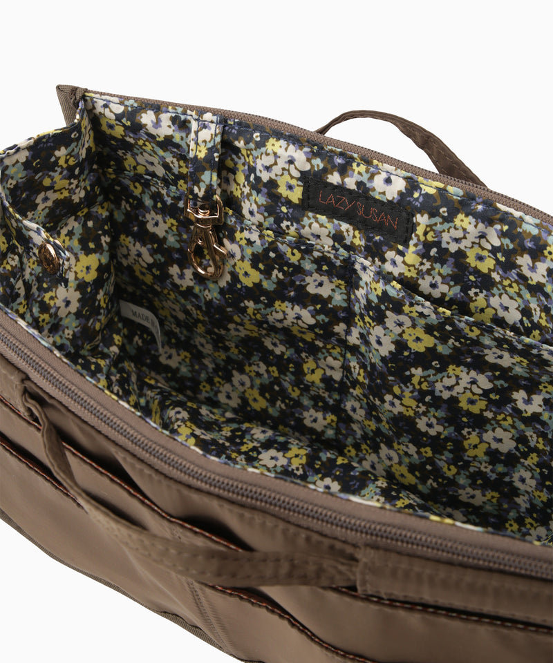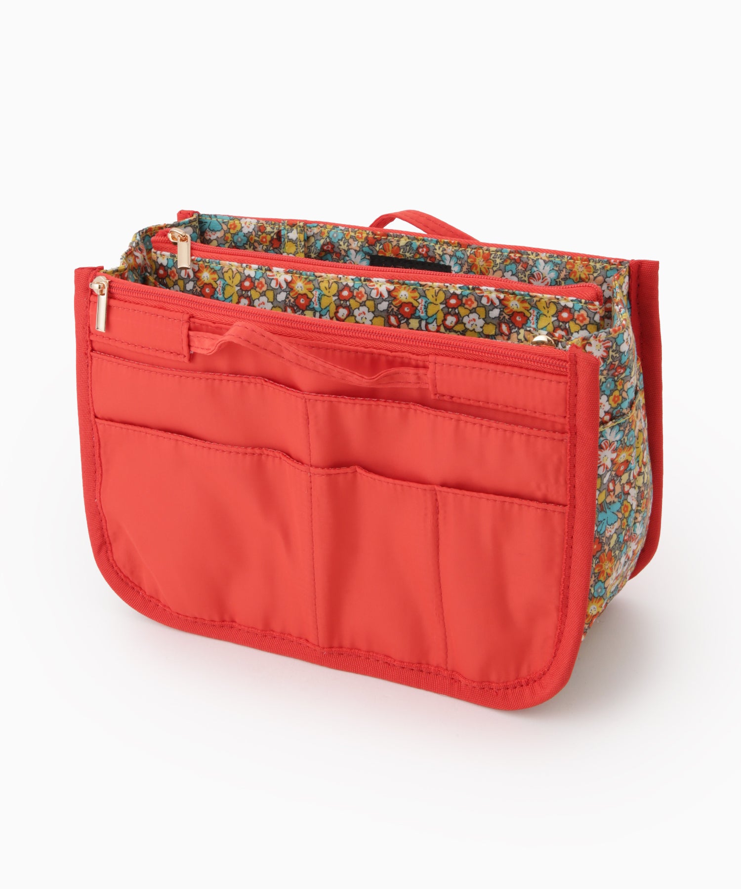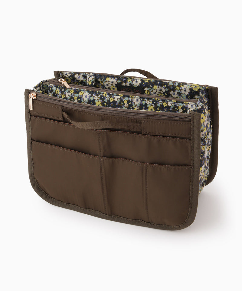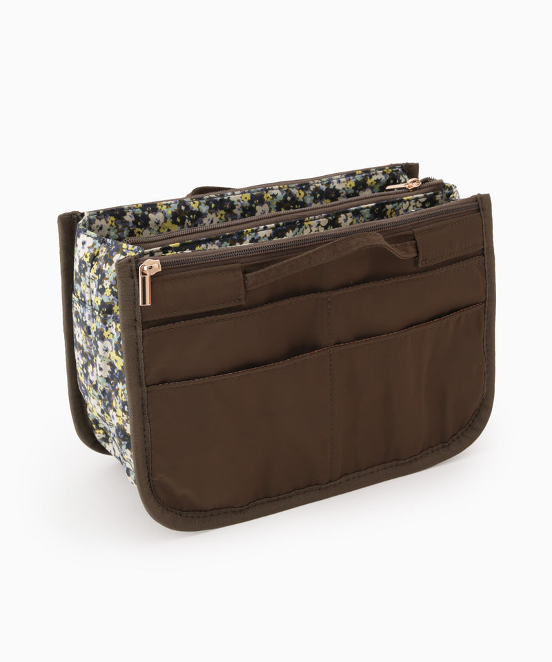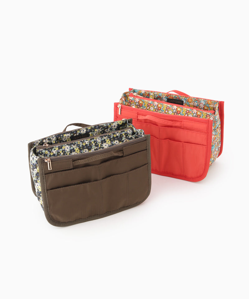収納力と仕分け力に優れた「バッグイン ミニブロッサム」。前後側面についたポケットはサイズが豊富。グロスやハンドクリーム、ウェットティッシュやペンなどすぐに取り出したい小物がきれいに収納でき、混ざりざり合いません。