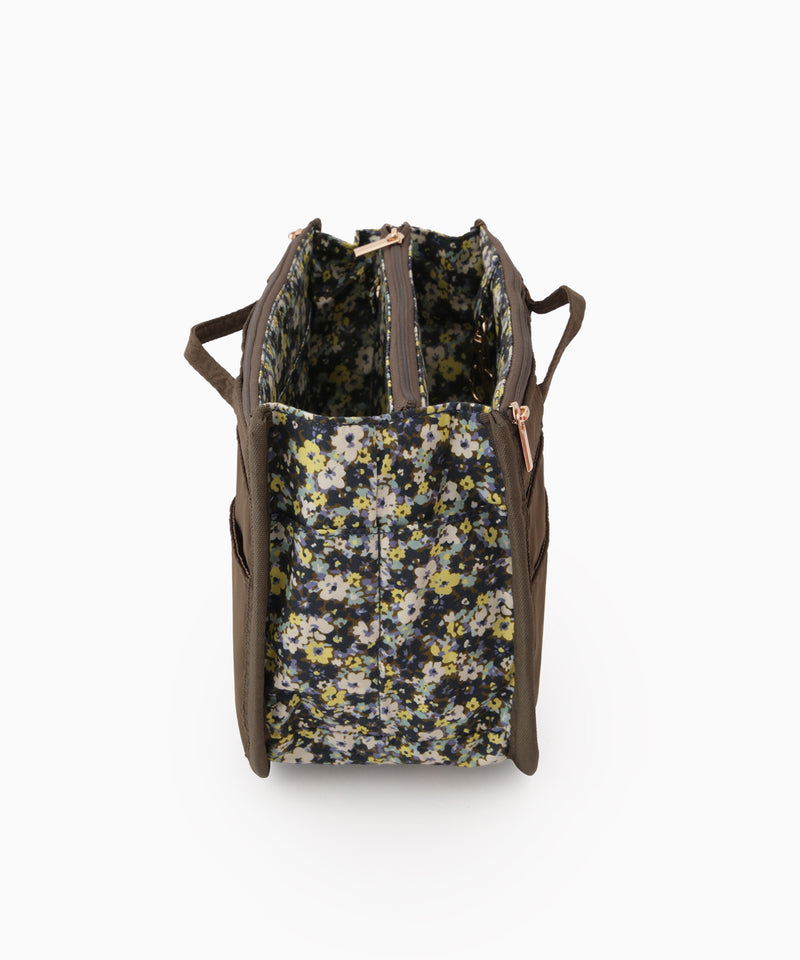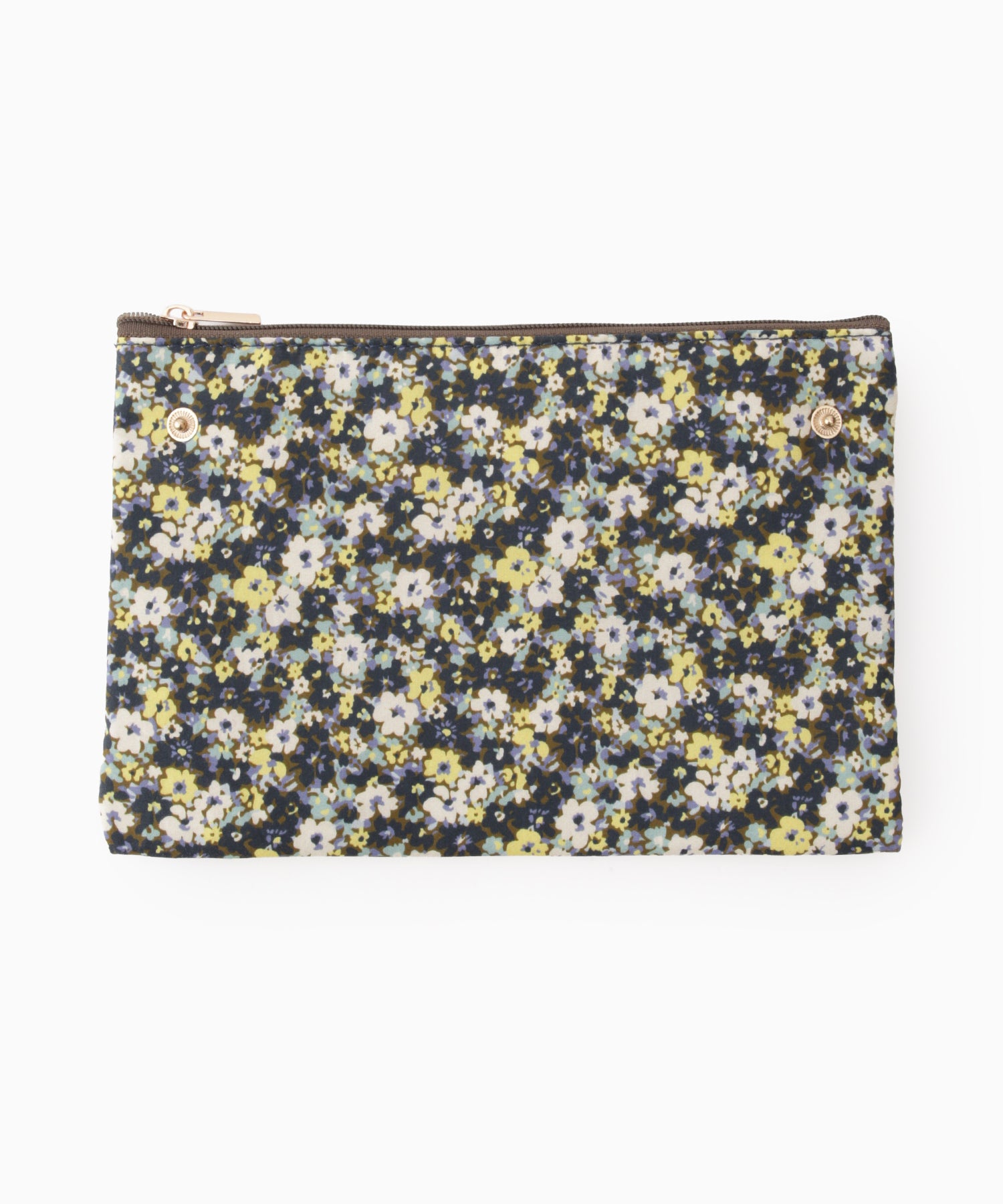 見えないように収納したい物はふちについた横幅いっぱいのファスナーポケットへ。仕切りを兼ねた取り外し可能なフラットポーチは、コスメやおやつの収納に最適。