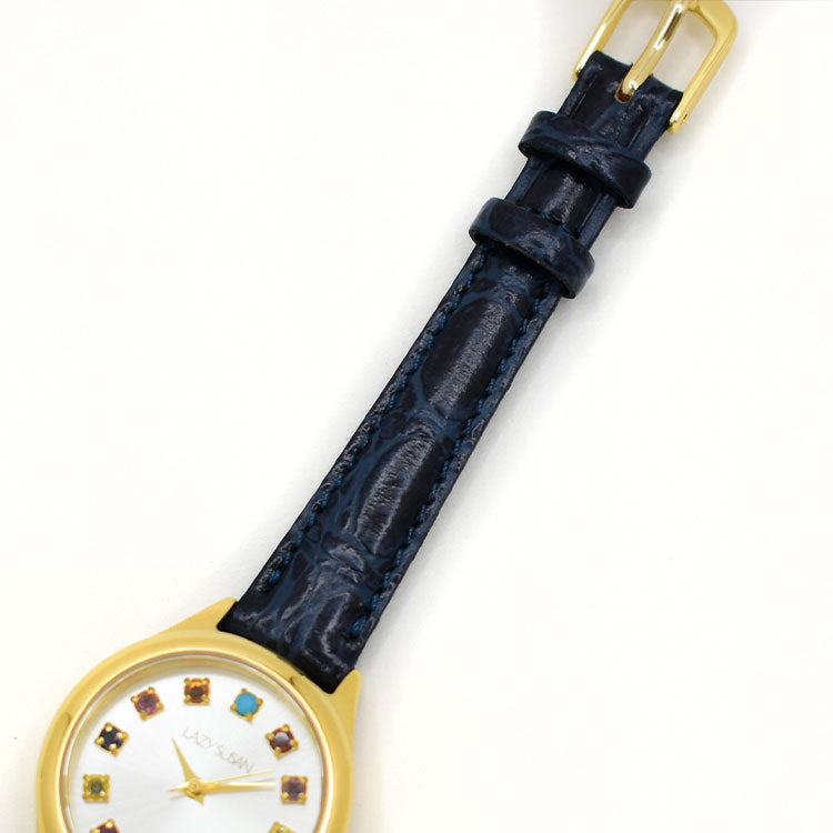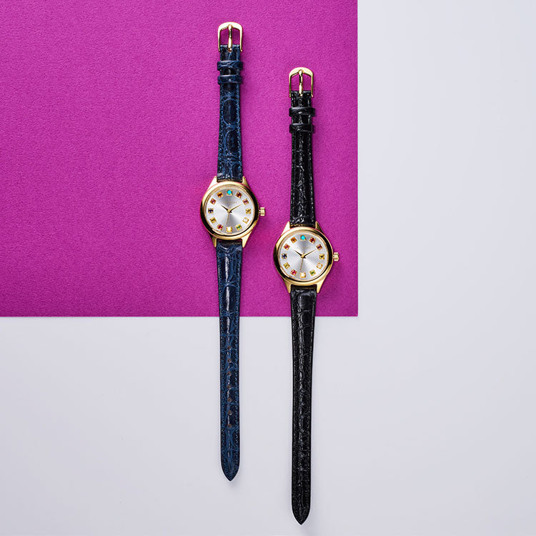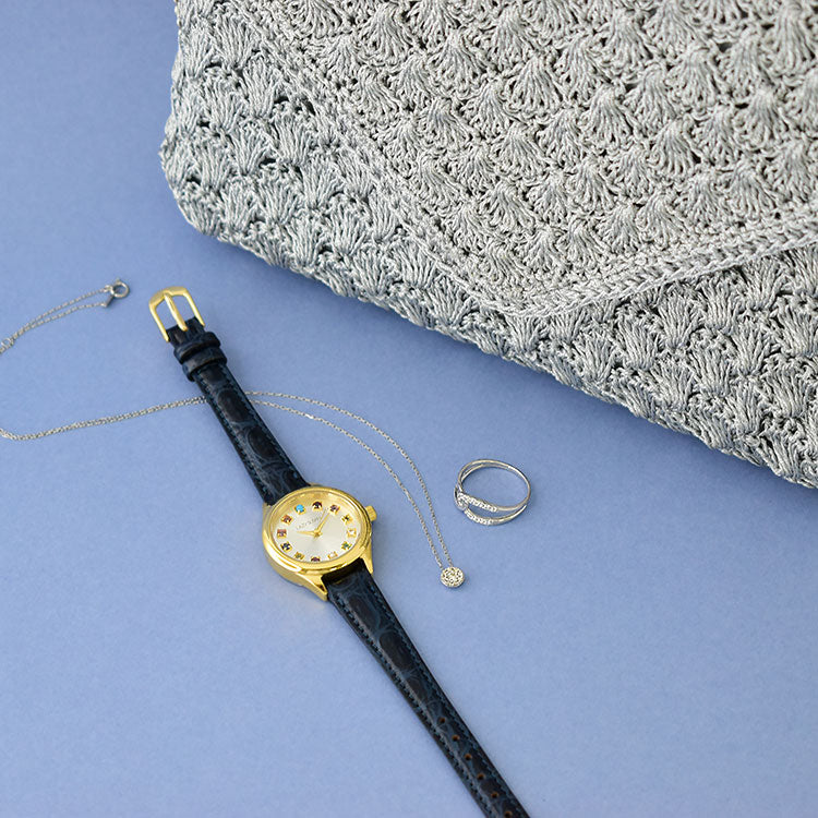 誕生石の輝きにあう、艶の良いクロコ調牛革ベルト。リングやブレスレットなど、ジュエリーとの相性も良いディテールは、女性らしい大人のスタイルです。