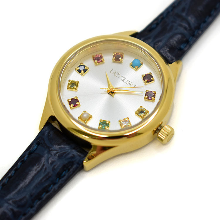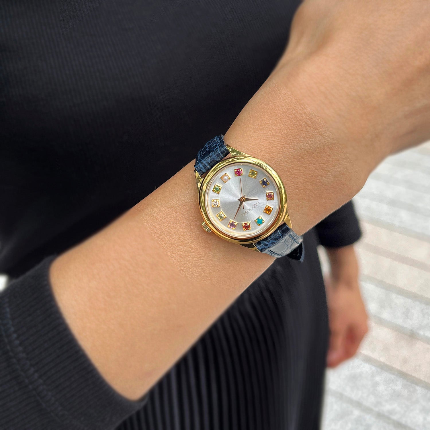 文字盤に12の誕生石をあしらった「バースデーウォッチ」を復刻いたしました。天然の誕生石をひとつひとつ丁寧に爪留めし、サークル状に配置。ゴールドのベゼルがその輝きを引き立てる上品なデザインです。
