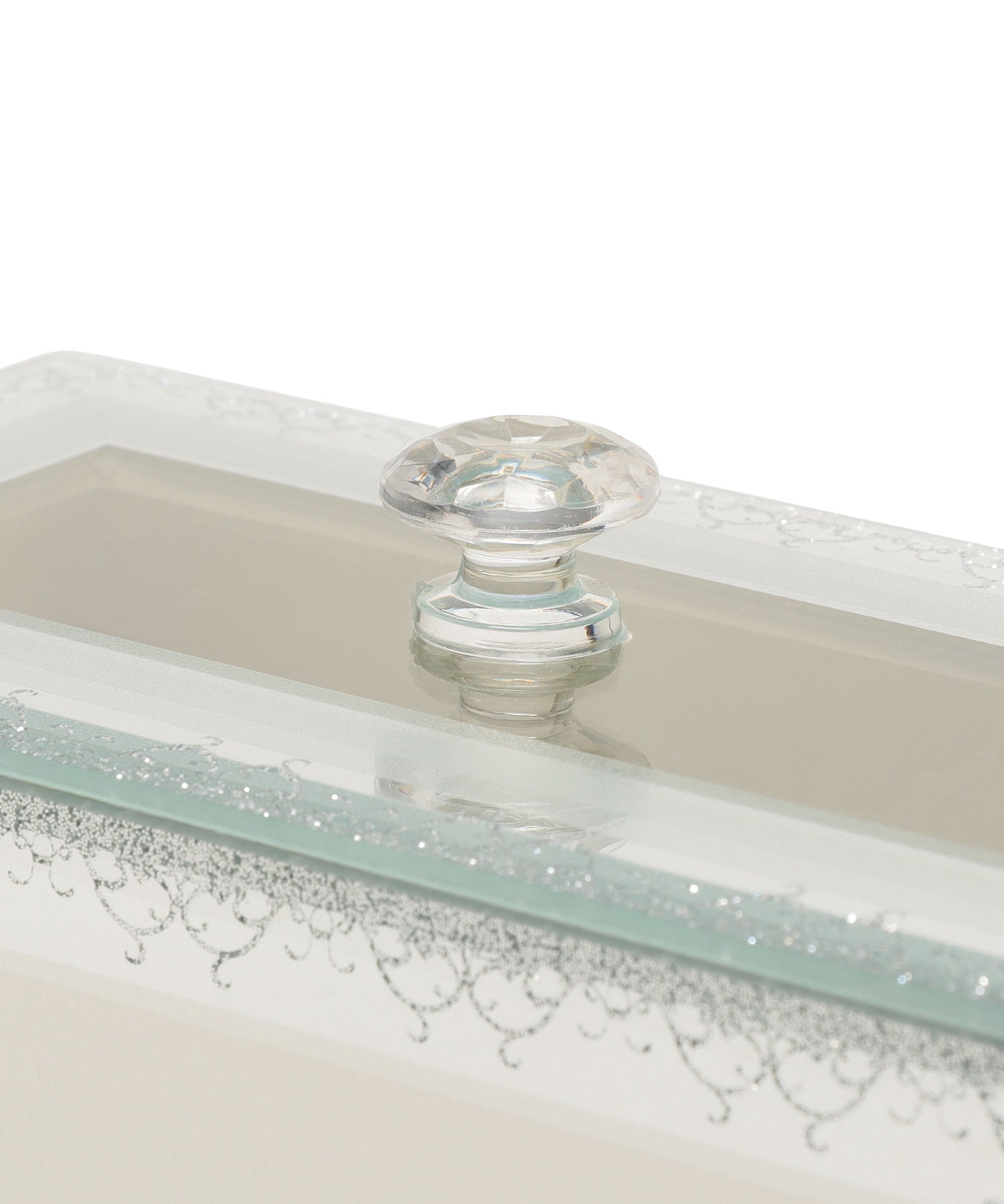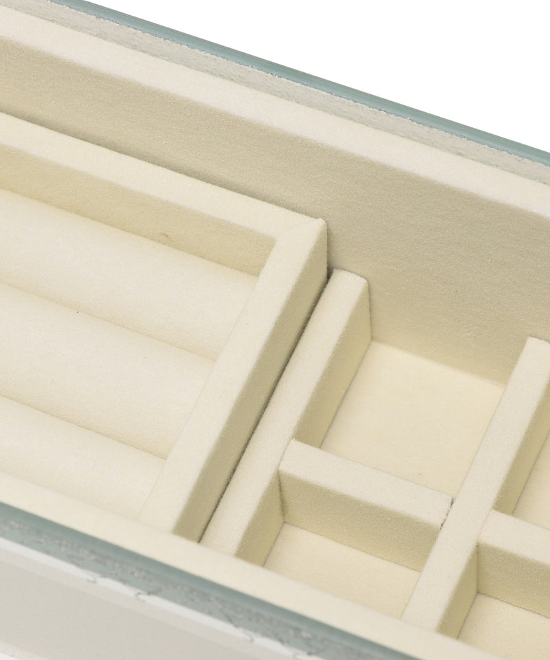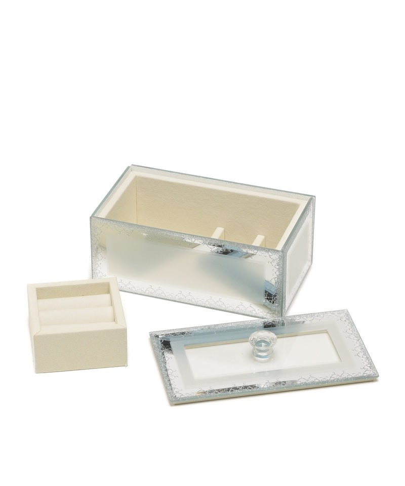 宝箱に大切なジュエリーをそっとしまう。透明感ときらめきに心を奪われる幻想的なガラスのジュエリーボックスです。ラメラインで描いた繊細なアラベスク模様の縁取りが、お気に入りのジュエリーをより美しく華やかに引き立ててくれます。