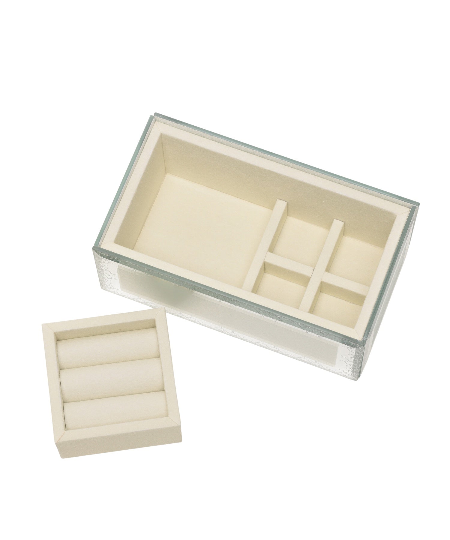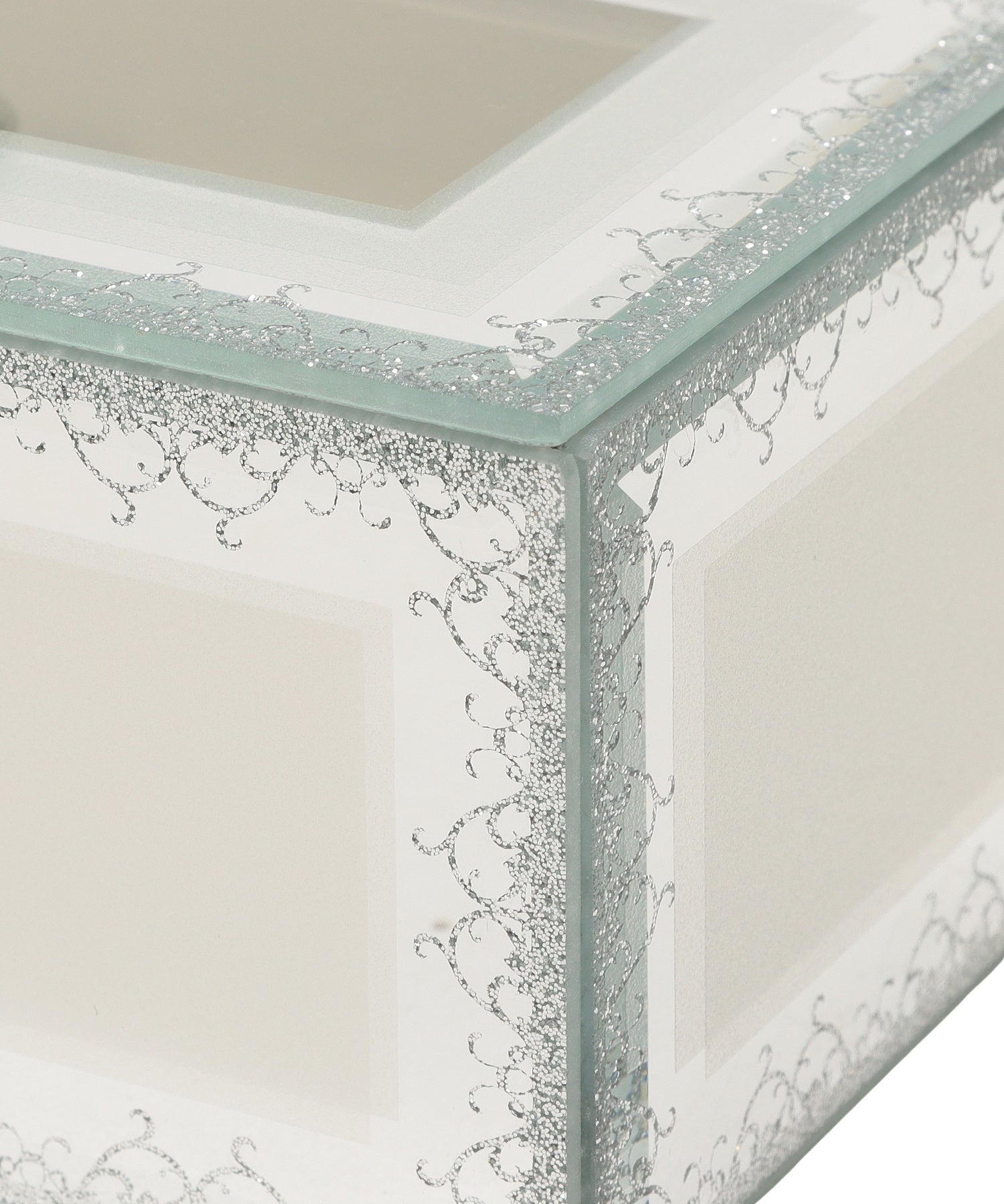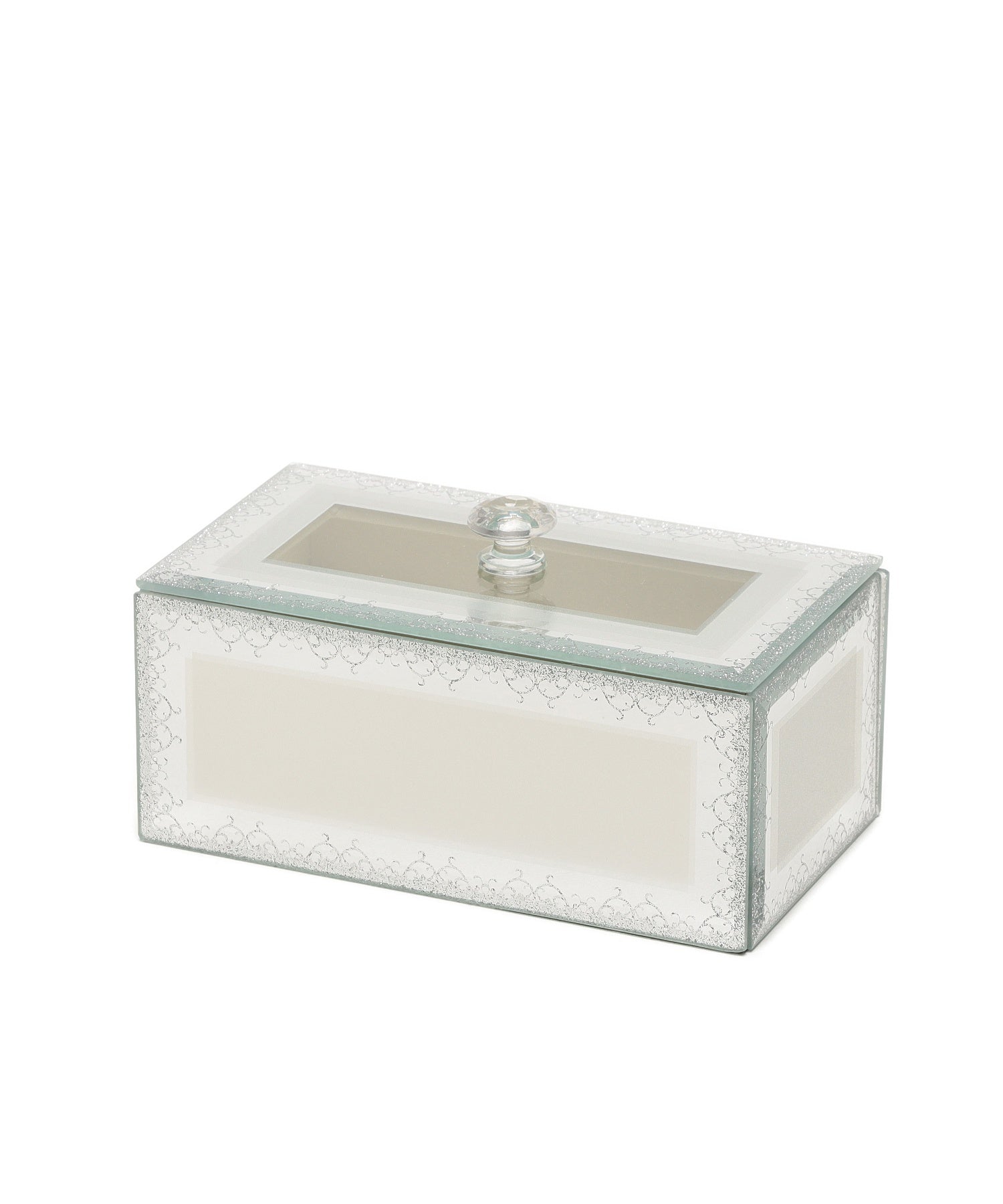宝箱に大切なジュエリーをそっとしまう。透明感ときらめきに心を奪われる幻想的なガラスのジュエリーボックスです。ラメラインで描いた繊細なアラベスク模様の縁取りが、お気に入りのジュエリーをより美しく華やかに引き立ててくれます。