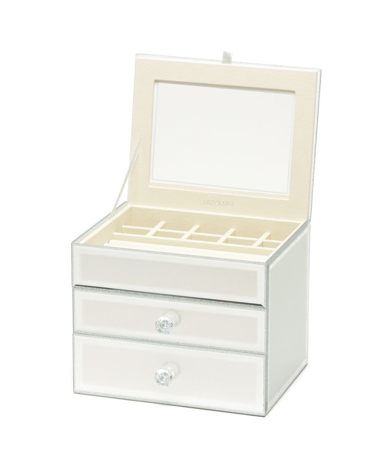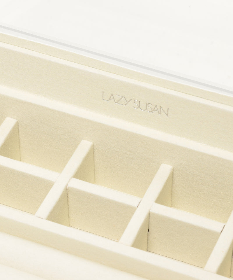 上段は大切なジュエリーをひとつずつ分けて収納ができるグリッドスペースとリングピロー。リングピローは、ポストタイプのピアスを挿しても見やすく綺麗に収納できます。セットデザインのリングとピアスを並べて収納すれば、さっと着けられて朝の支度もスムーズです。