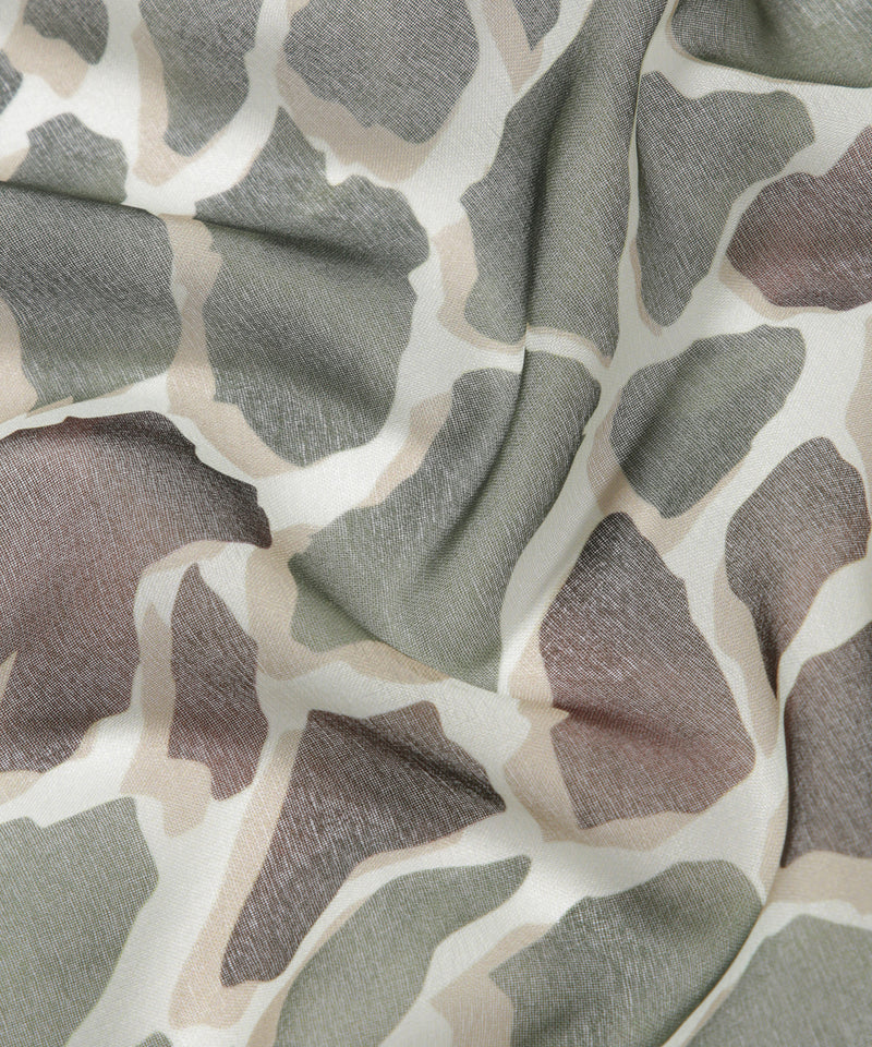 ベージュやアイボリーなど軽やかなカラーのジャケットにあわせたいサファリ風ストール。