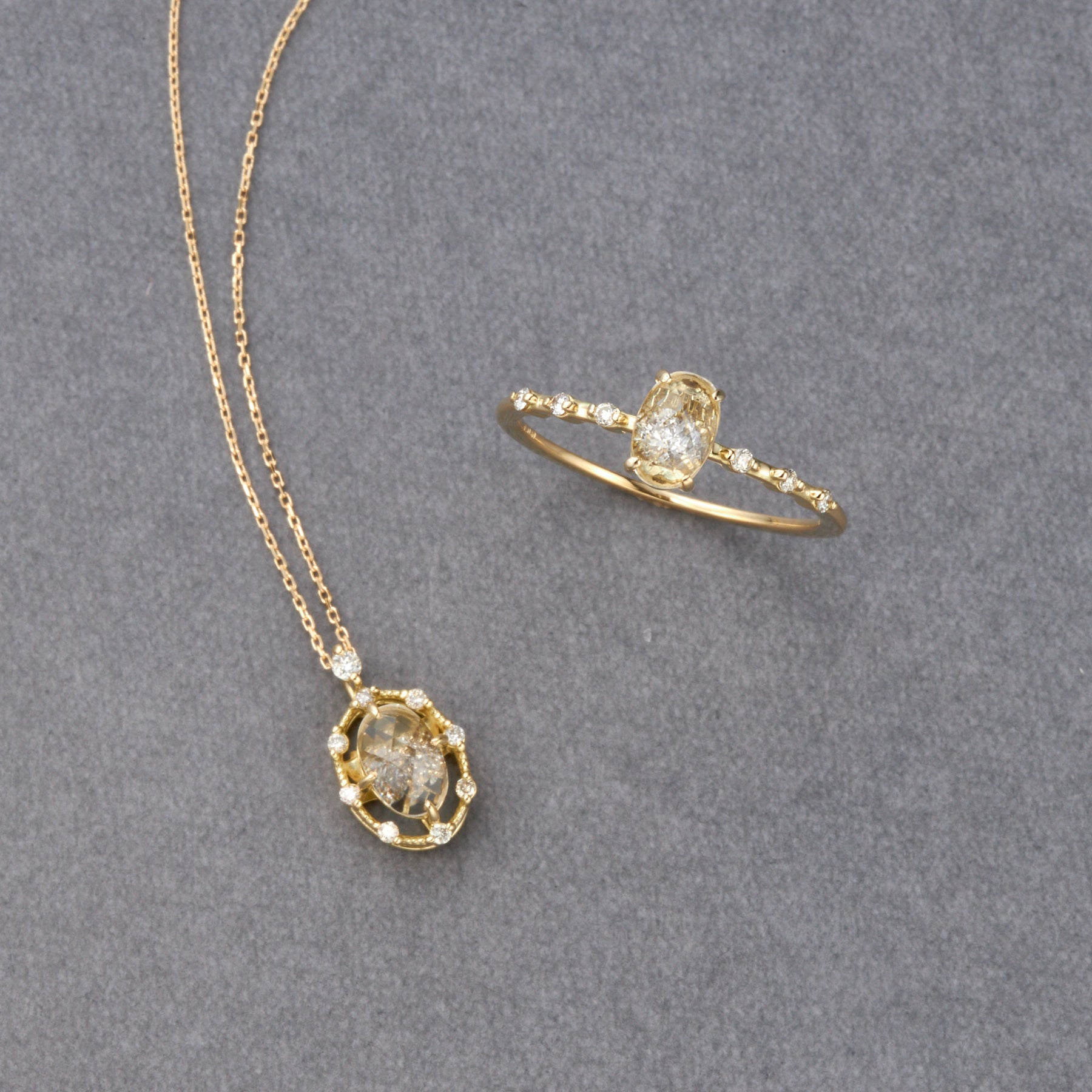 動きに合わせて、石の内側でダイヤモンドが揺らめく不思議な輝きは、人を惹きつけ女性に輝く美をもたらしてくれます。