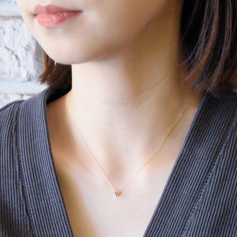 裏には情愛を感じる深紅のルビーを。ハートモチーフをさりげなくみにつけられるプチサイズで、ルビーのガーリーな仕上がりを楽しめます。