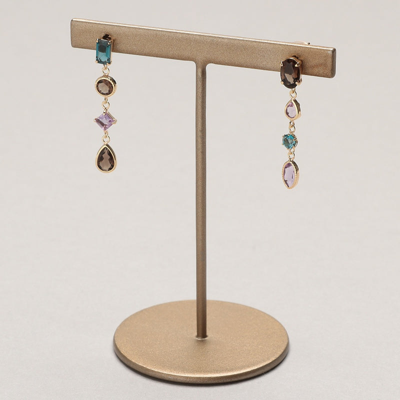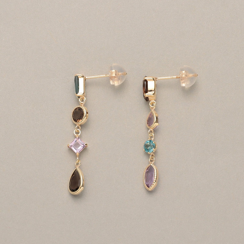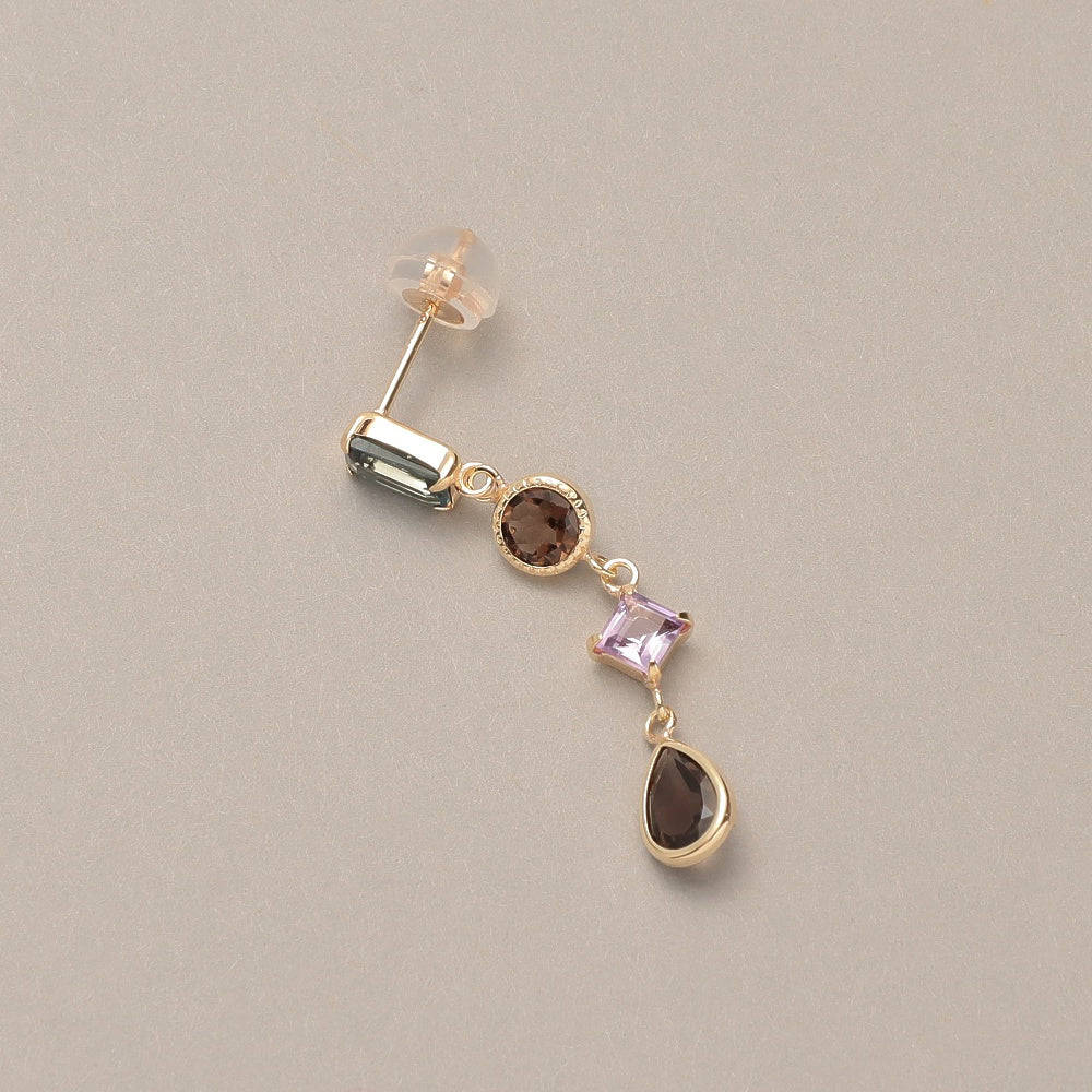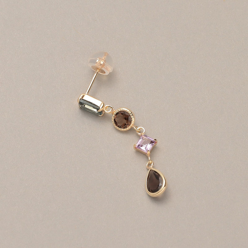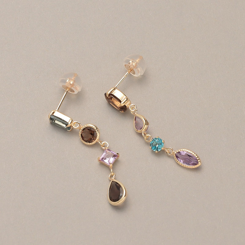 美しいカットを施したカラーストーンが揺れるたびに、奥深い輝きを放ちます。ライトアメシストの透明感、ロンドンブルートパーズの生き生きとした青み。大人のスタイルに華を添えるピアスです。