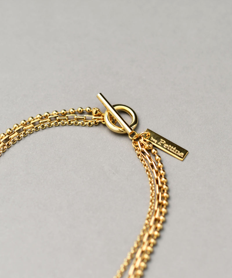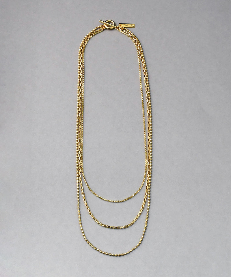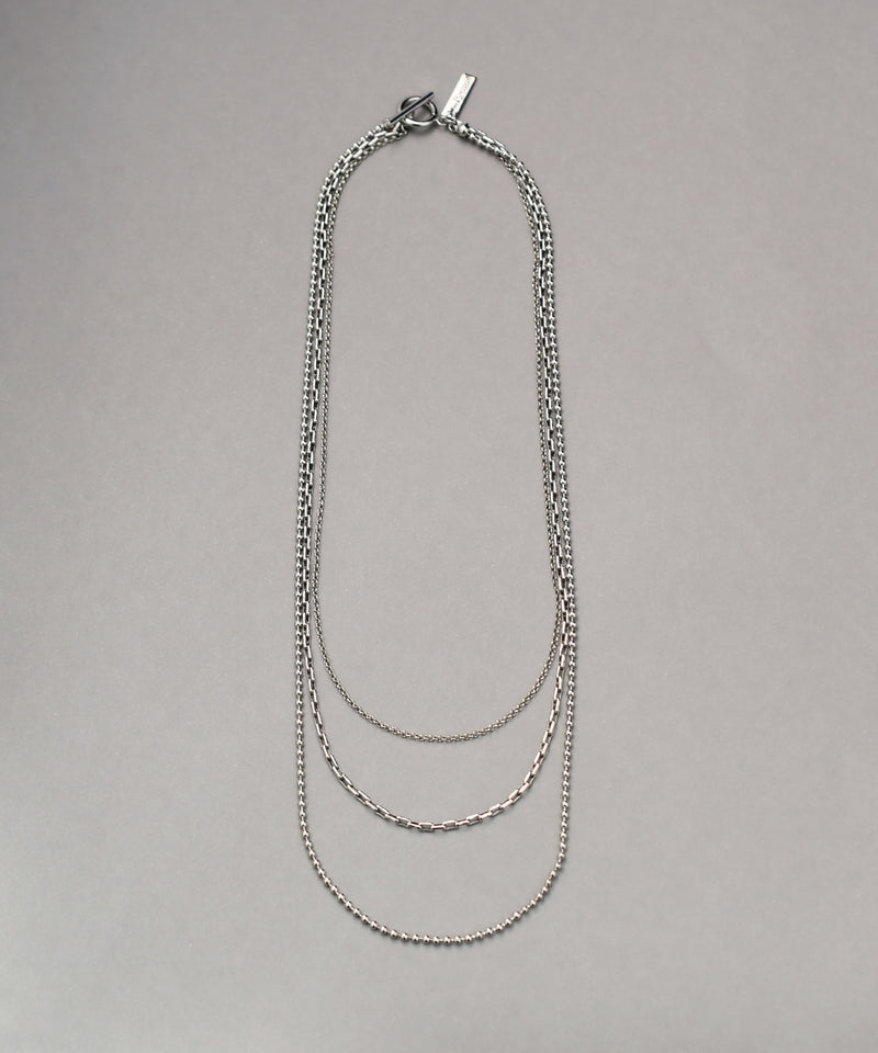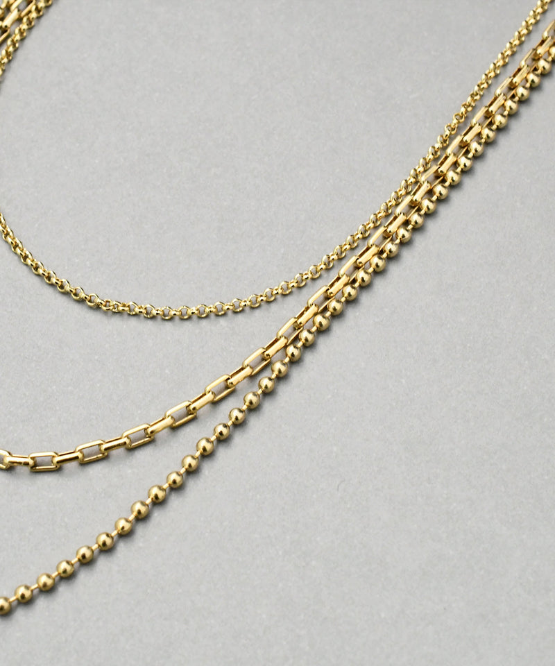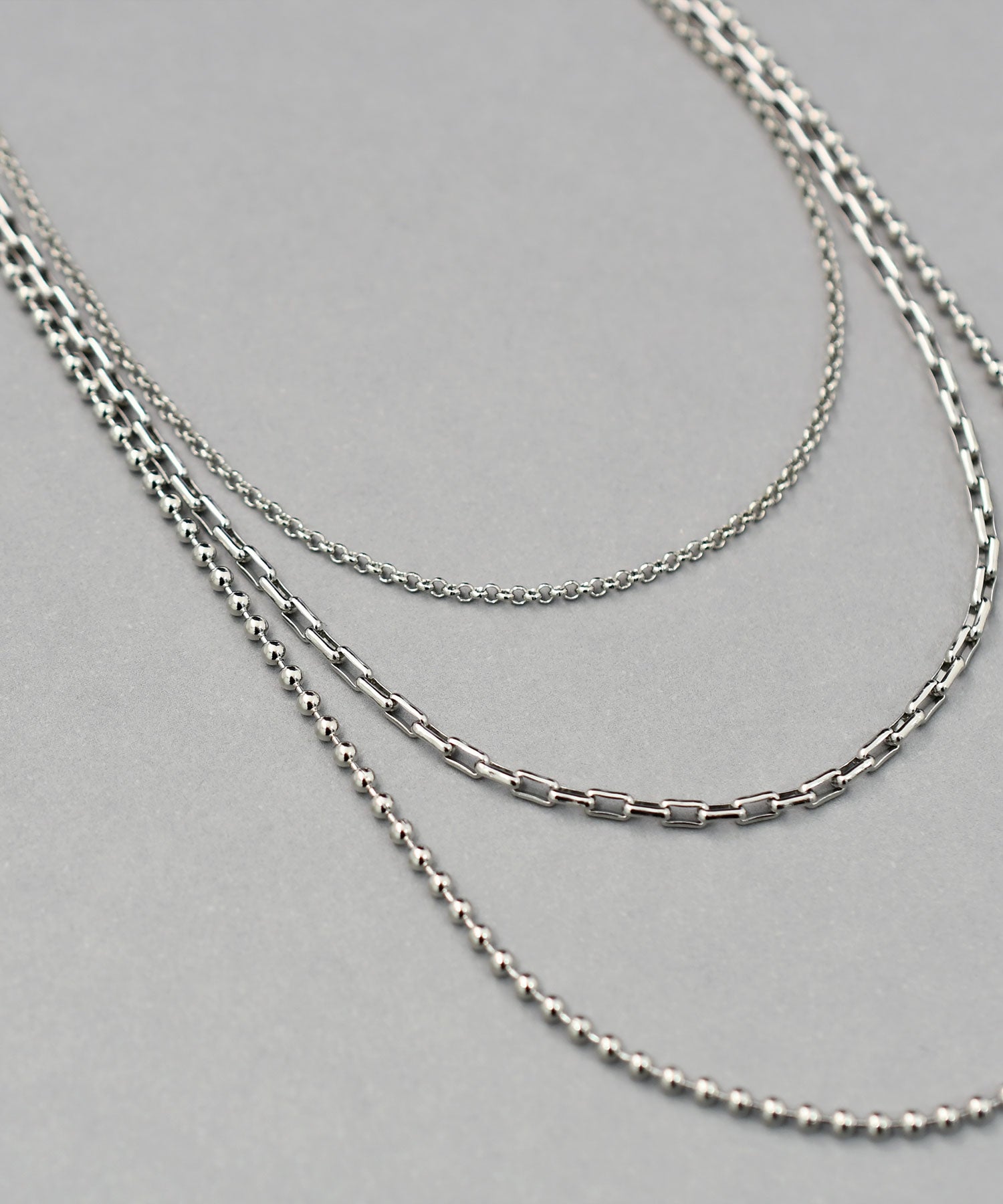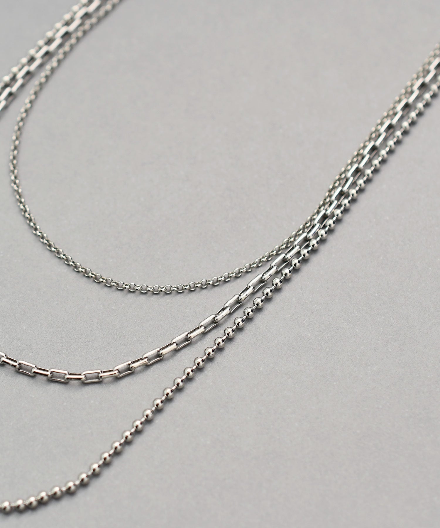 異なる3本のチェーンをMIXしたシンプルなネックレス。3種の異なる表情が光と影のグラデーションをつくり出し、煌めきと存在感が生まれます。