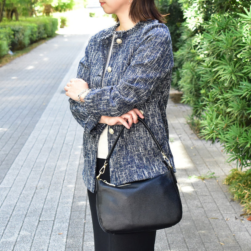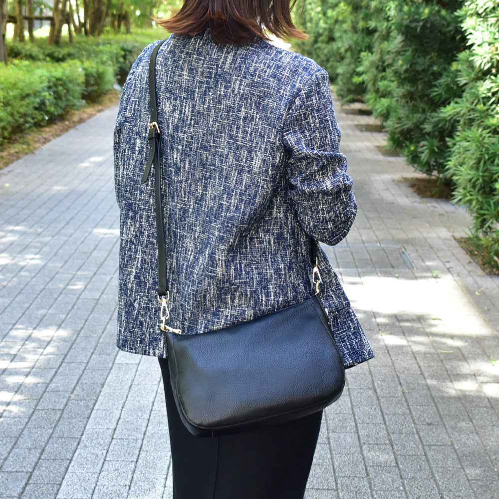 ショルダーストラップ付きで、ショッピングや旅行など普段使いにも。