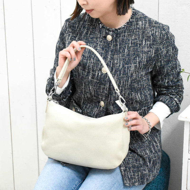 繊細なシボ感のある上質なレザーバッグ。 きちんと感を出したいときの定番バッグは色に遊び心を表現して自分らしいアイテムに。