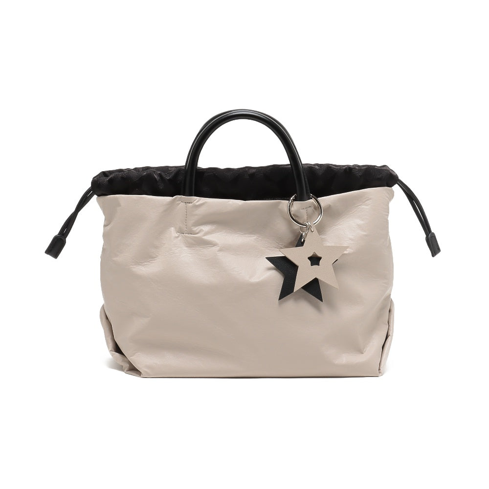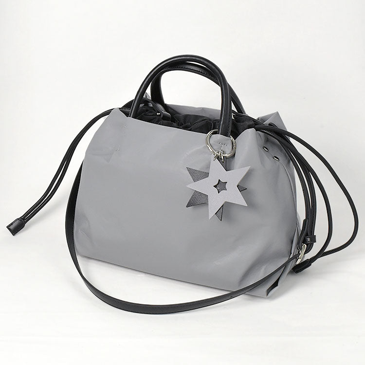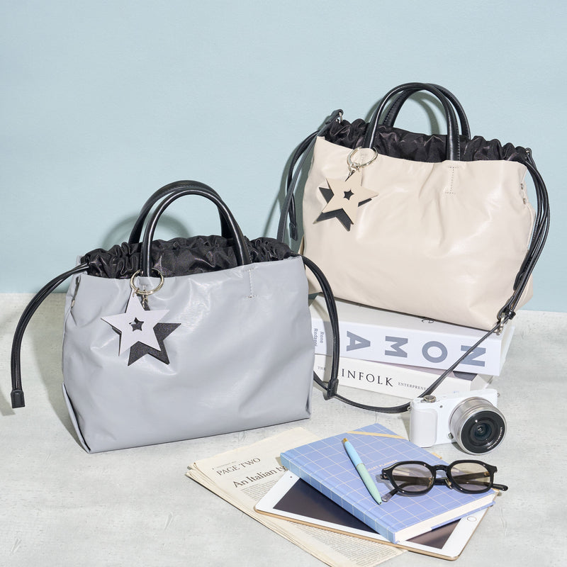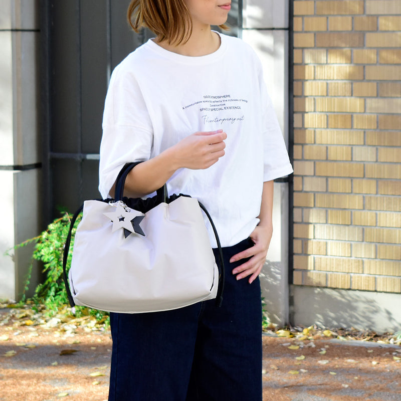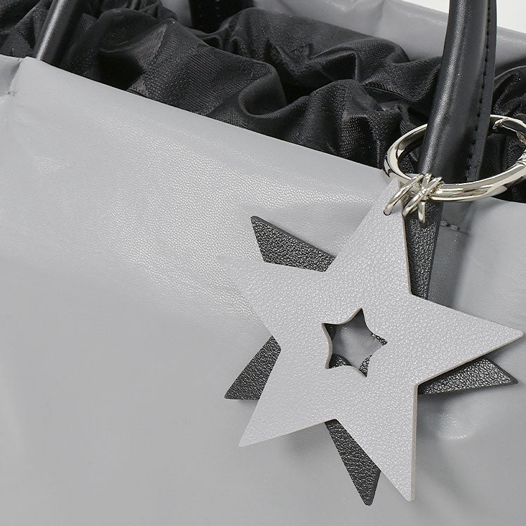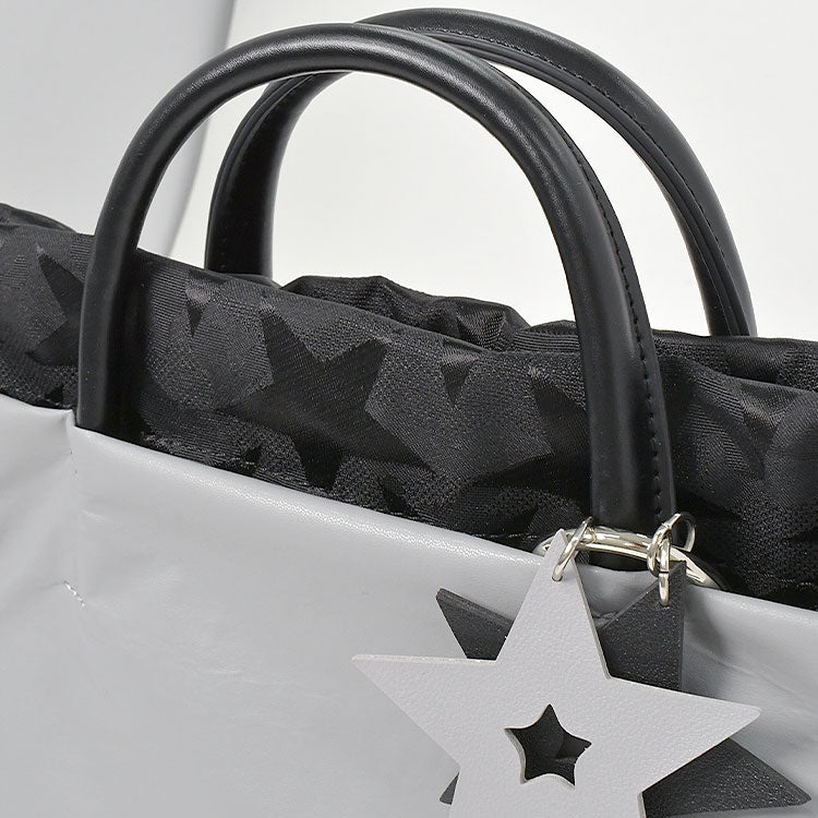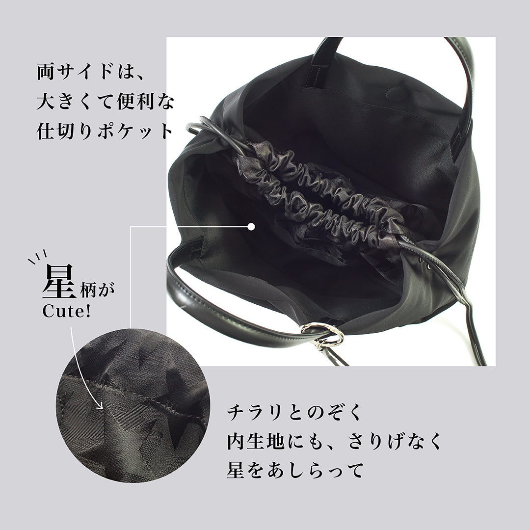 星のチャームが大人可愛いアクセントに。内生地にもさりげなく星がのぞきます。内袋と外袋の間は両側とも大きな仕切りポケットに。スマートフォンやパスケースなど必要な小物がさっと取り出せます。