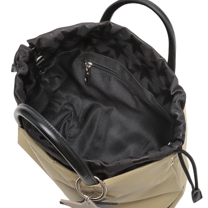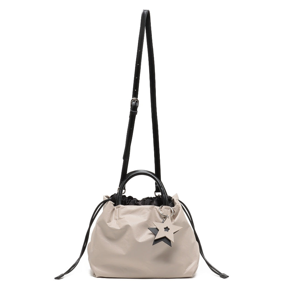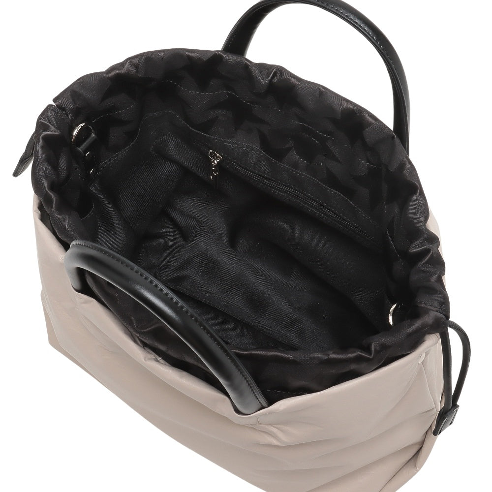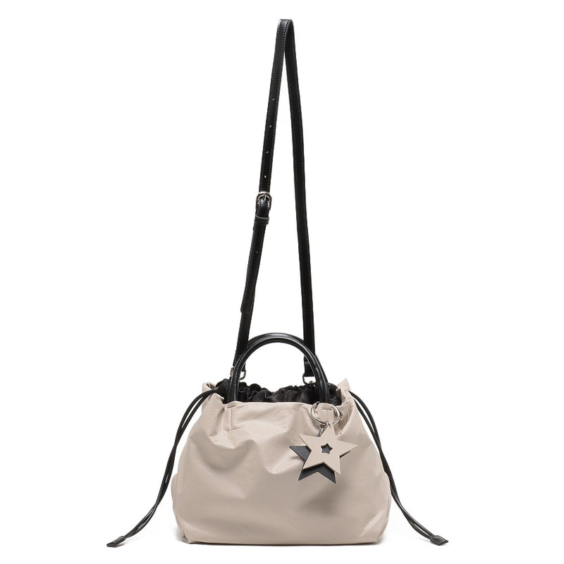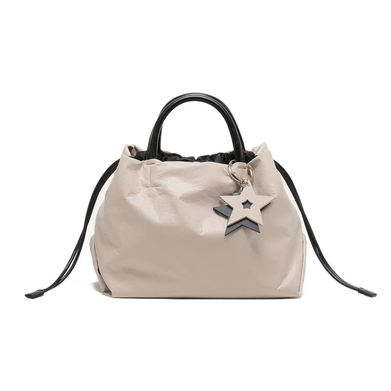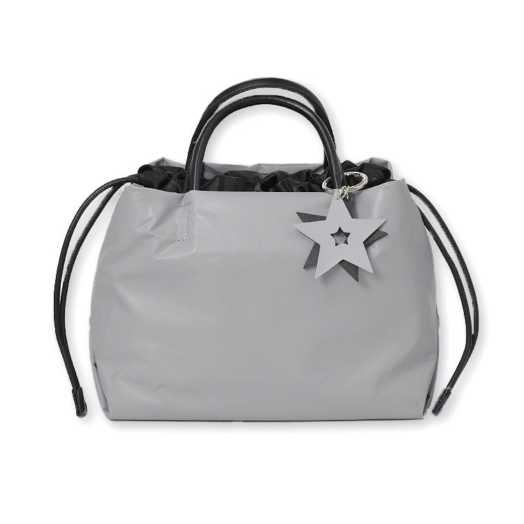 星のチャームが大人可愛いアクセントに。内生地にもさりげなく星がのぞきます。内袋と外袋の間は両側とも大きな仕切りポケットに。スマートフォンやパスケースなど必要な小物がさっと取り出せます。