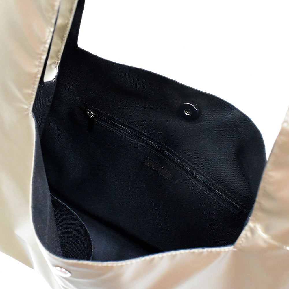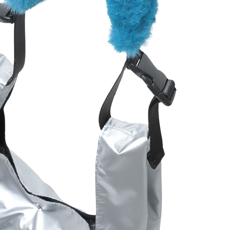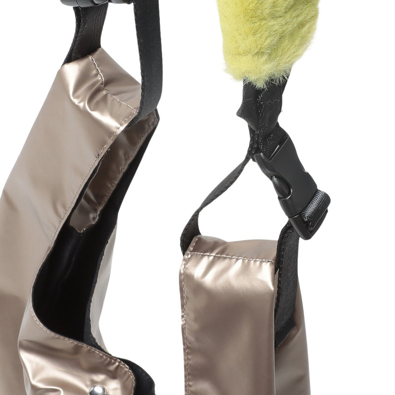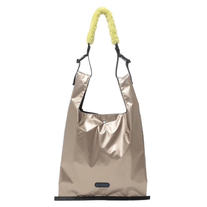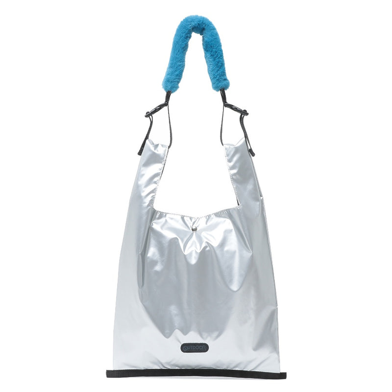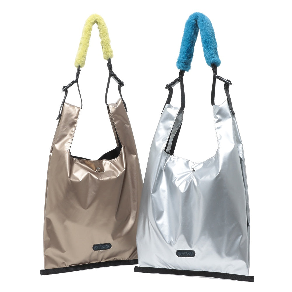 レイジースーザンで人気の光沢感のある生地を「OUTDOOR PRODUCTS」のショルダーバッグに仕立てました。ふわふわのファーハンドルがポイントです。