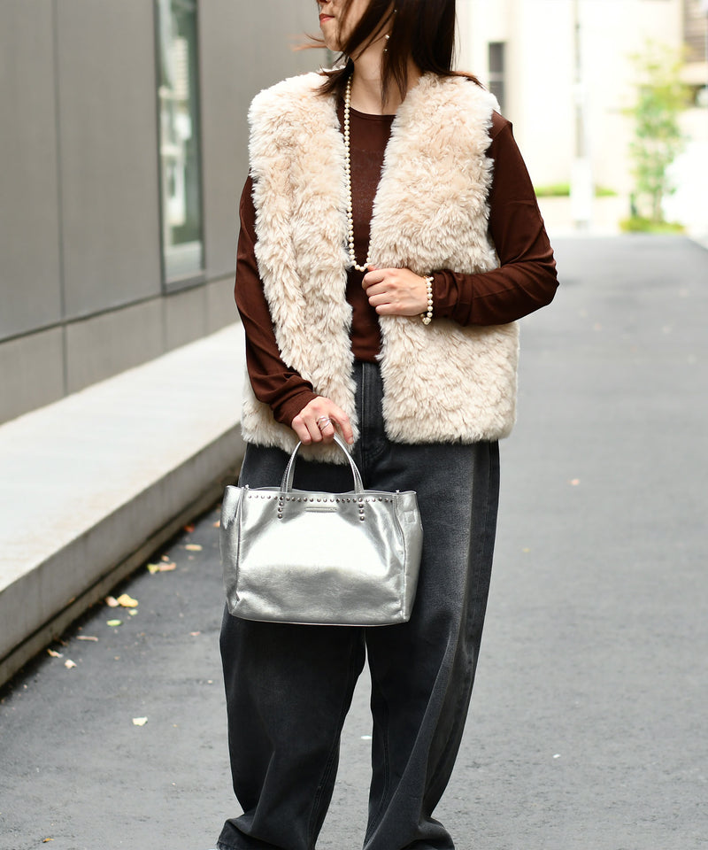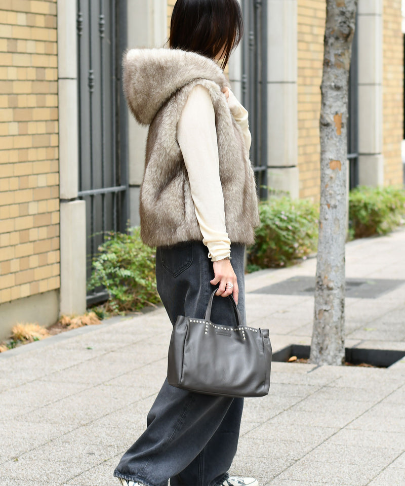 軽量で持ちやすく、インナーポーチ付きで整理整頓も簡単。控えめなスタッズが洗練されたアクセントを添え、カジュアルすぎないバランスのコーデが楽しめます。