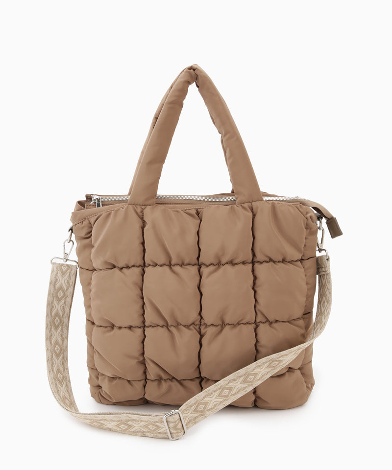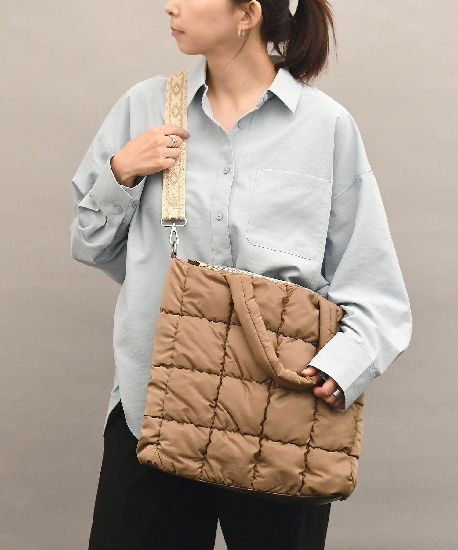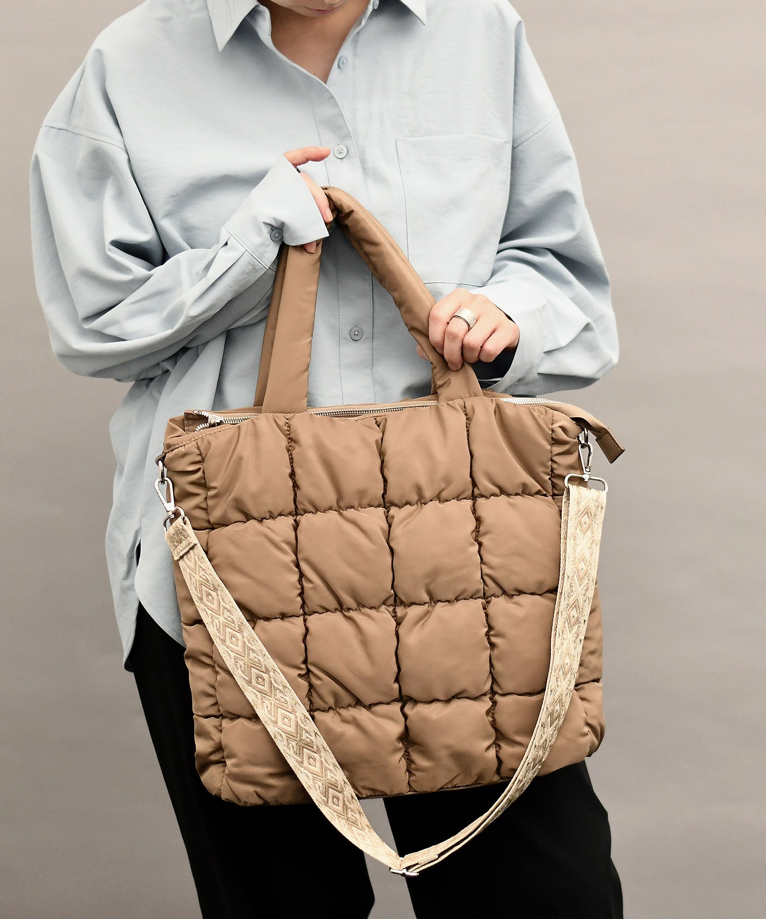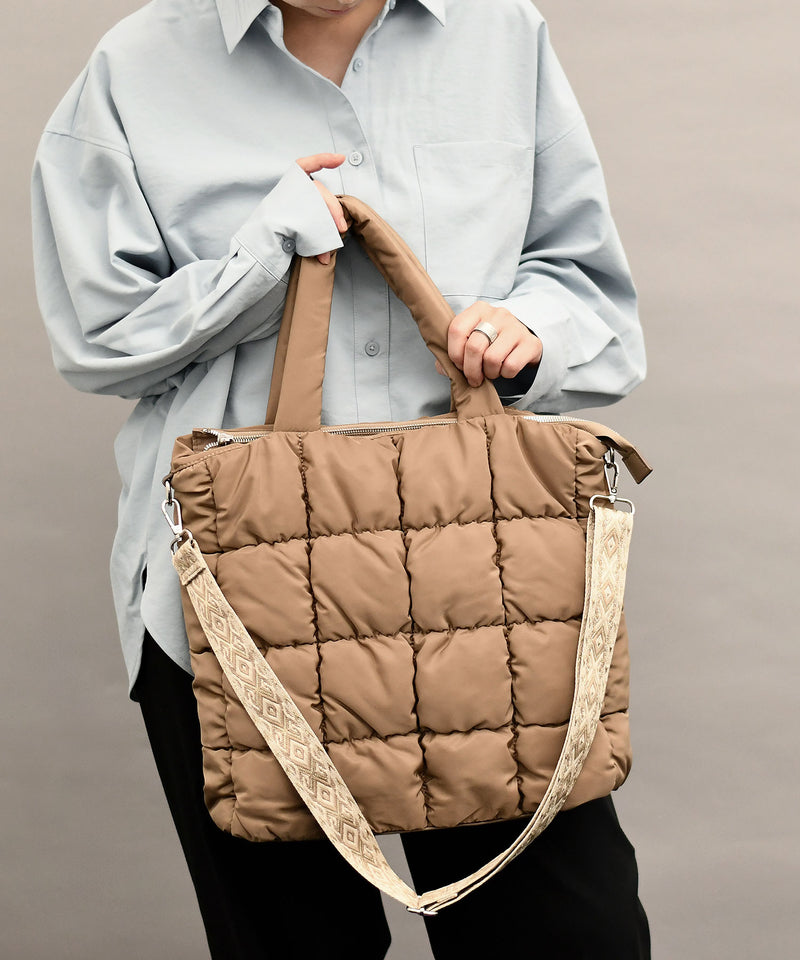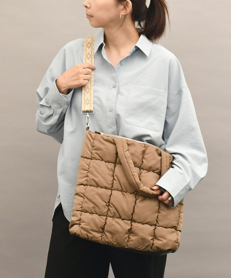 ふわふわ軽量なキルティングバッグ。ショルダーベルトがコーデのアクセントに。
