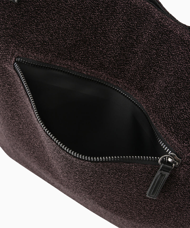 深いカラーに雲母のような繊細な煌めきを散りばめたラメ生地。派手さはなく、重たく見えがちな秋冬のスタイルになじみながら、さりげなく質感の個性を楽しめます。