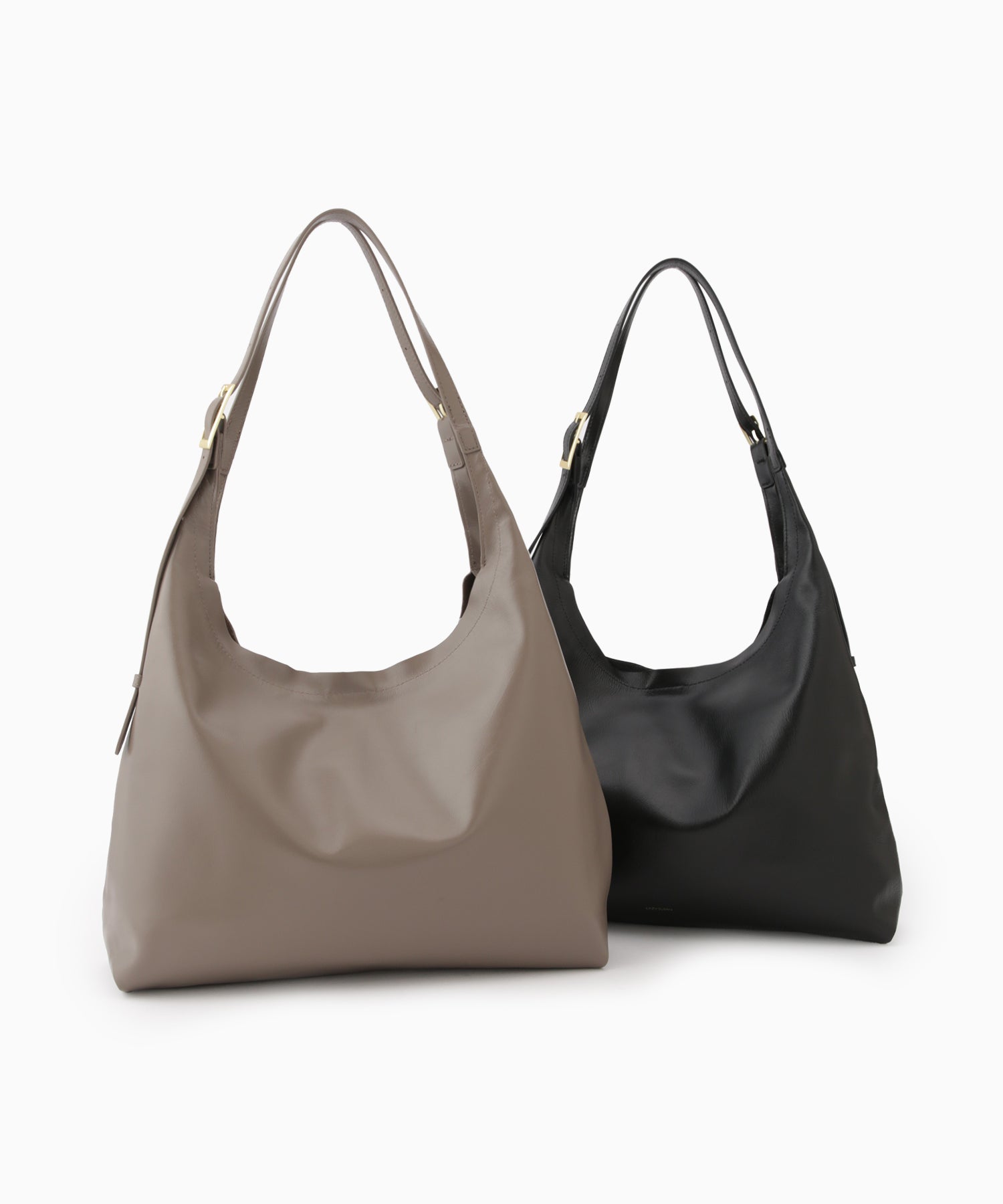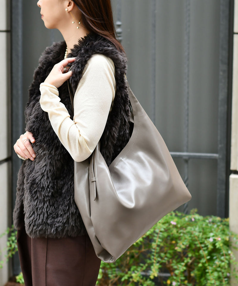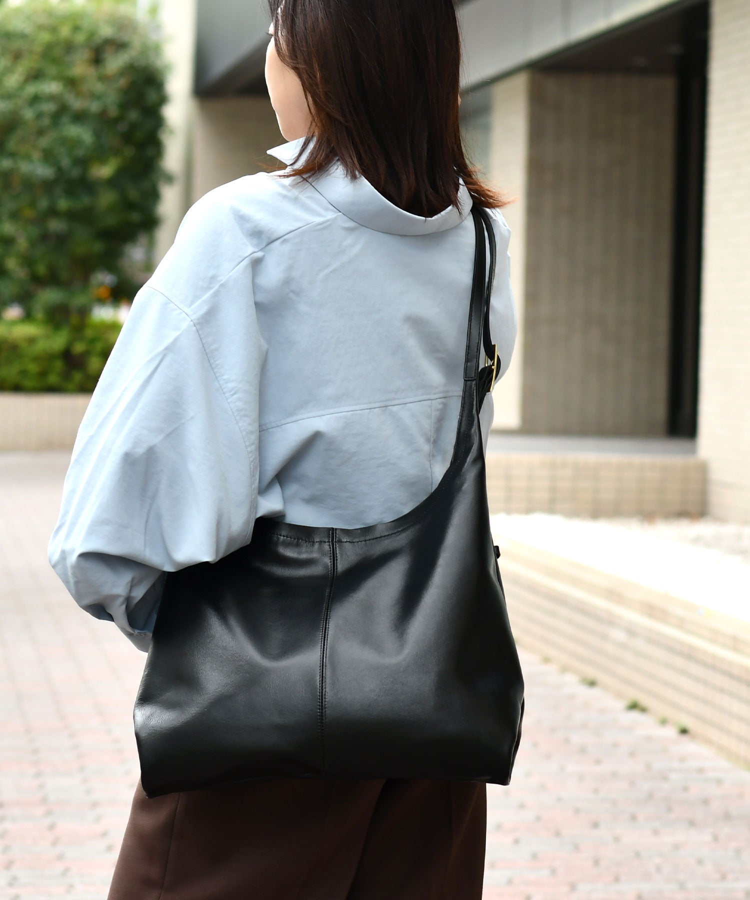 艶やかな上質レザーを使用したショルダーバッグ。薄くて軽量ながら、適度なハリを持ち、洗練されたきちんと感を演出します。