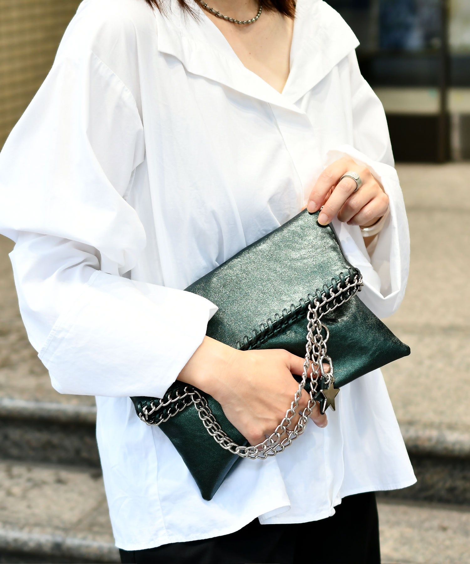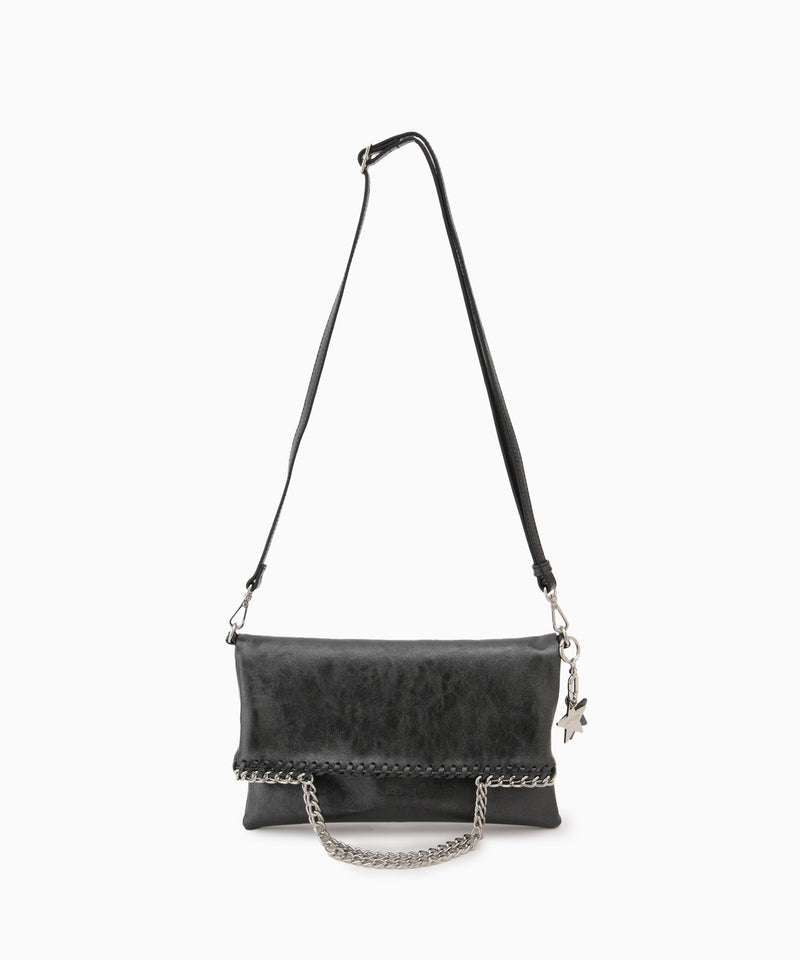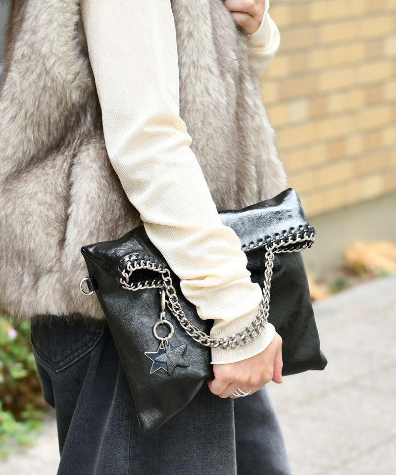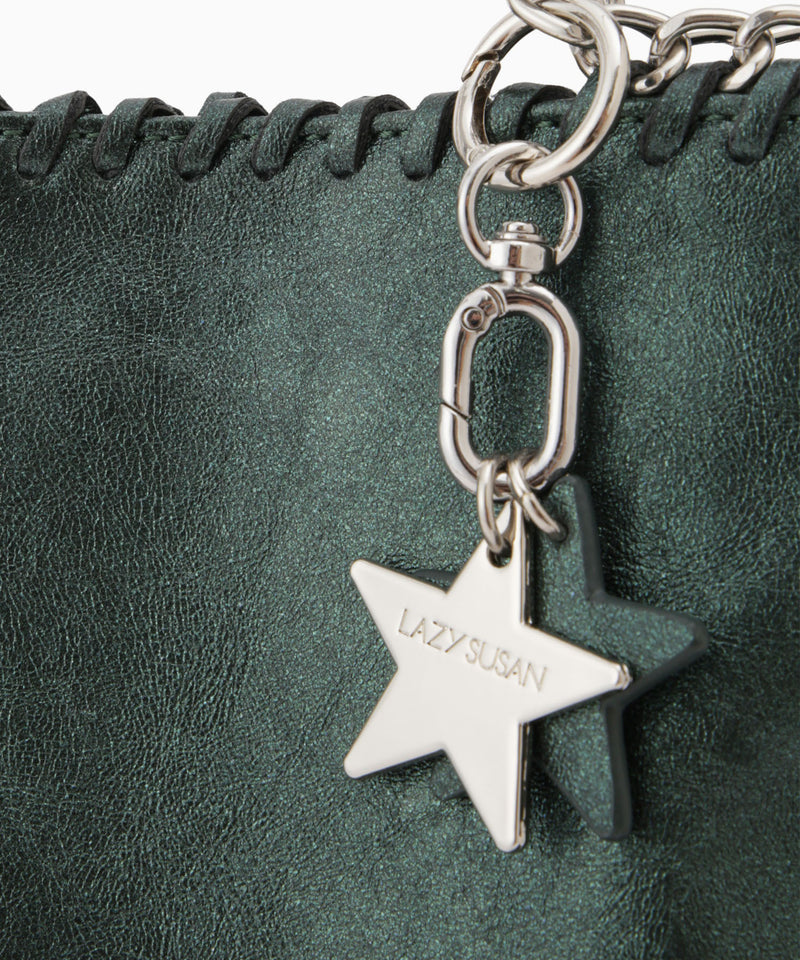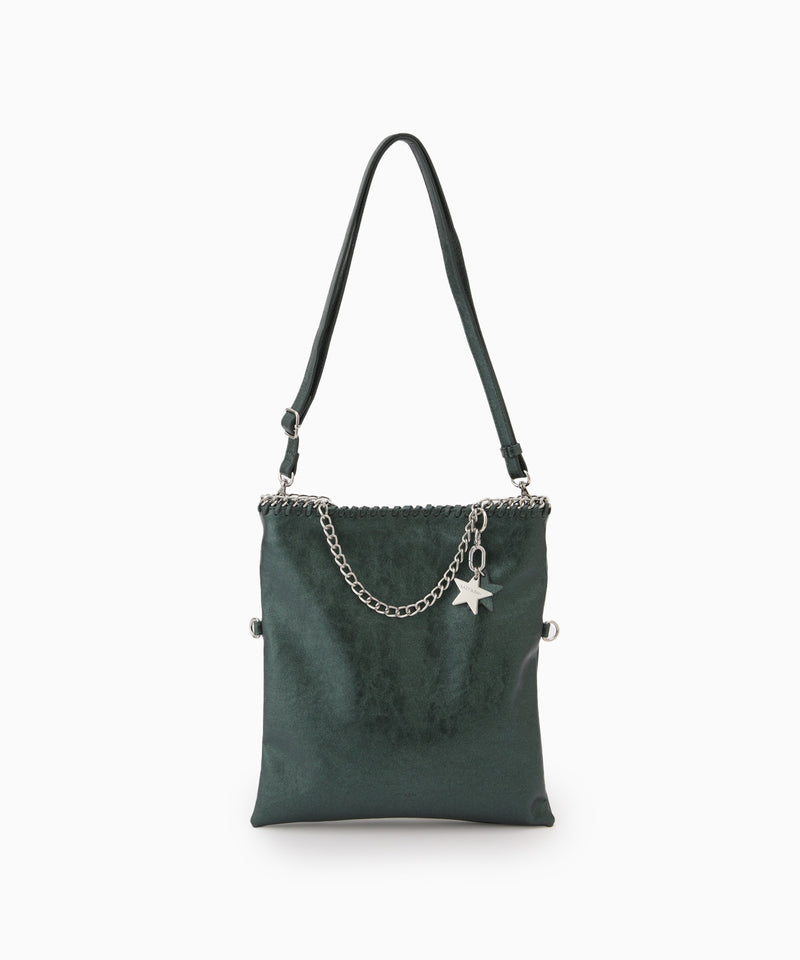 メタリックな煌めきと星のチャームがポイント。ハンドル、ショルダー、クラッチの3WAYで使い分けられ、シーンやスタイルに合わせて自在に変化します。