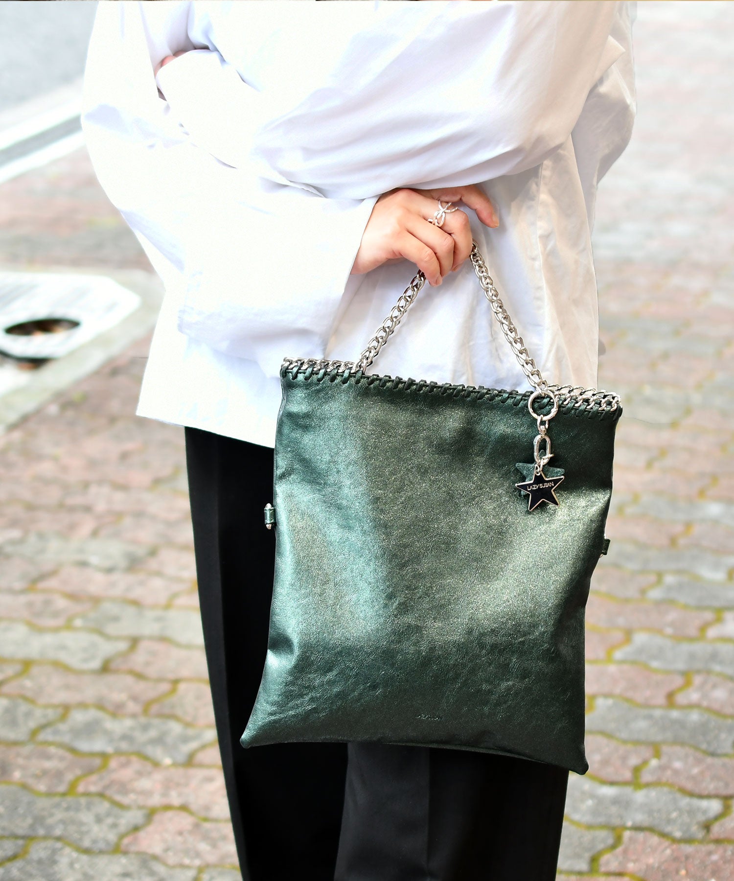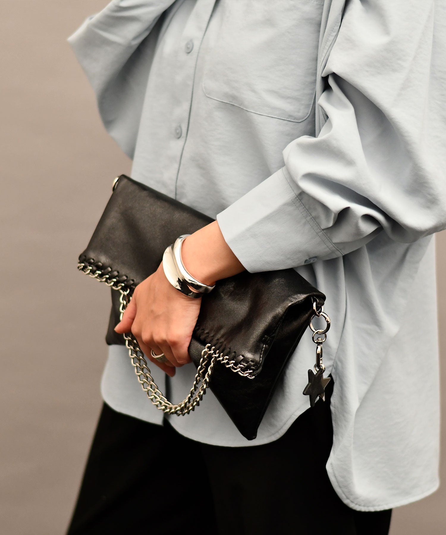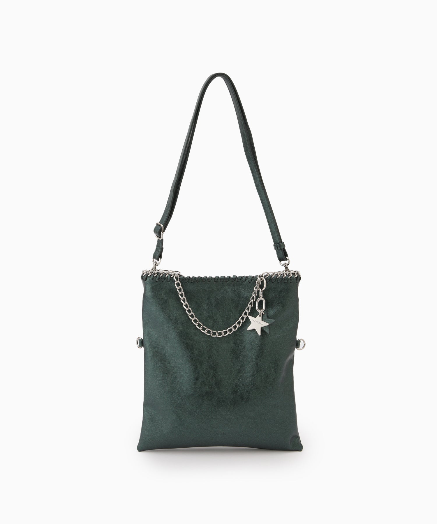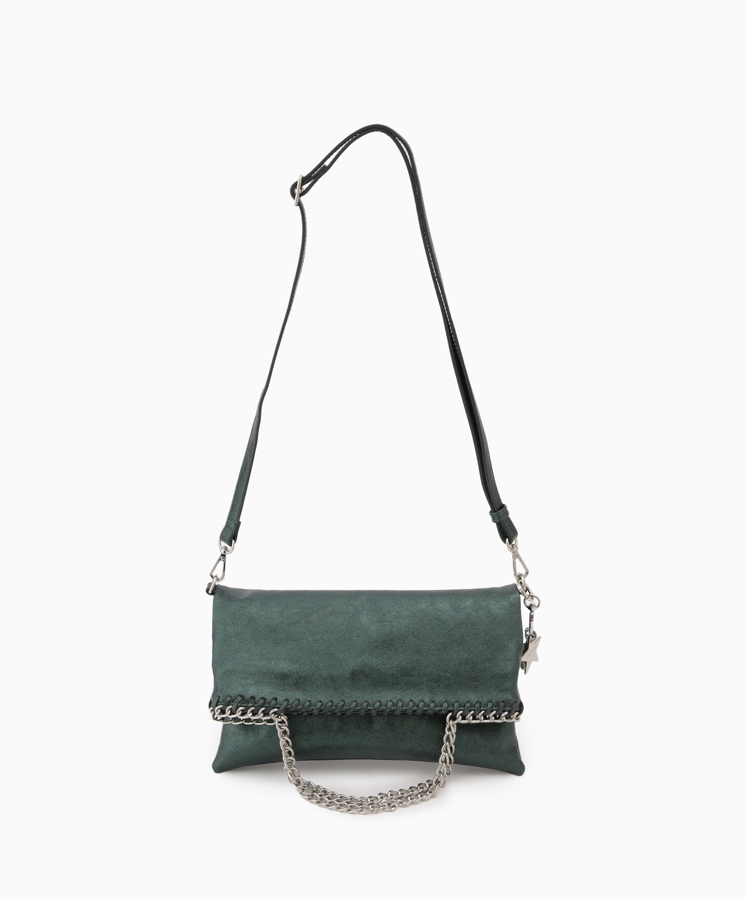 メタリックな煌めきと星のチャームがポイント。ハンドル、ショルダー、クラッチの3WAYで使い分けられ、シーンやスタイルに合わせて自在に変化します。