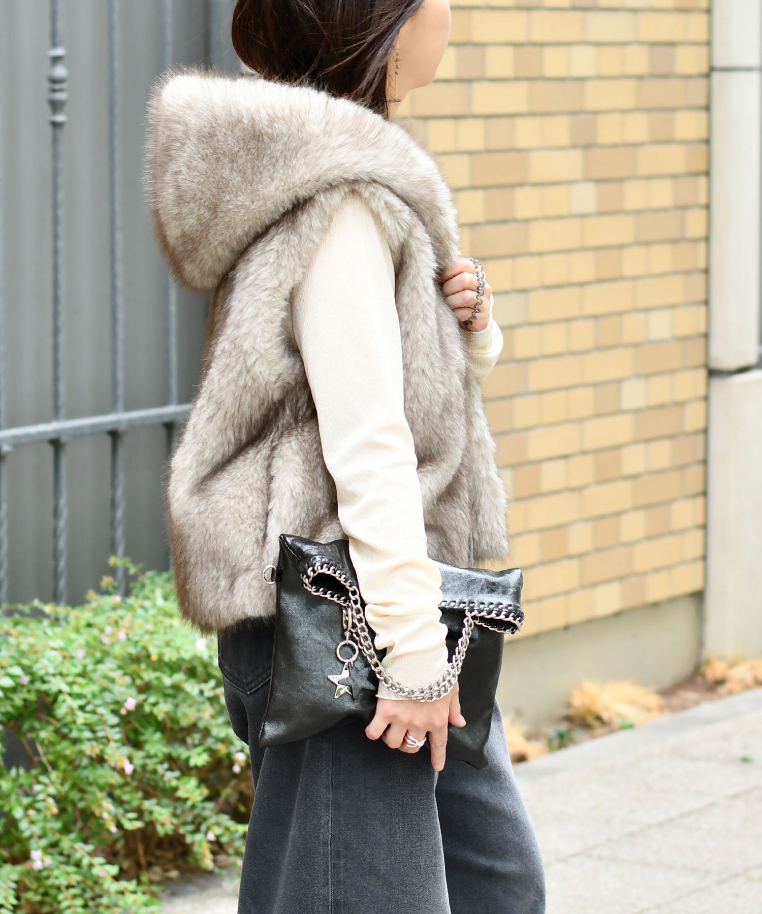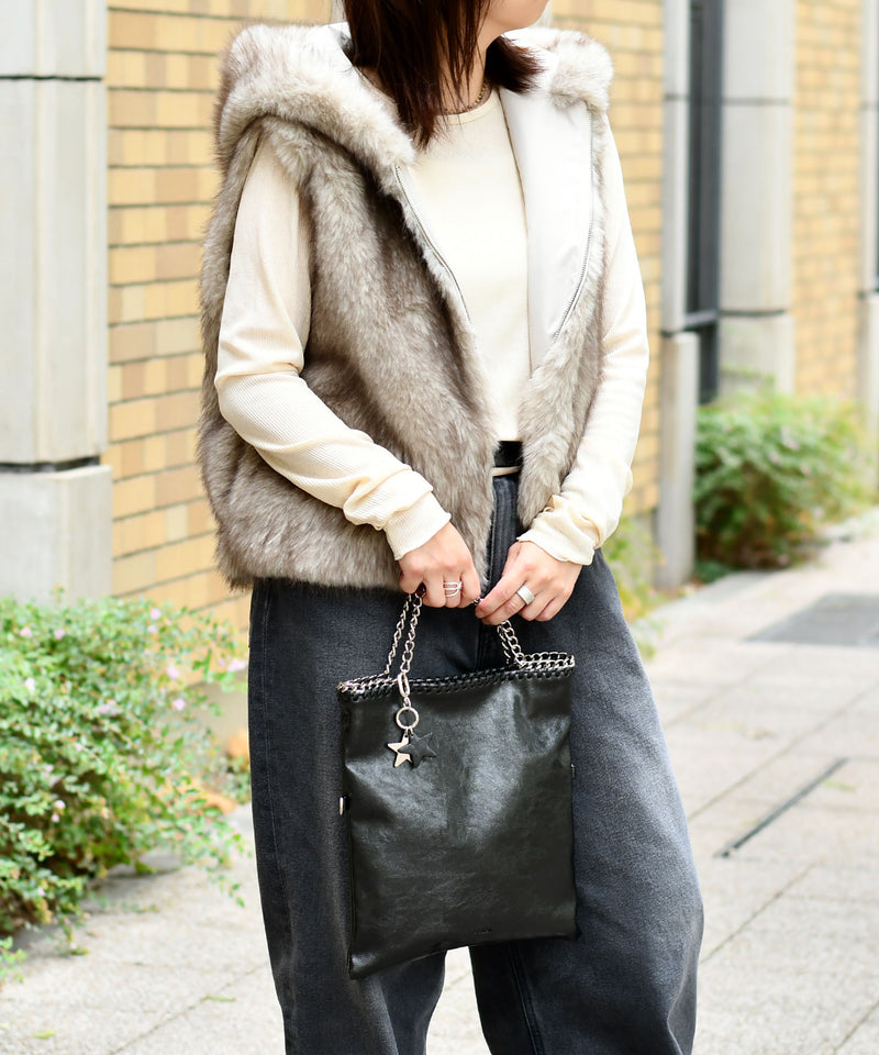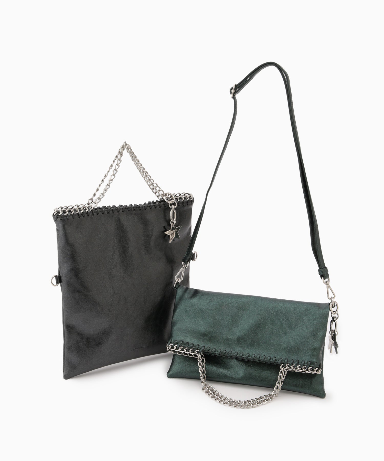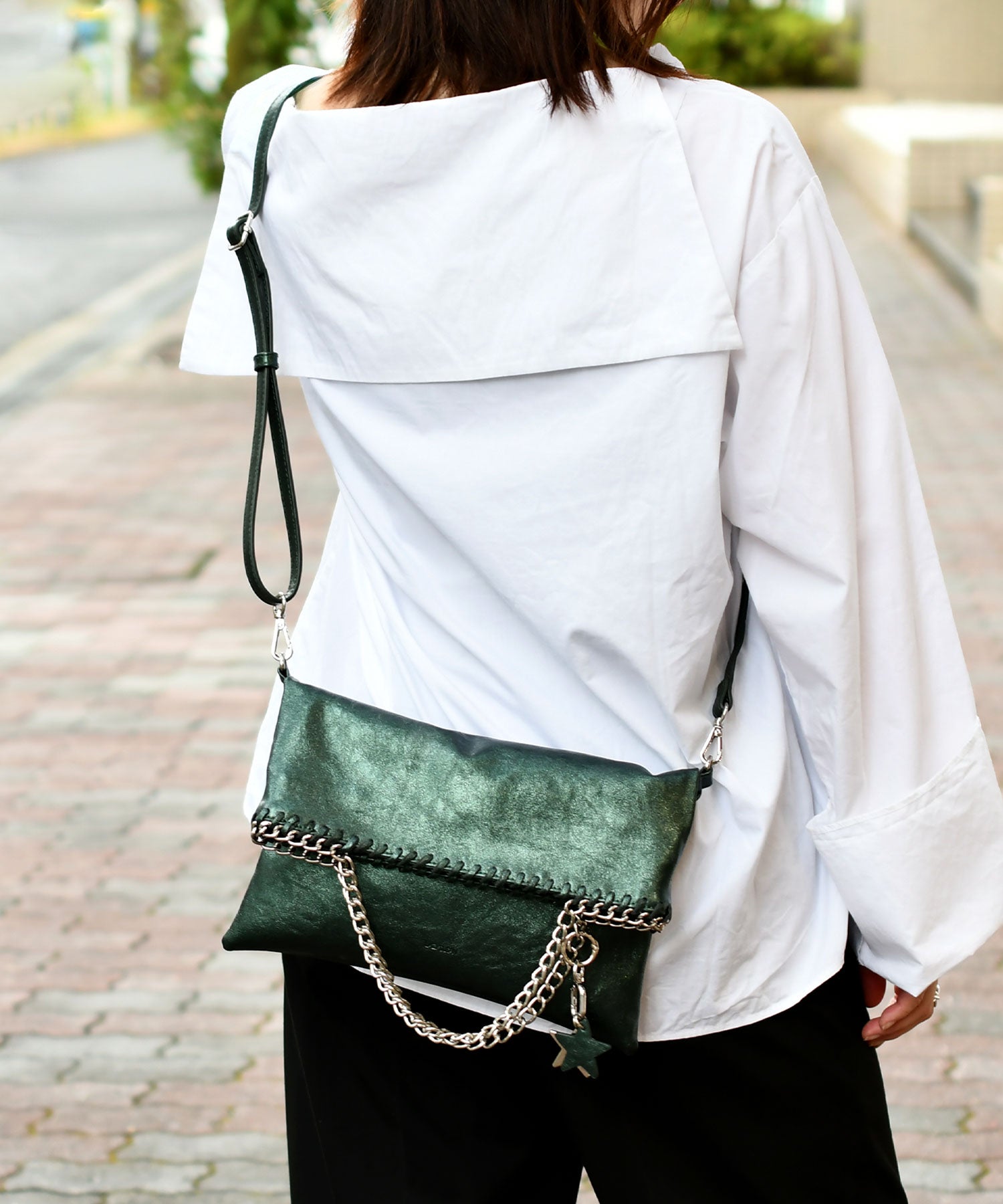 メタリックな煌めきと星のチャームがポイント。ハンドル、ショルダー、クラッチの3WAYで使い分けられ、シーンやスタイルに合わせて自在に変化します。
