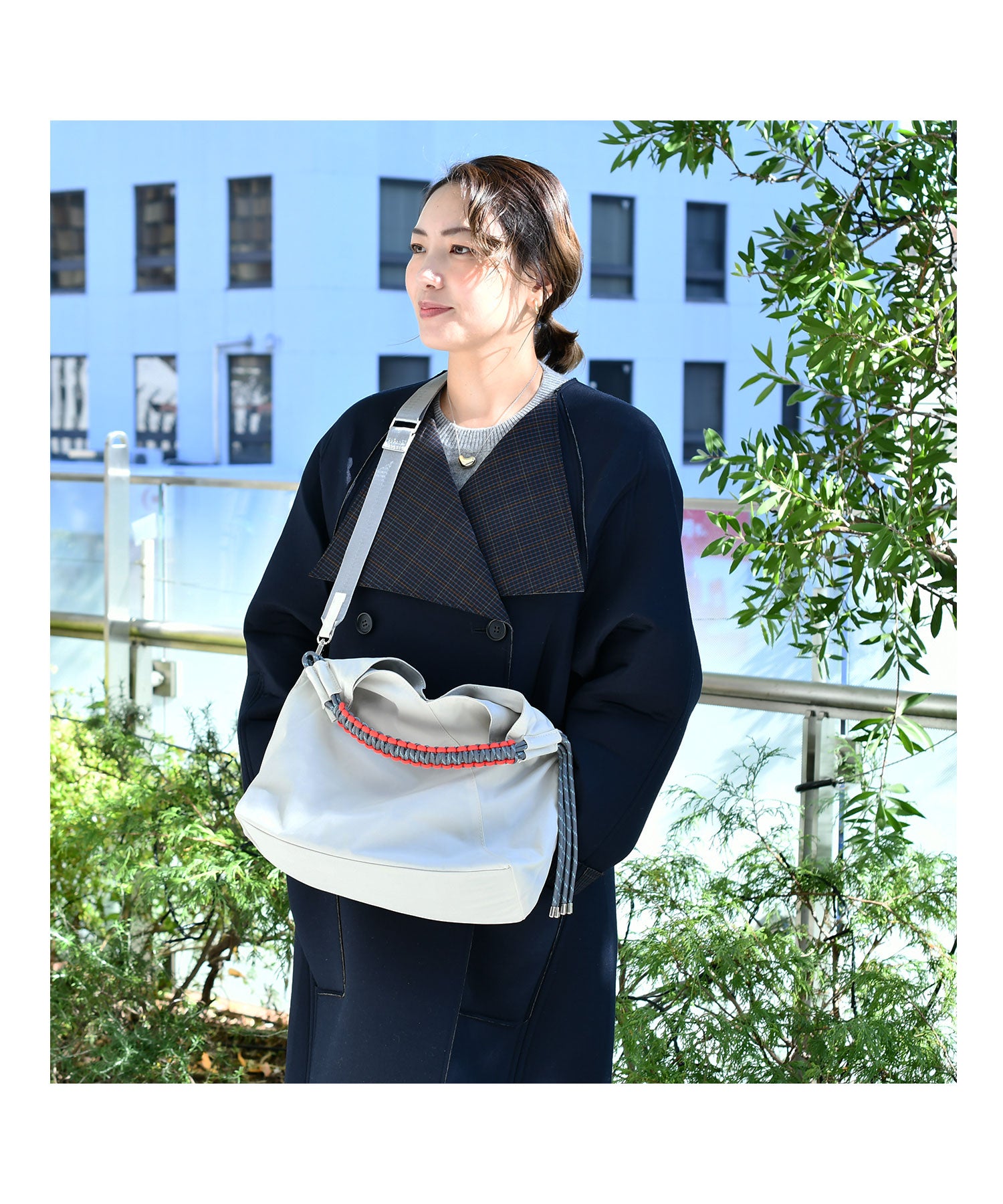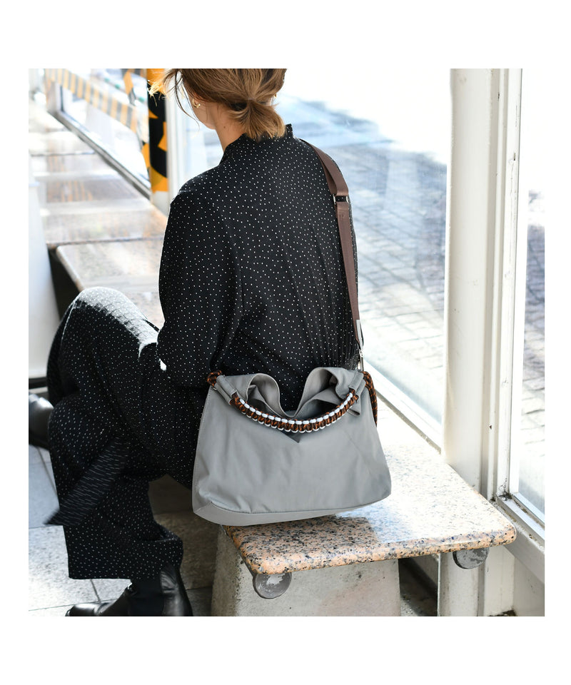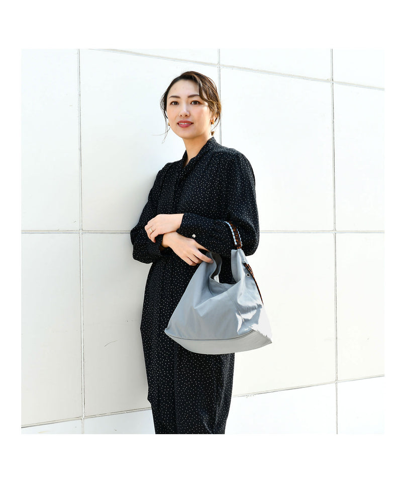 ベーシックなカラーがいつものコーデになじみつつ、カラフルなコードハンドルがアクセントに。しっかりとしたナイロン素材で、雨の日もさっと拭いて気兼ねなく使えるのが嬉しい。(非防水)