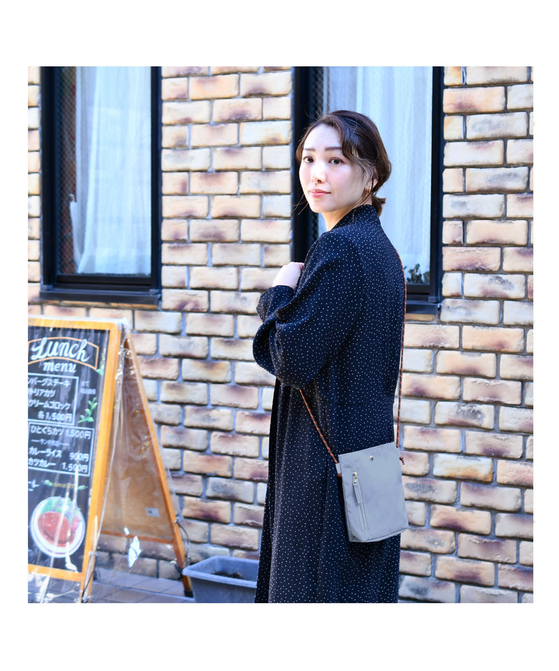 A5サイズ手帳や長財布、500mlペットボトルがはいるサイズです。サイドには、スマートフォンやパスケースがさっと取り出せるファスナーポケット付き。