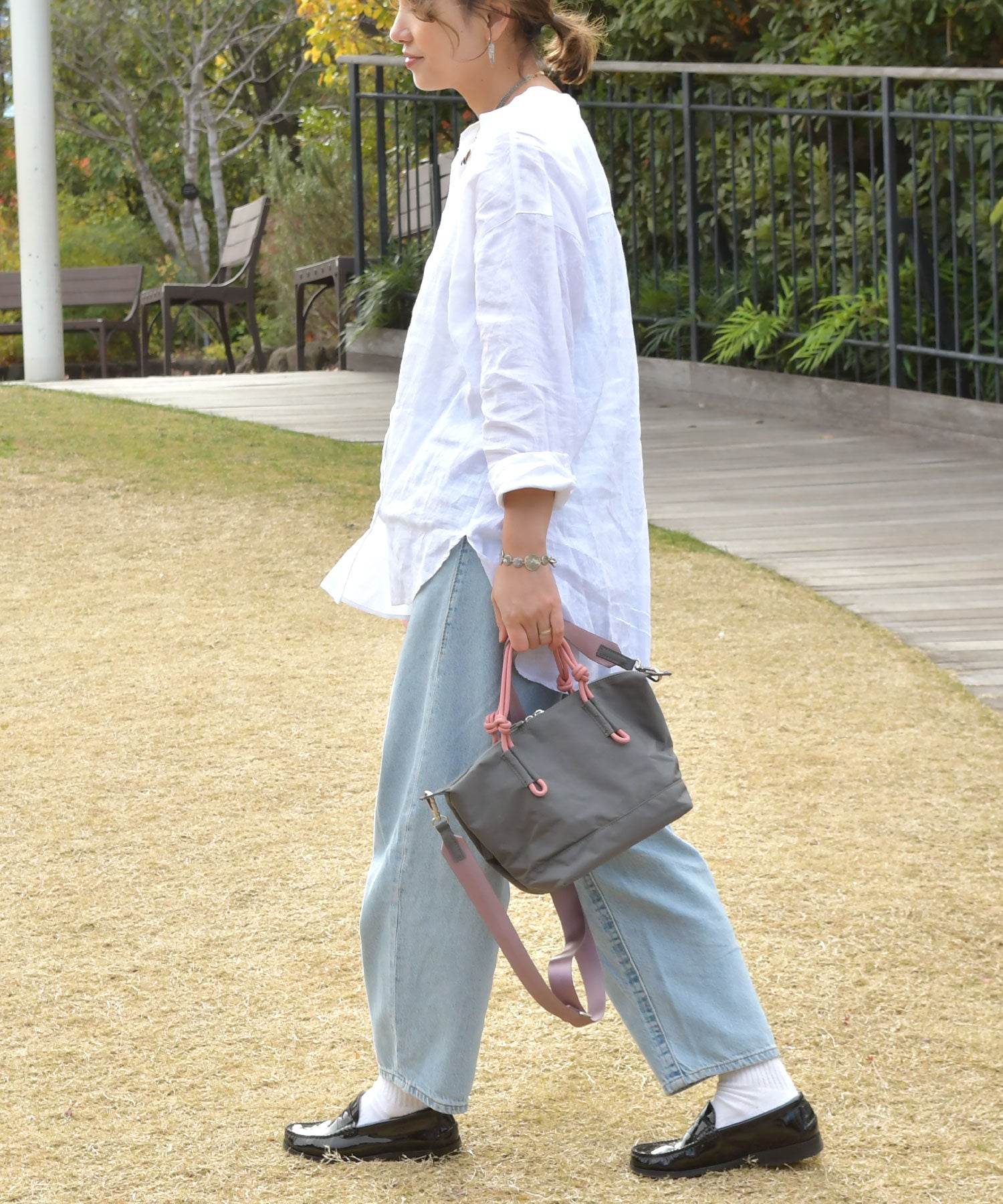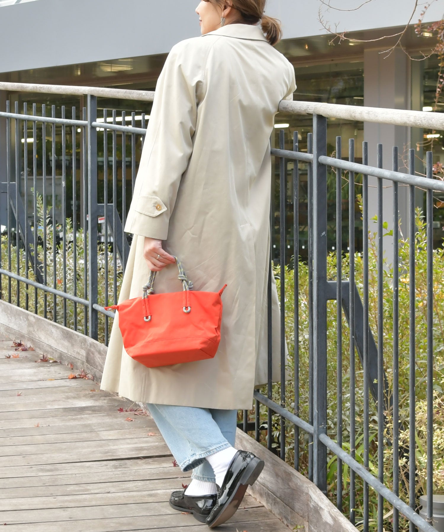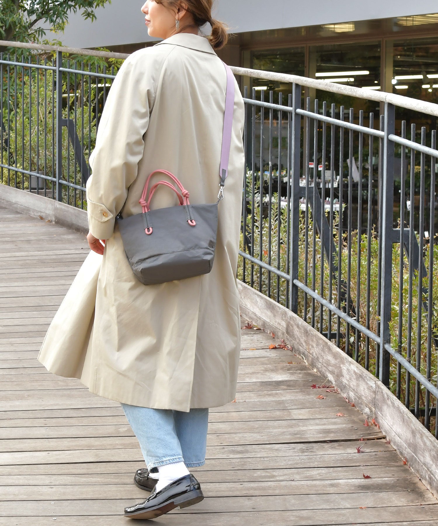 ハンドルとバッグの色あわせが楽しいミニトートバッグ。お買物や美容室、ランチなど、ちょうどいいサイズ感と、日常のお出かけに使いやすいナイロン素材がポイントです。