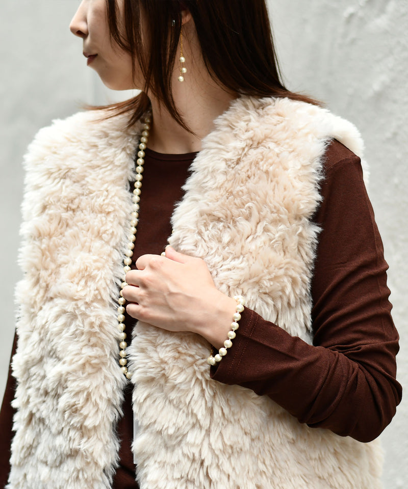 毛足が長くリアルファーのような存在感。ふわりとやわらかな着心地のニットベストです。パンツ、スカート、ワンピースなどスタイルを選ばず、軽めなアウターとのレイヤードもお任せ。肌寒い季節から長く着回していただけます。便利なポケット付き。