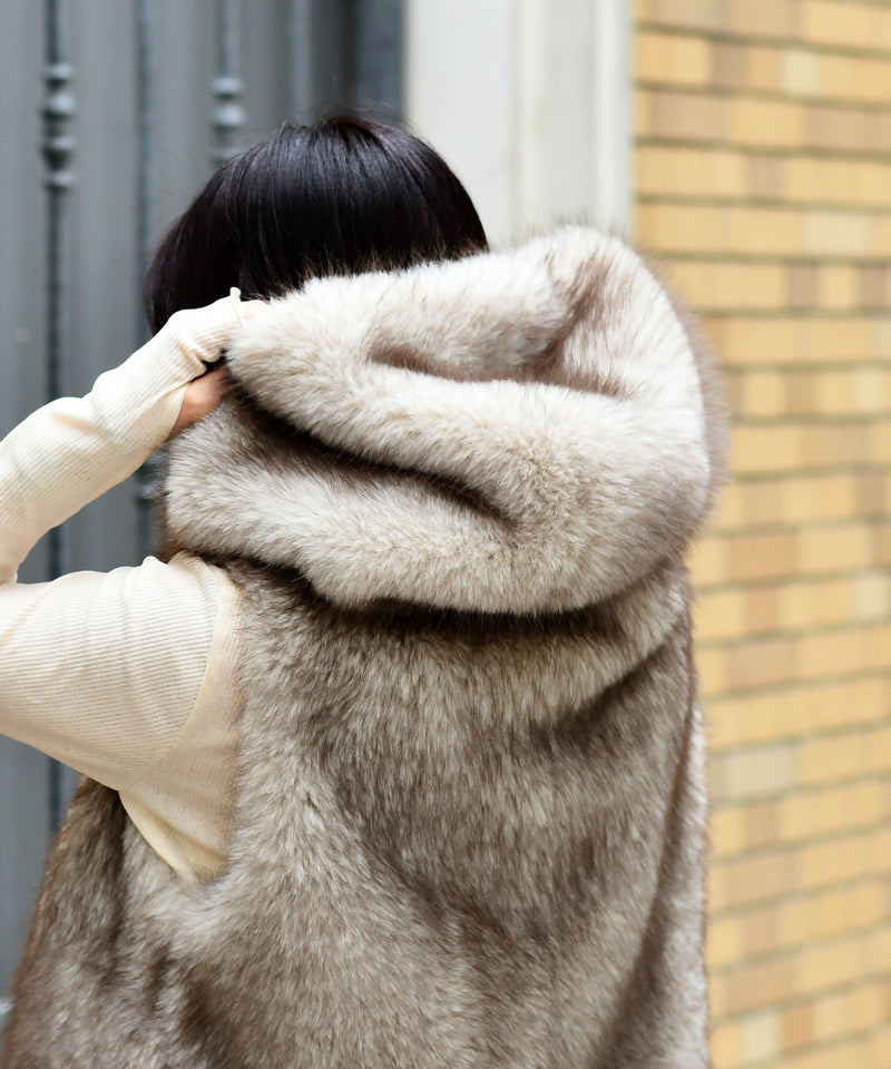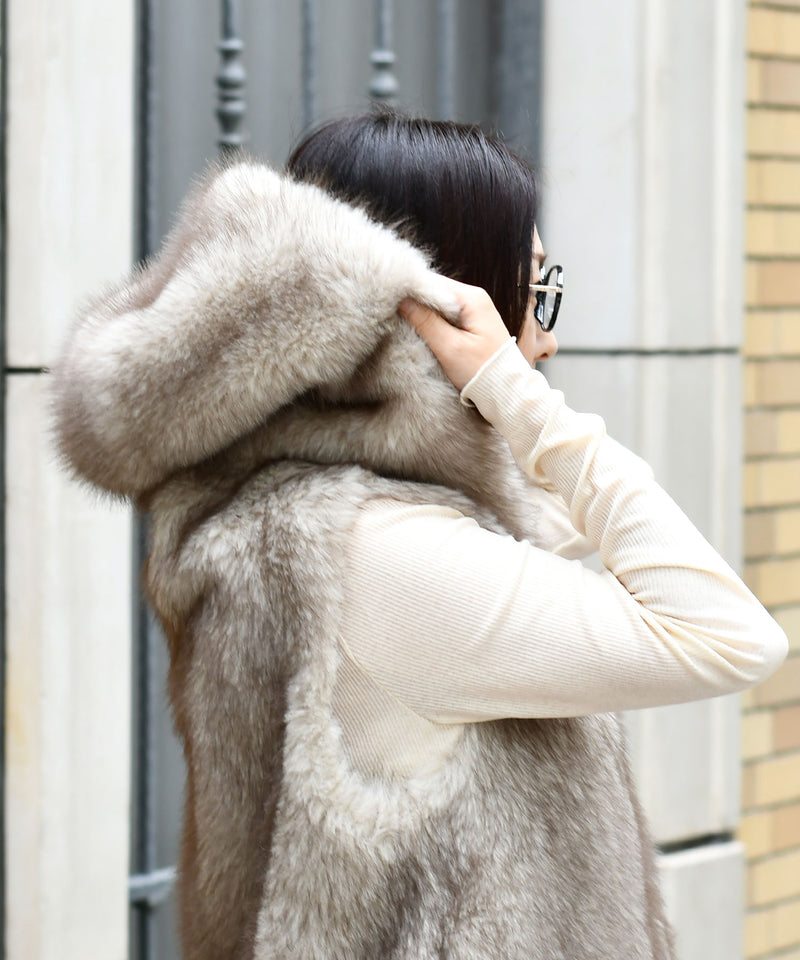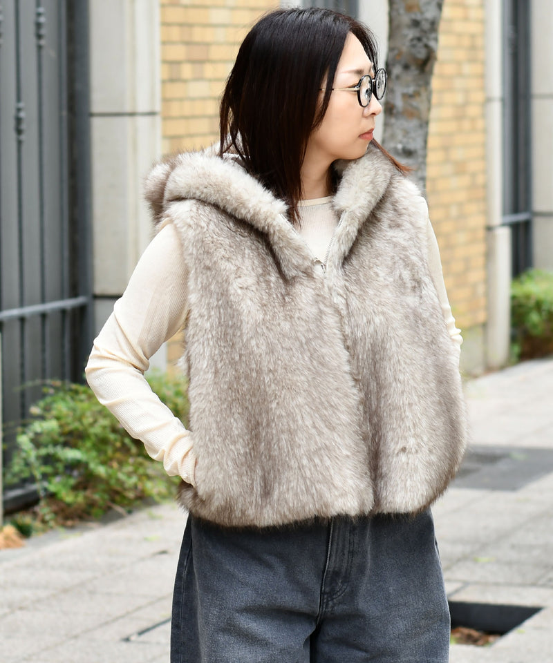 程よいボリューム感が魅力的なフードに、開き具合も調節できるファスナー仕様。コンパクトなキュートさと上質さを両立させるフード付きファスナーベストは、トータルバランスが自慢の一品、スタイリングの鮮度を高めます。ポケット付き。