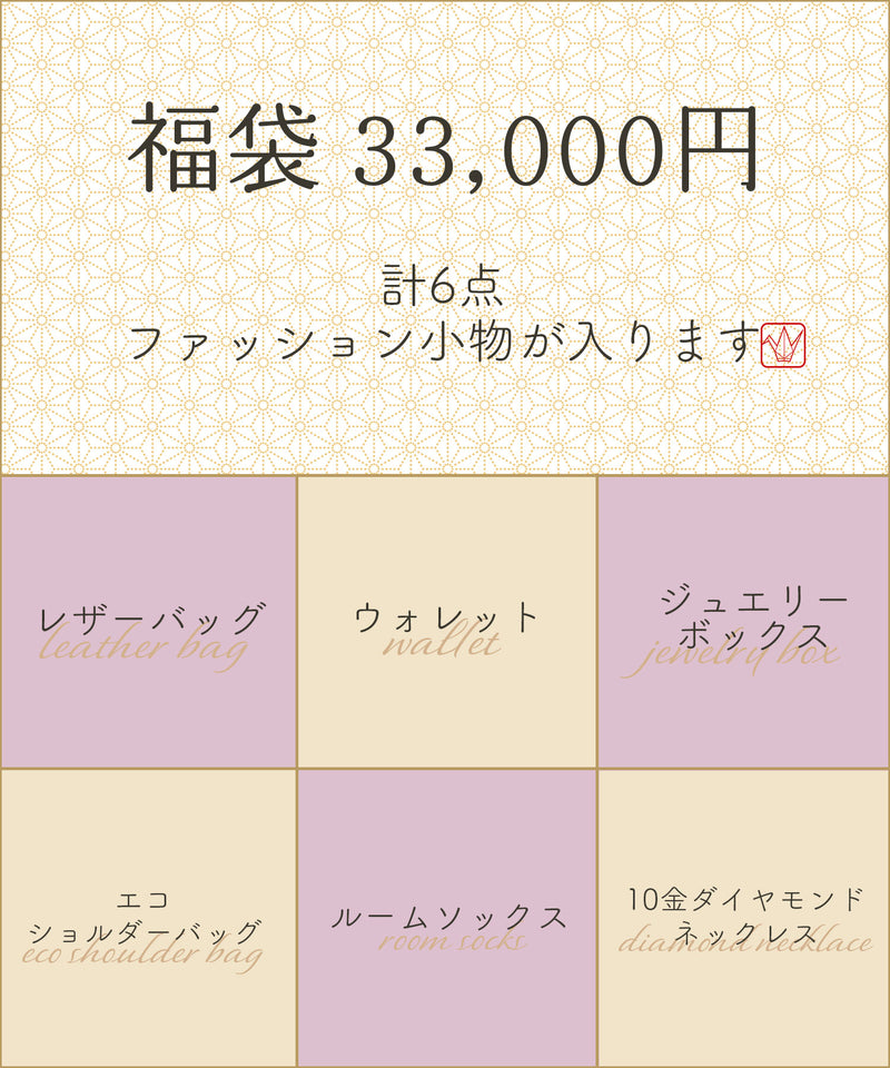 新たな歳を祝う豪華な福袋をご用意しました!気になる中身は、バッグやお財布、ジュエリーボックスなど、福袋でしか手に入らないオリジナルアイテムも入った素敵なファッション小物福袋です。