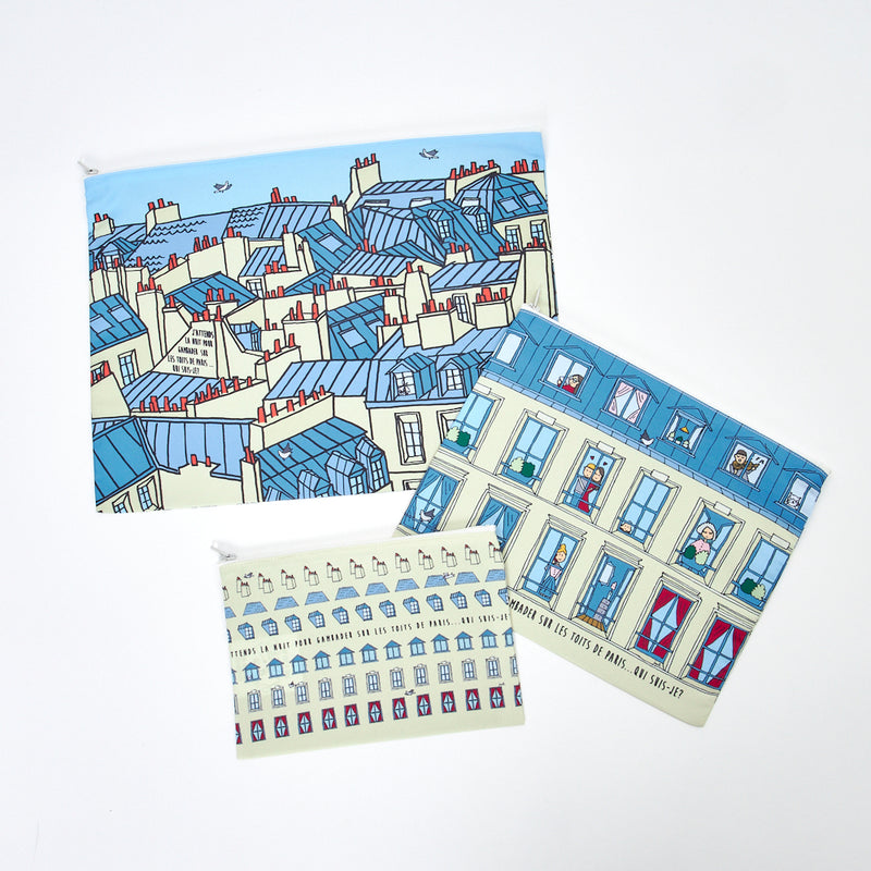 薄手で軽く、さらりとした撥水性ポリステル素材のポーチセット。シンプルなつくりなので文房具、化粧品、仕事道具、おもちゃ、ジムや旅行など、なんでもごっそり入れられるお片付け袋のようなフラットポーチです。