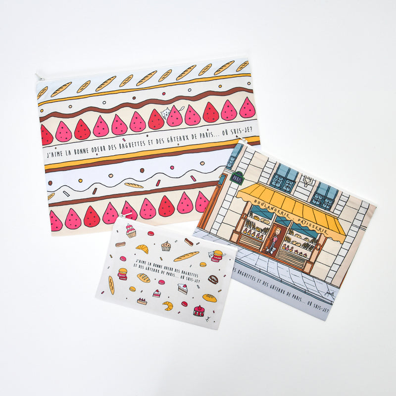 薄手で軽く、さらりとした撥水性ポリステル素材のポーチセット。シンプルなつくりなので文房具、化粧品、仕事道具、おもちゃ、ジムや旅行など、なんでもごっそり入れられるお片付け袋のようなフラットポーチです。