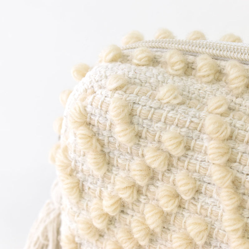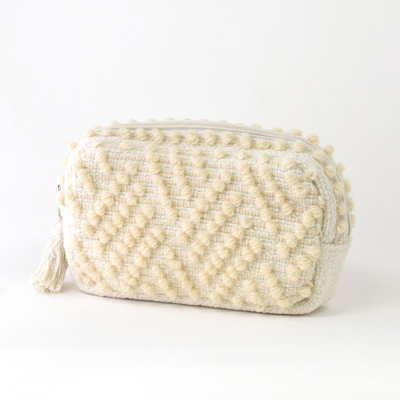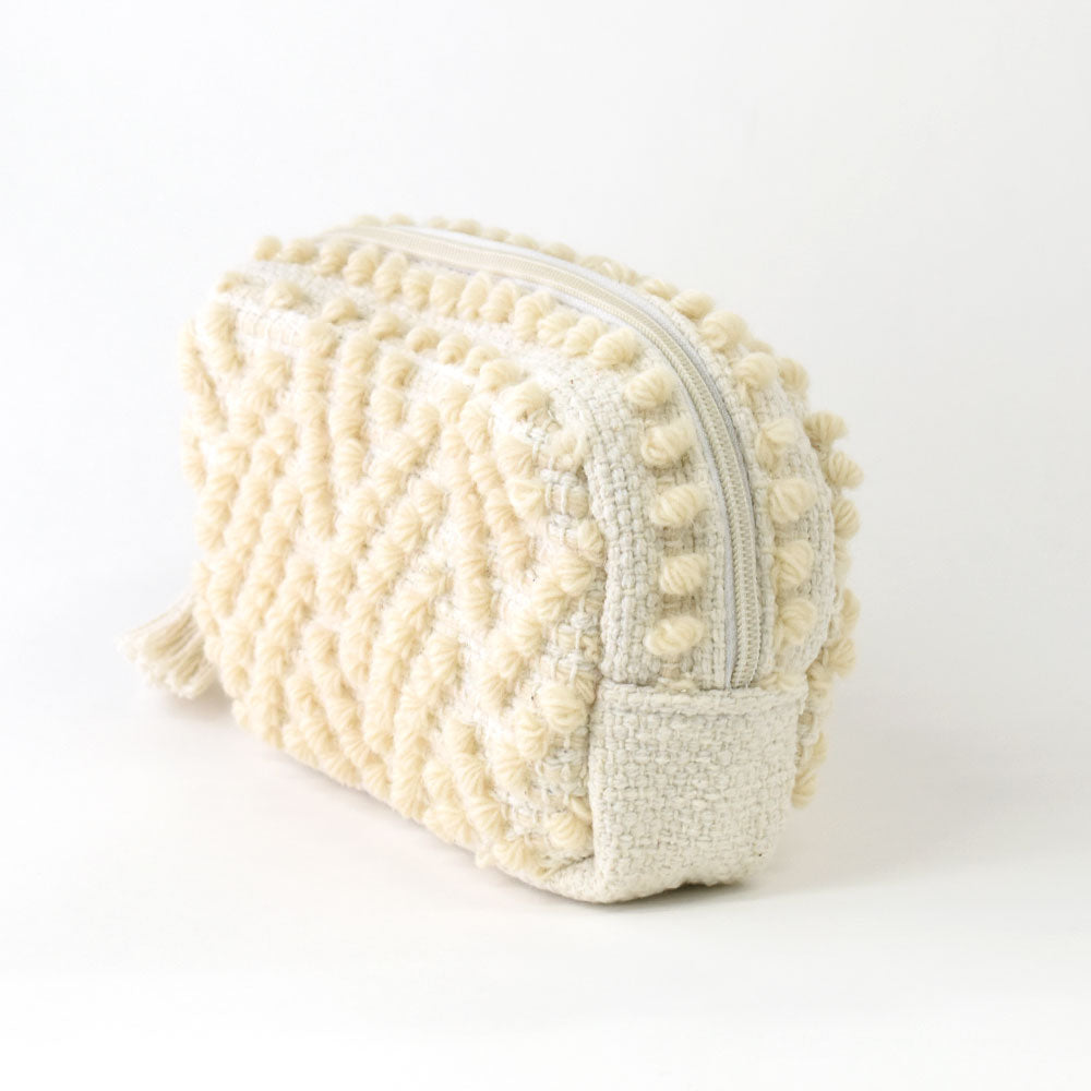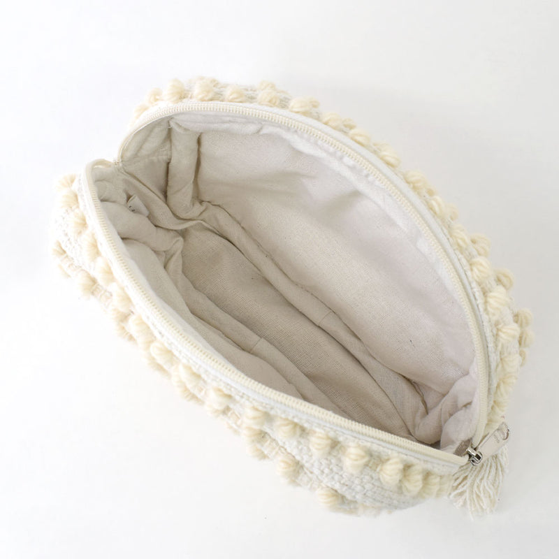 ふわふわの玉飾りが可愛いポーチ。横長サイズは収納力があり、コスメだけでなく、ステーショナリーやガジェットポーチにもおすすめです。