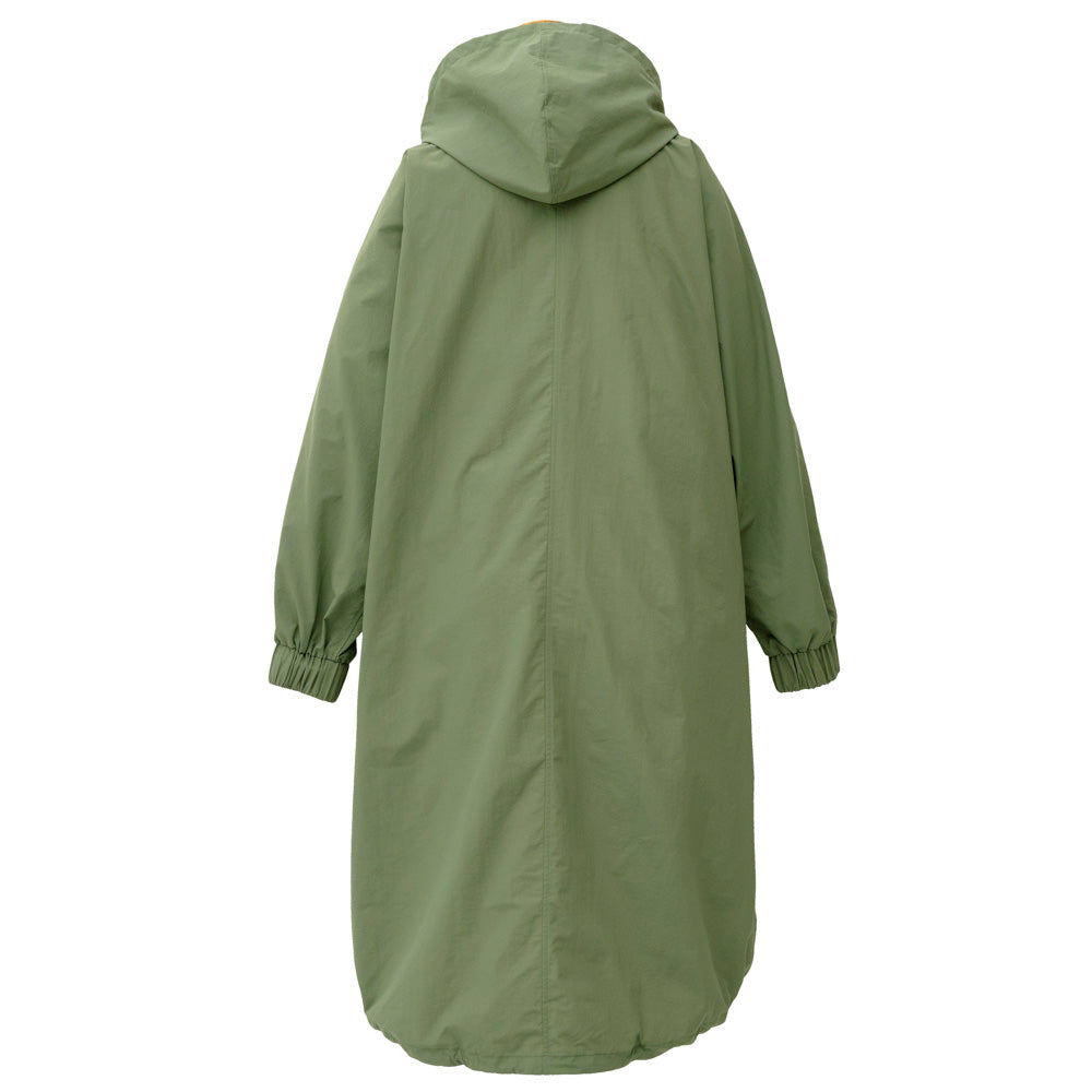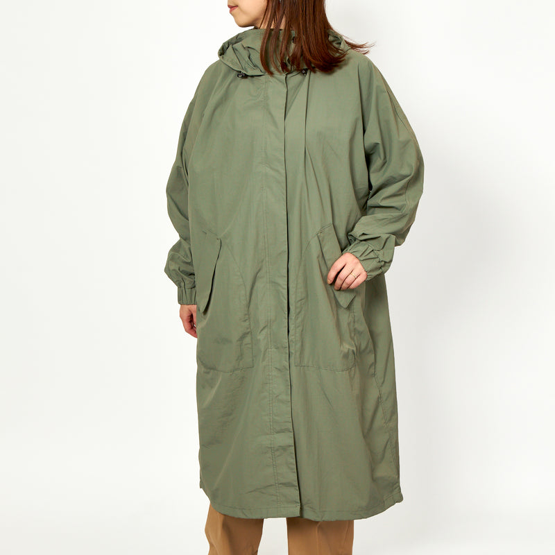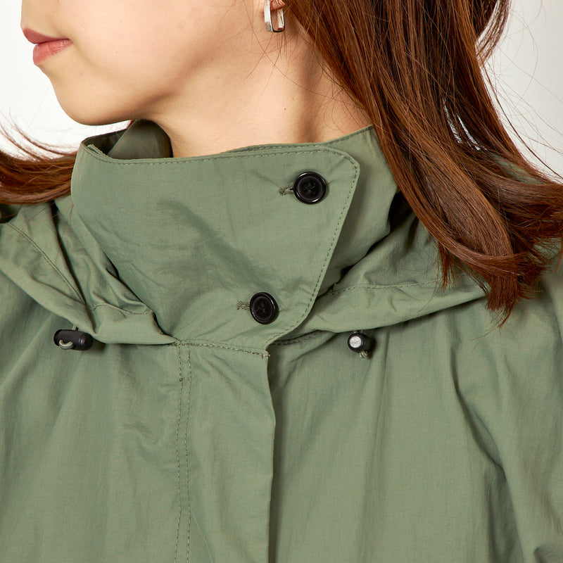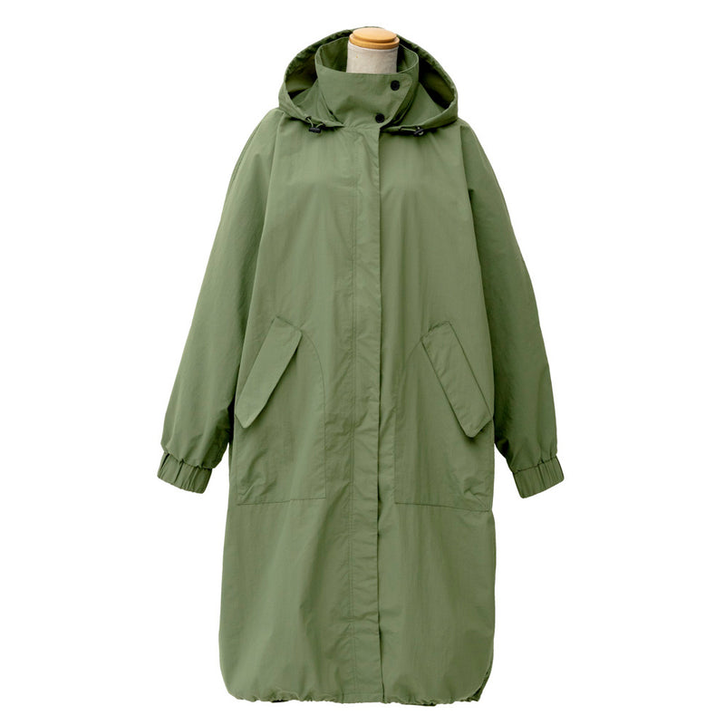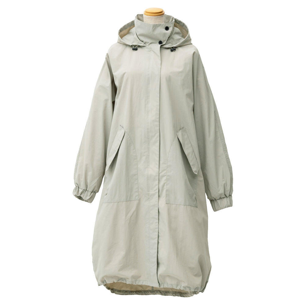 ゆったりとしたシルエットにフード付きがうれしいレインコート。