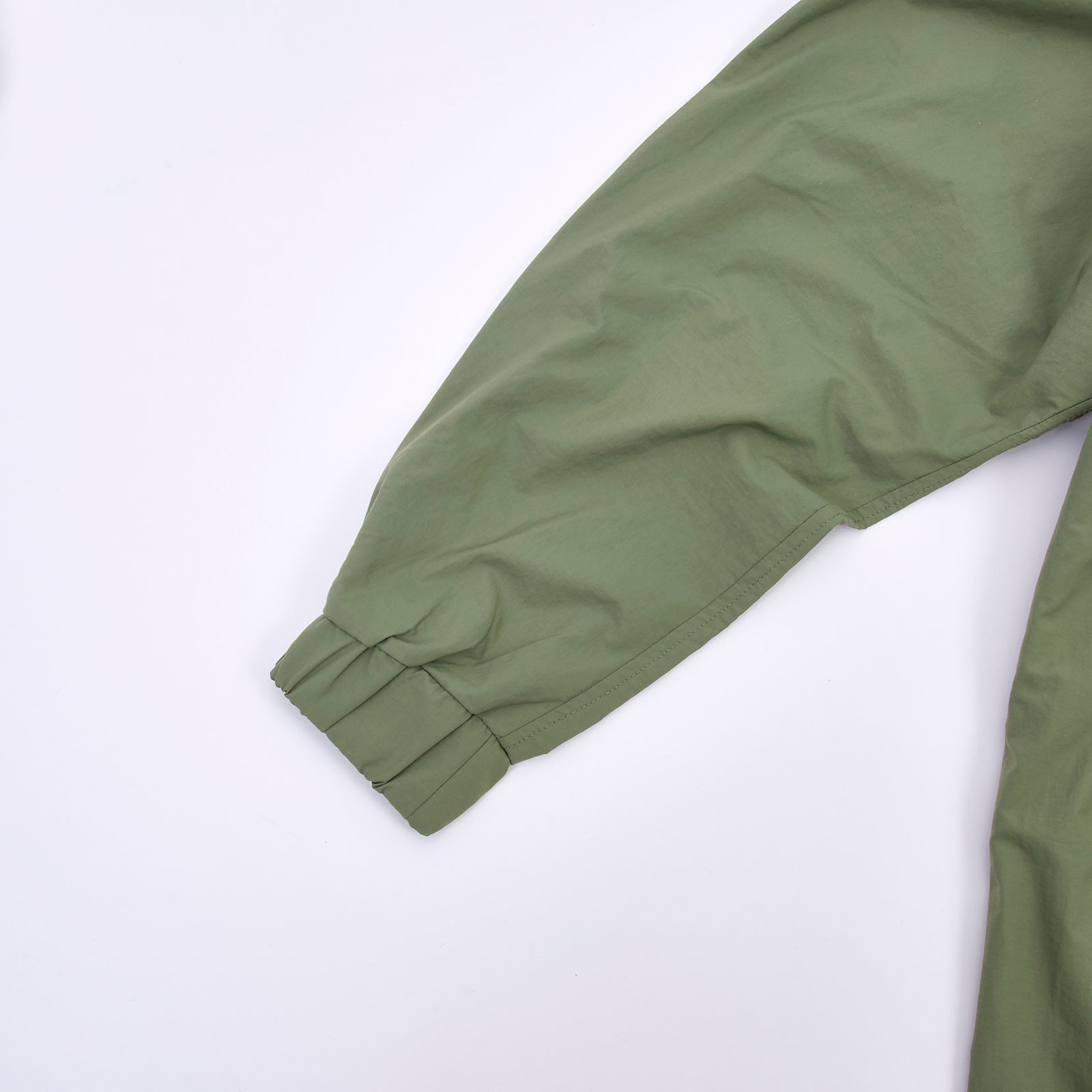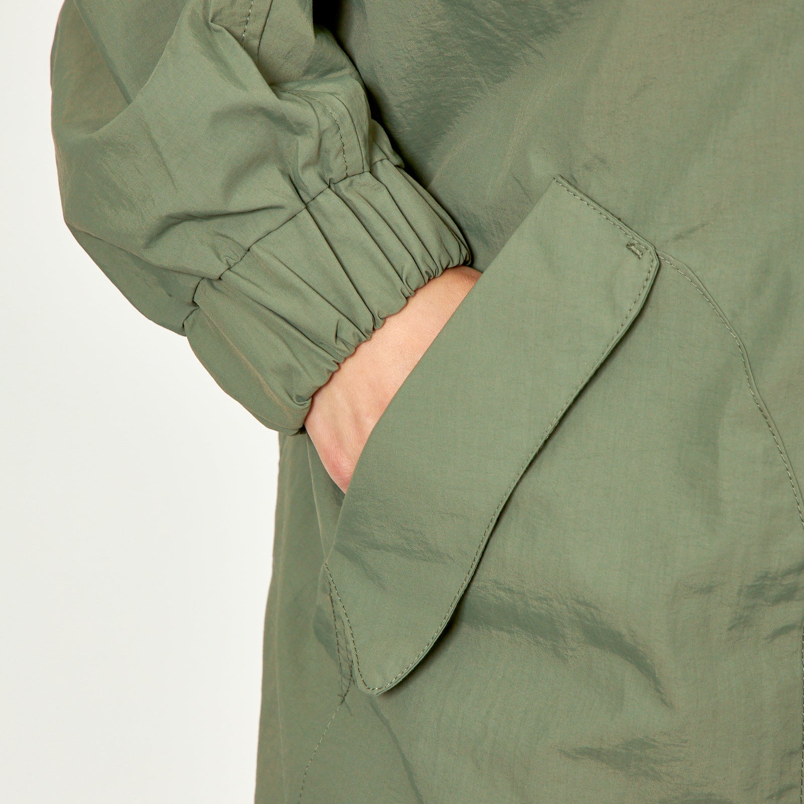 ゴムの袖口が雨の侵入を防ぎ、裾はゴム紐ですぼめれば風でめくれるのを防ぎます。