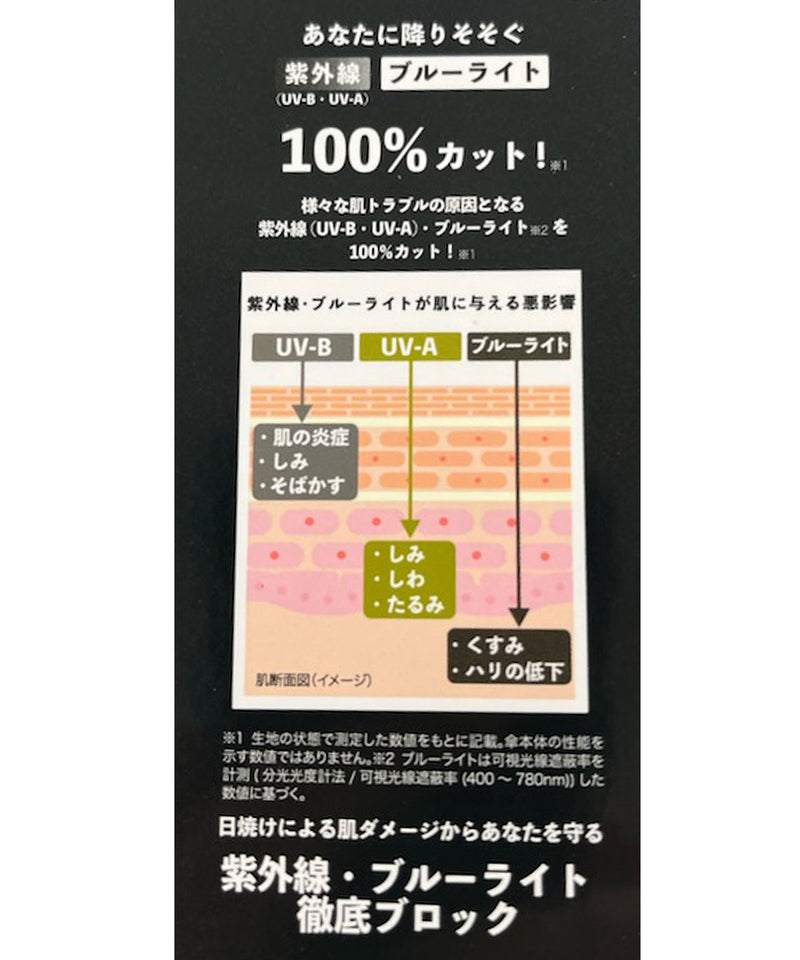傘内側の黒コーティングが照り返された紫外線、ブルーライトを9割吸収。傘の内側で起こる反射を大幅に減らし、肌にダメージを与える有害光線から守ります。
