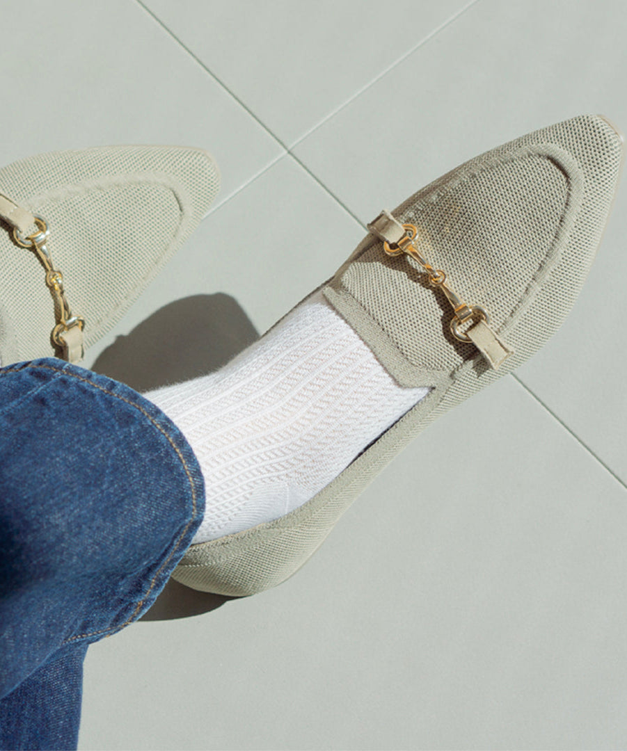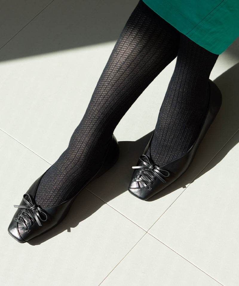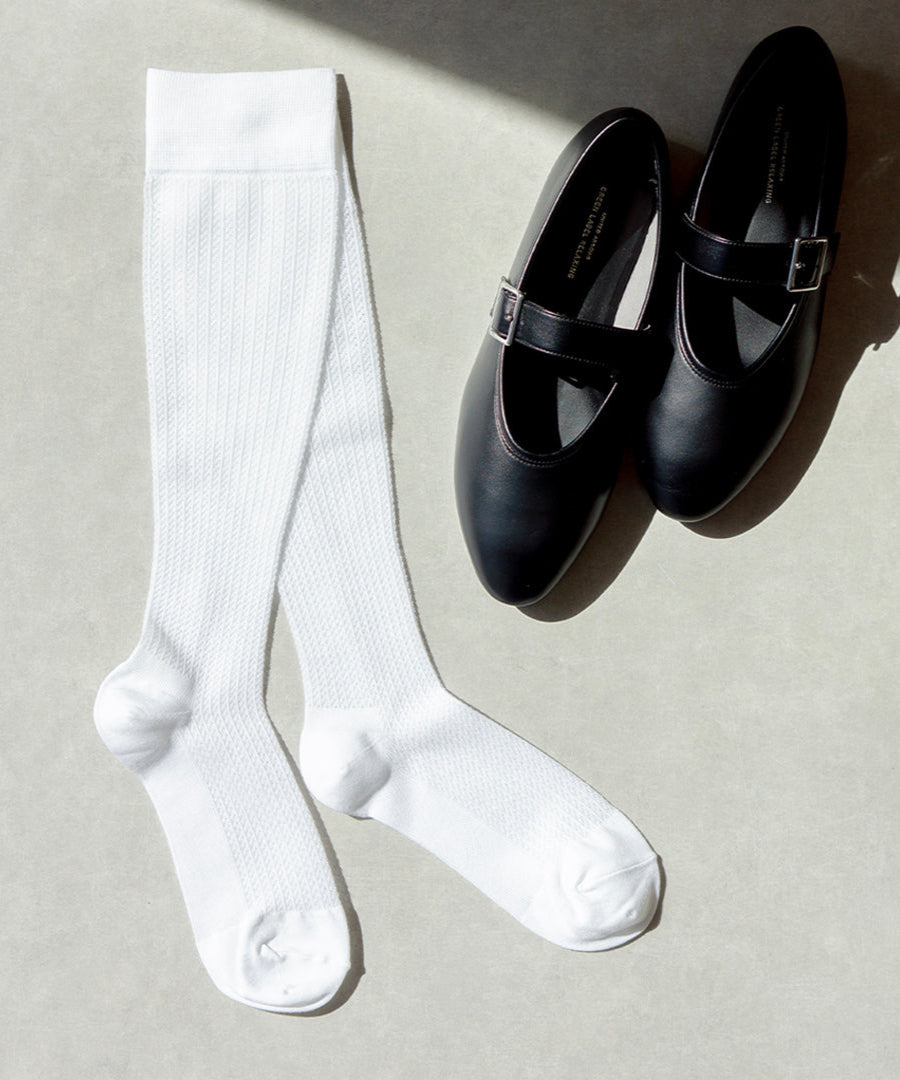 透明な糸を使用したメッシュ編みでサラっとした風合いに仕上げ、見た目も履き心地も爽やか。脚のラインを美しく魅せるストライプ調のデザインも魅力です。履き口はガーゼのようにソフトな肌あたりの編地に切り替えることで、履き心地の良さもこだわりました。