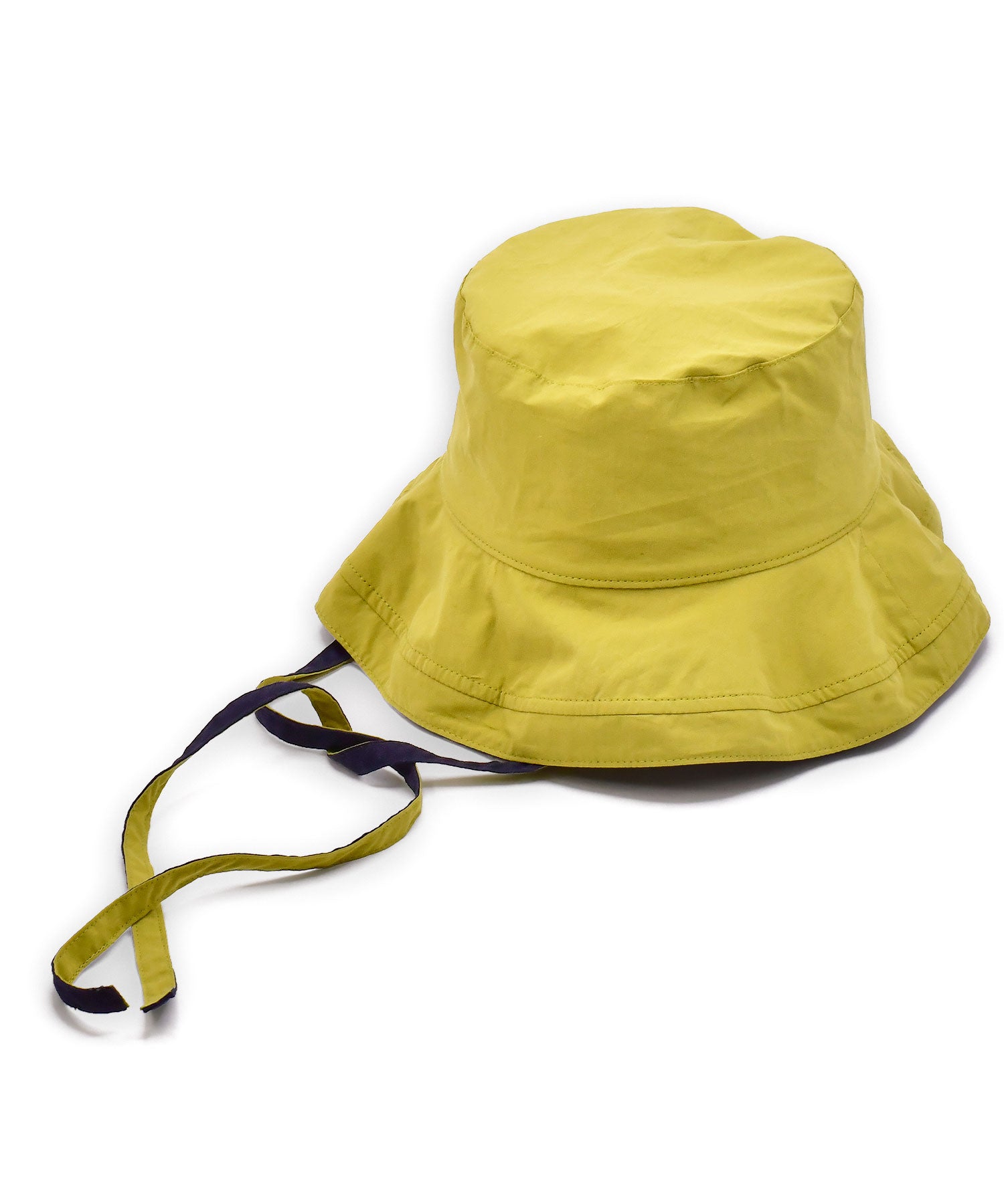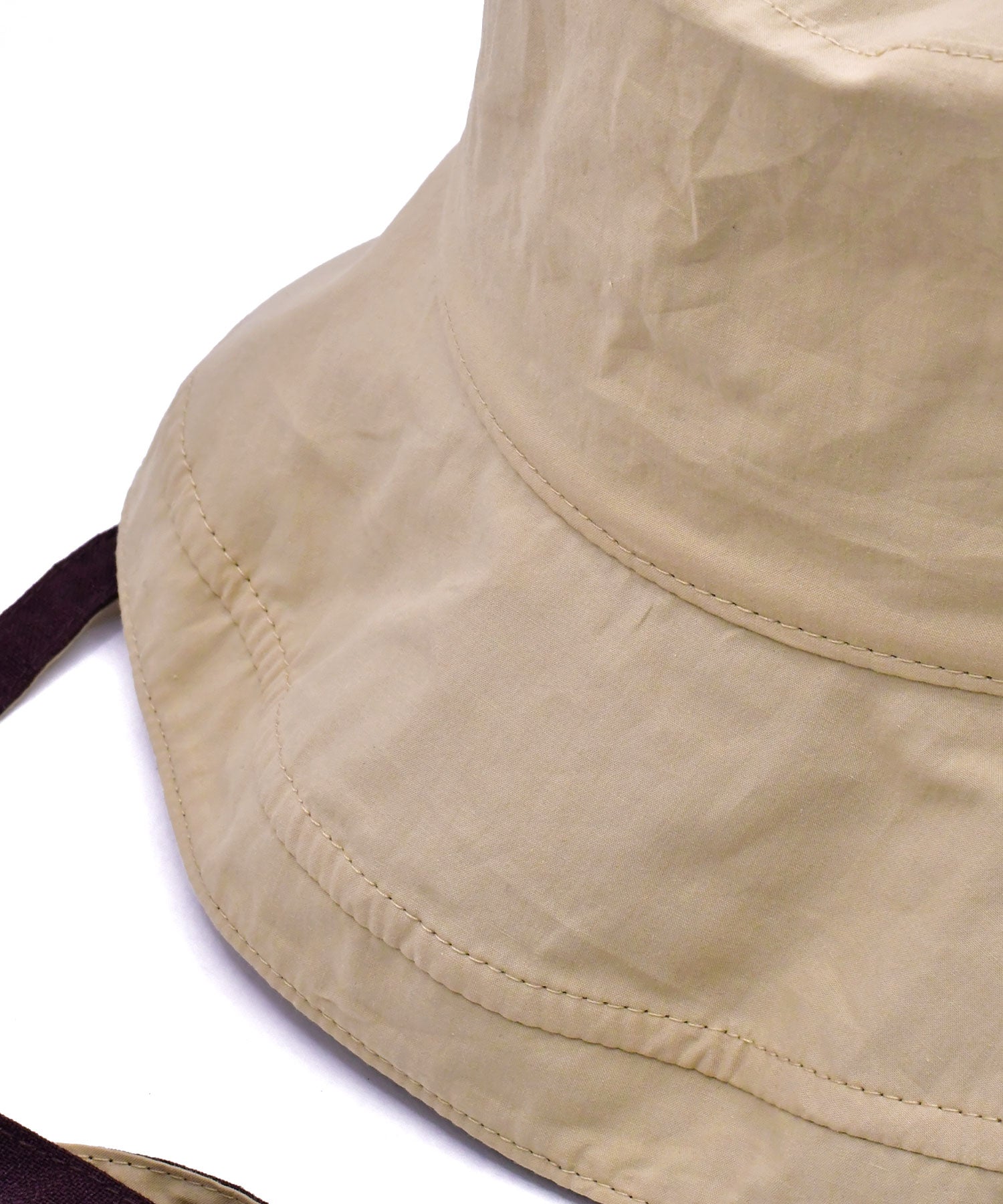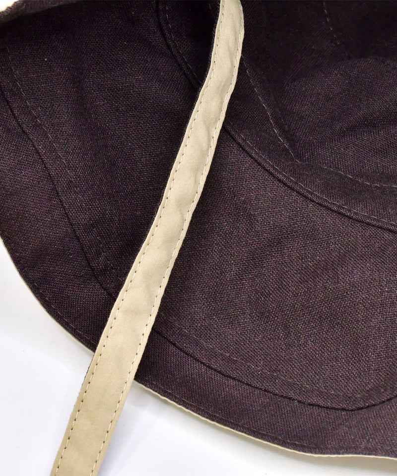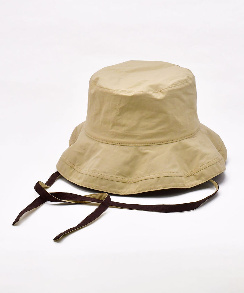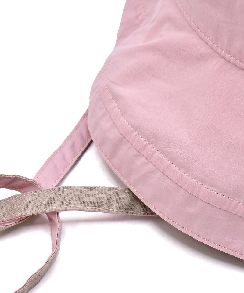 つばが広区、目深にかぶることのできるハット。紐付きなのでアウトドアやバーベキューなどアクティブな日のスタイルにもおすすめです。