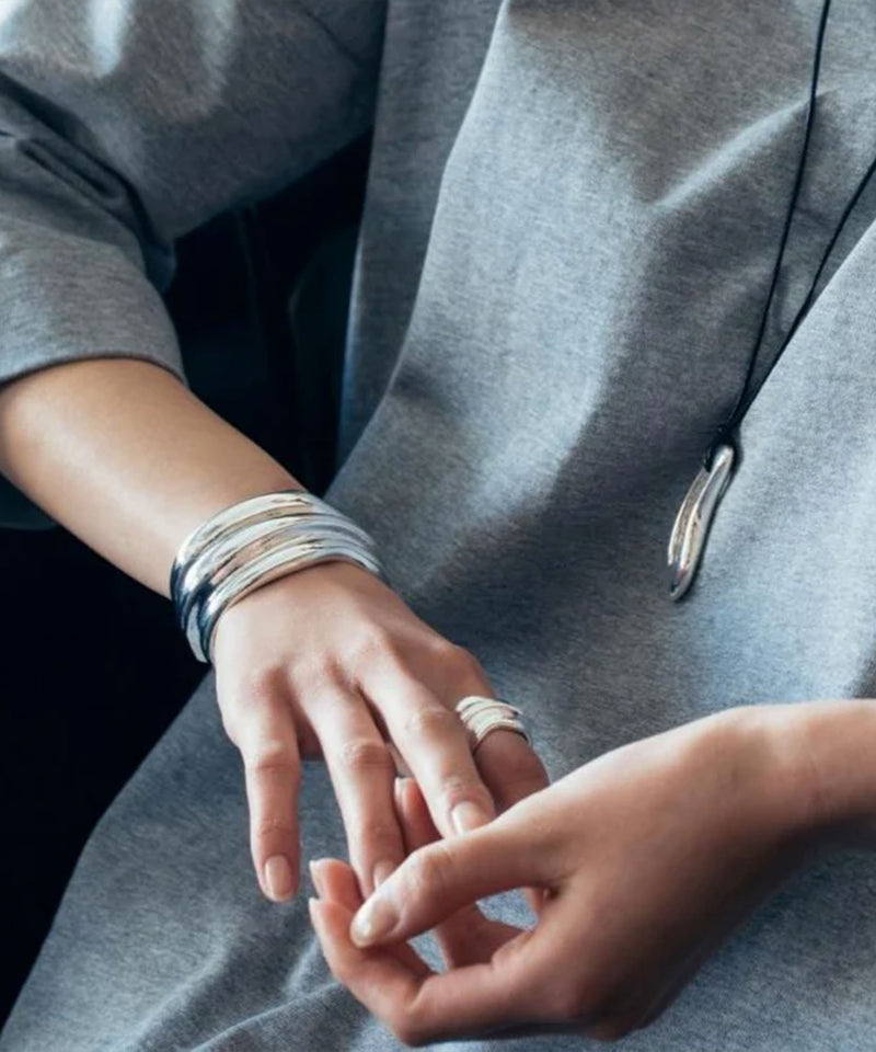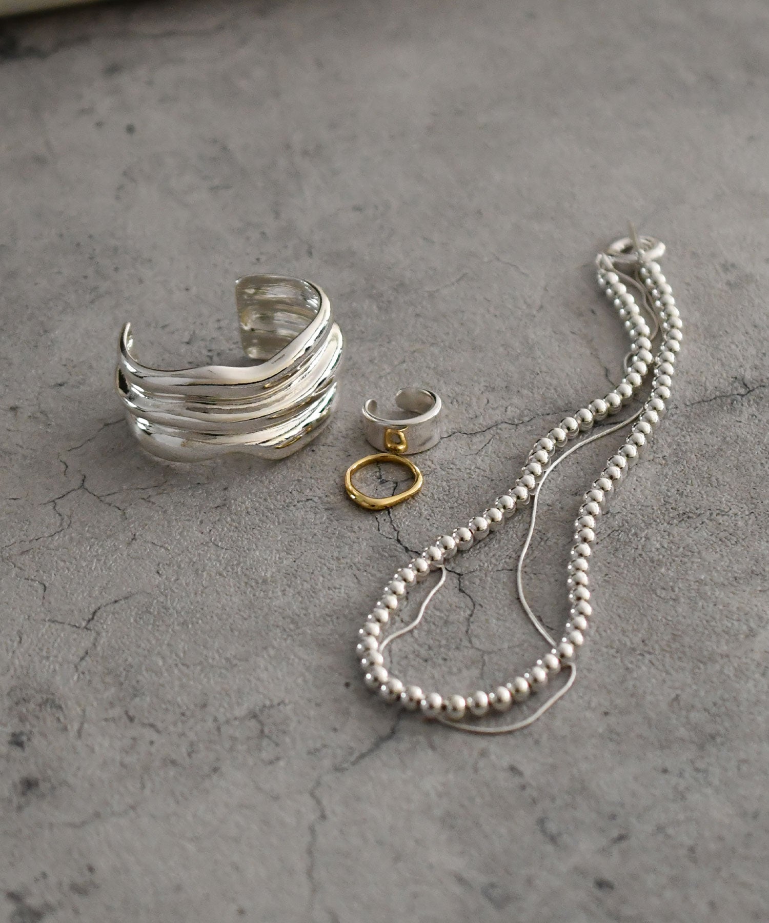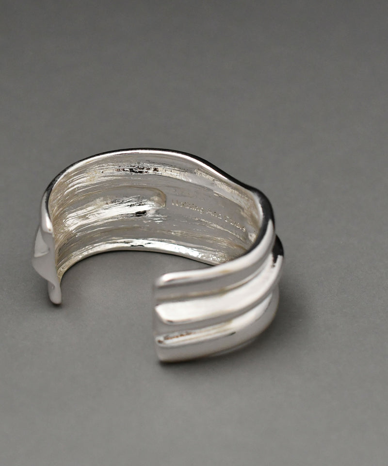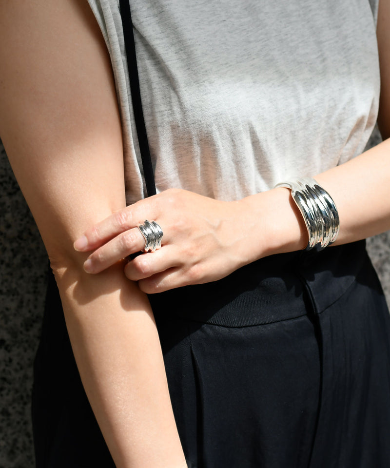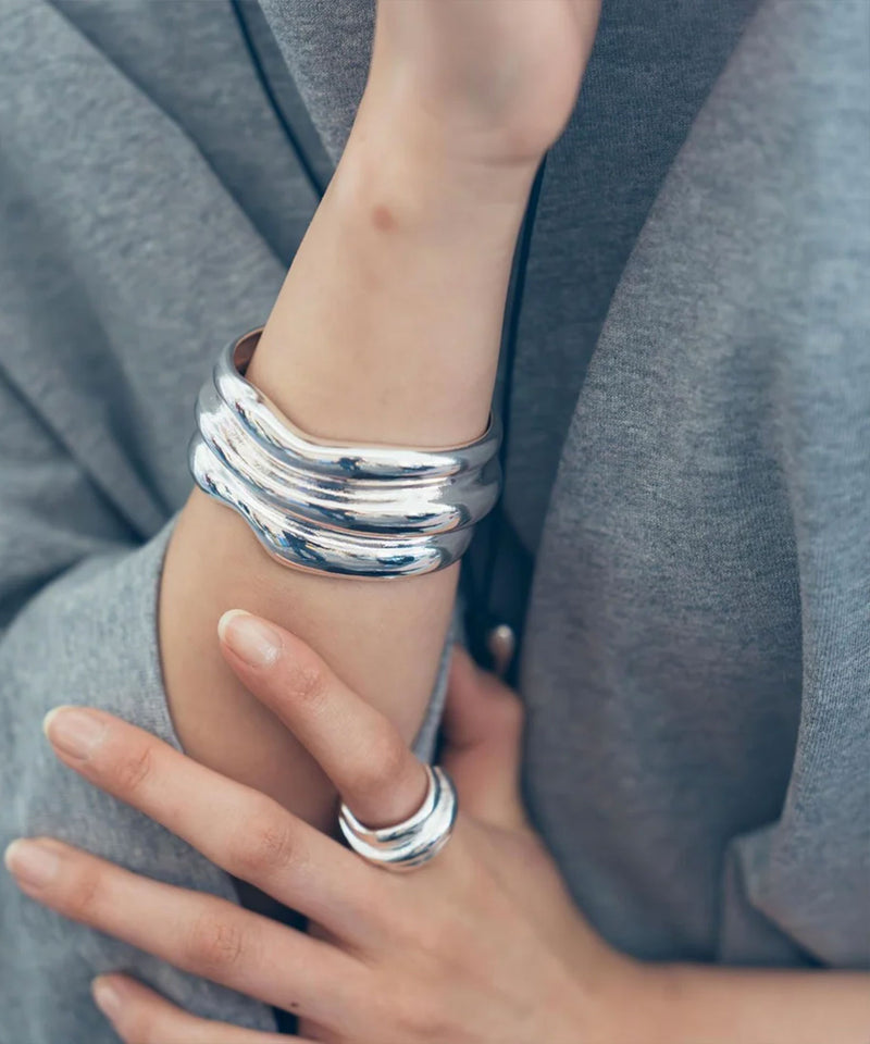 アシンメトリーにウェーブしたデザインは、手元のコーディネートのポイントに。同じデザインのリングと揃えても。