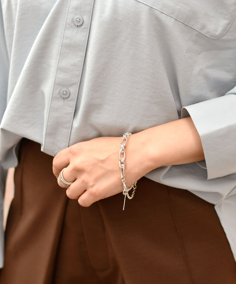 異なる2種類のチェーンをあわせた、表情豊かなブレスレット。程よいボリューム感で、手元にさりげなく存在感をプラスします。重ねた華奢なチェーンが、動くたびに上品な揺れを演出します。カジュアルにもモードにも映えるデザインでスタイリングのテイストを選ばずマルチに活躍します。