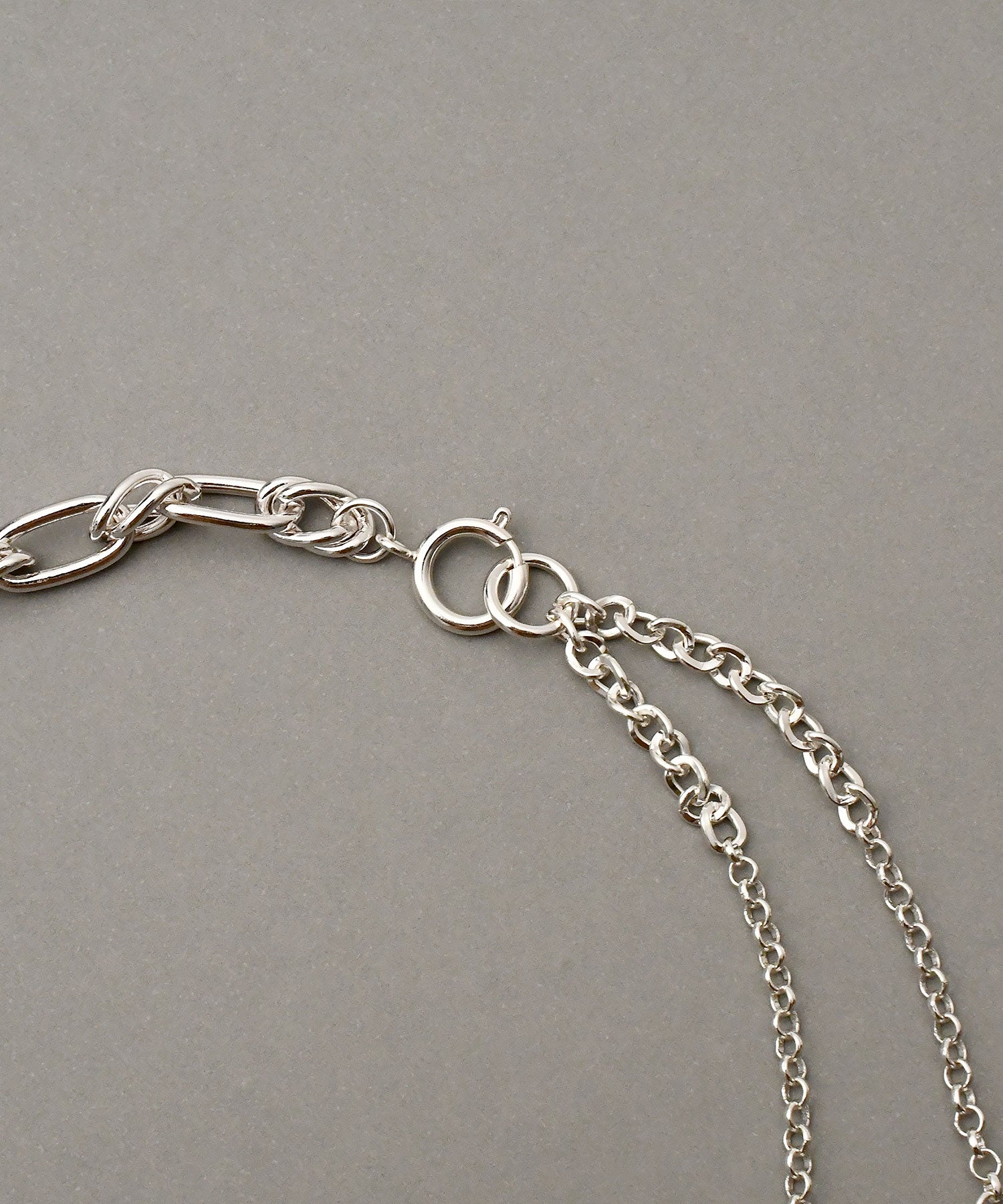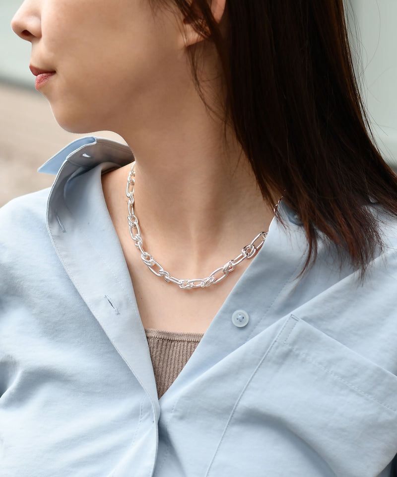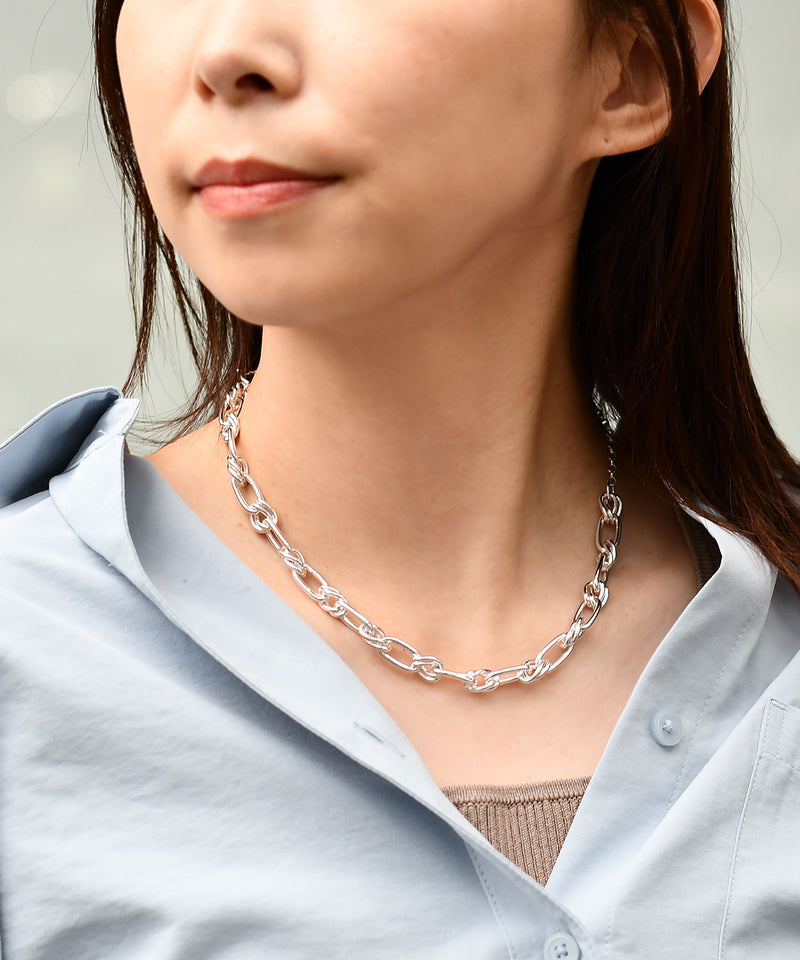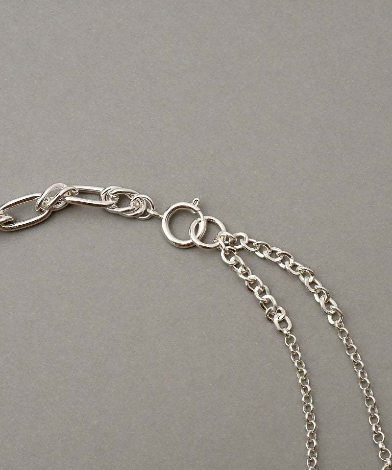 異なる2種類のチェーンをあわせたネックレス。太さの違いがさりげないコントラストを生み、首元に自然なアクセントをプラスします。ほどよいボリューム感で、シンプルなコーデに合わせるだけでこなれた印象に。ひとつ持っておくと、いつものスタイリングをぐっと引き締めてくれるアイテムです。