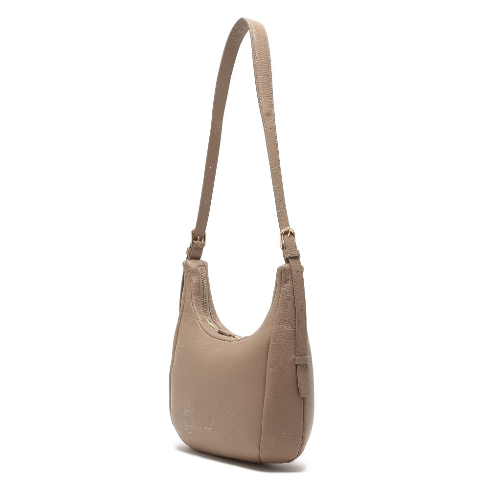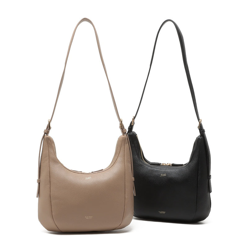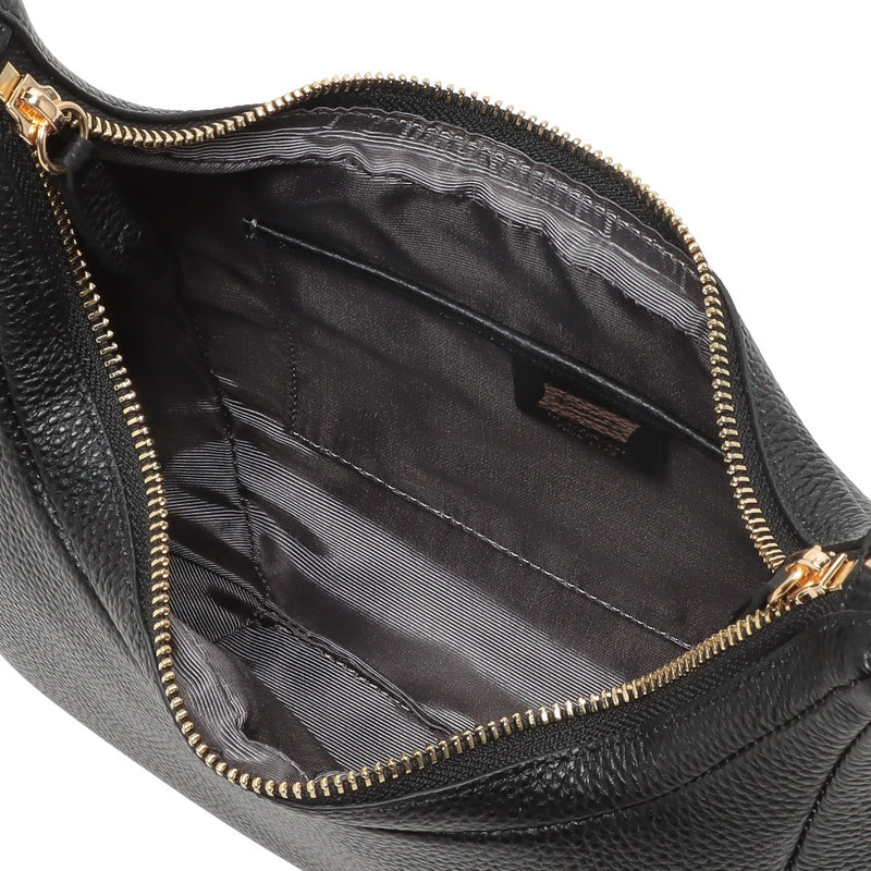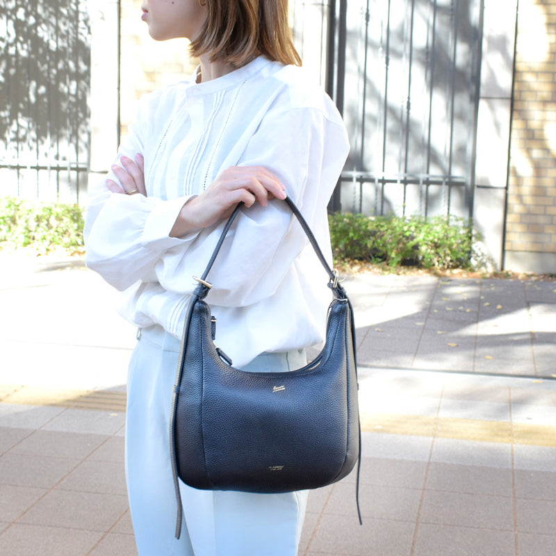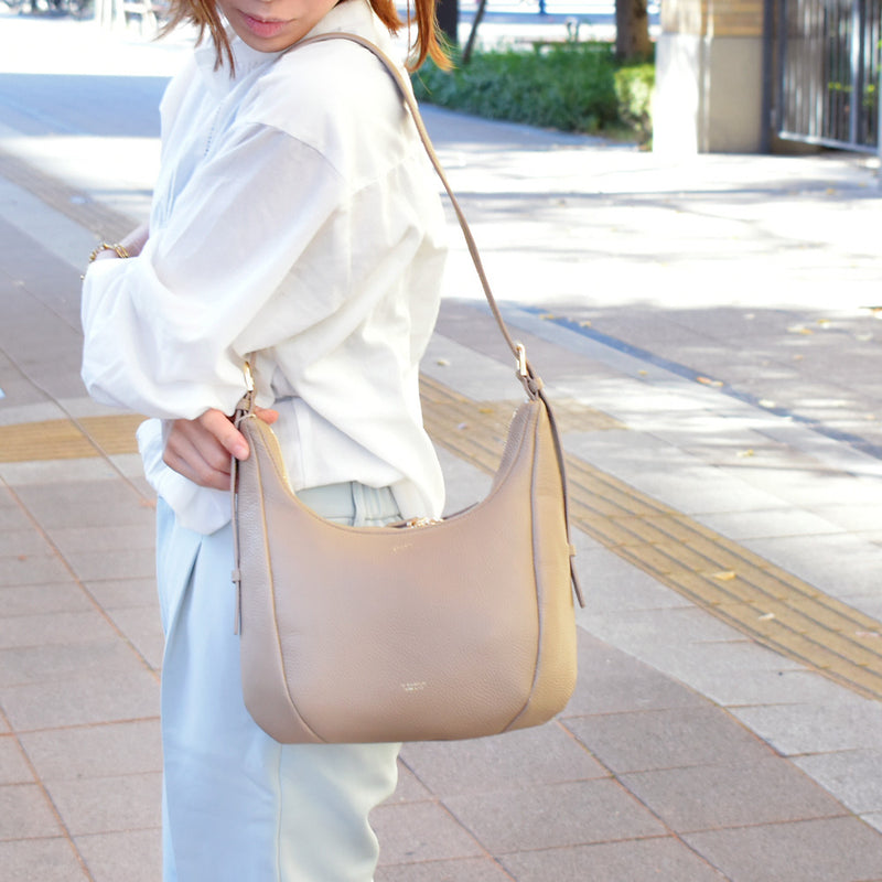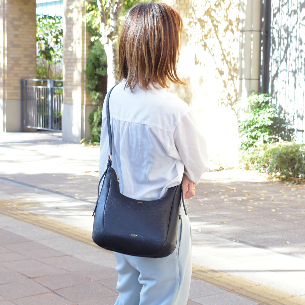 細かなシボが入った、しっとりとしたレザーが上品な艶感を醸し出すショルダーバッグ。