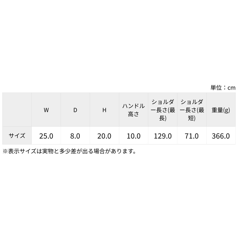 [サイズ]W 25.0 × D 8.0 × H 20.0 cm ハンドル高さ:10.0 cm ショルダー長さ(最長):129.0 cm ショルダー長さ(最短):71.0 cm