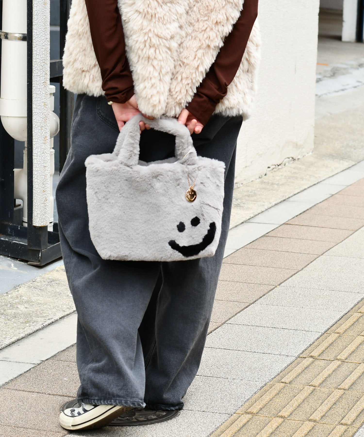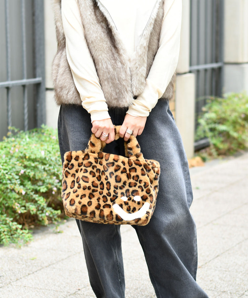 ふわふわのエコファー素材にスマイモチーフのアクセントがキュートなバッグ。