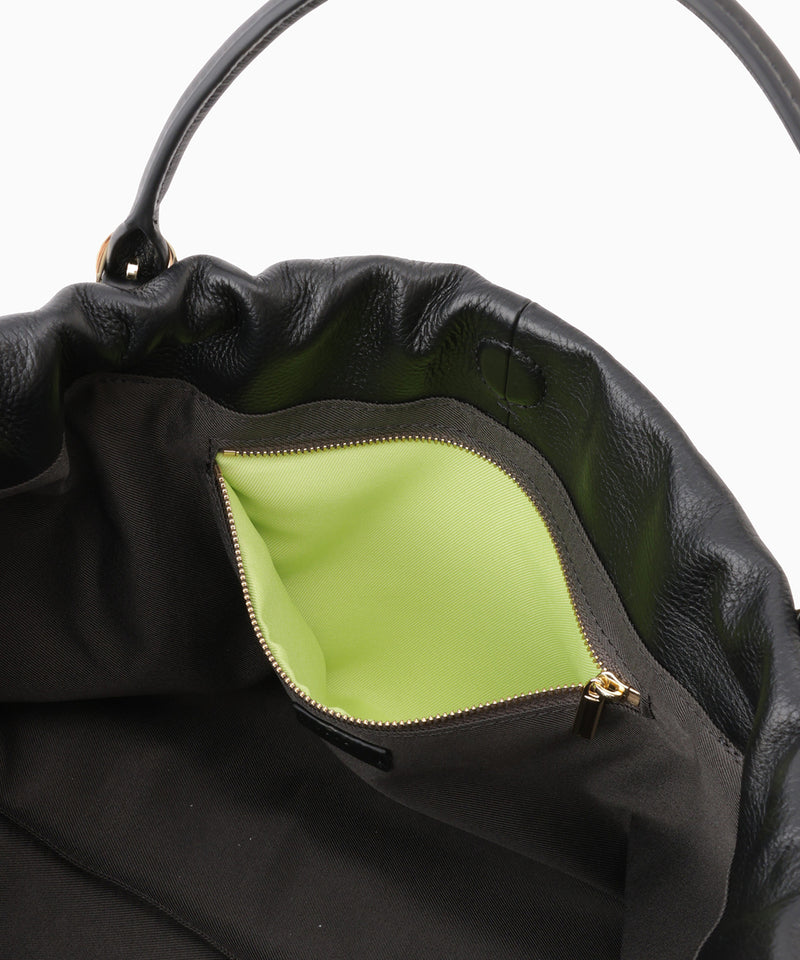 開口部にマグネットが付き、巾着を広げてスクエアフォルムにも。